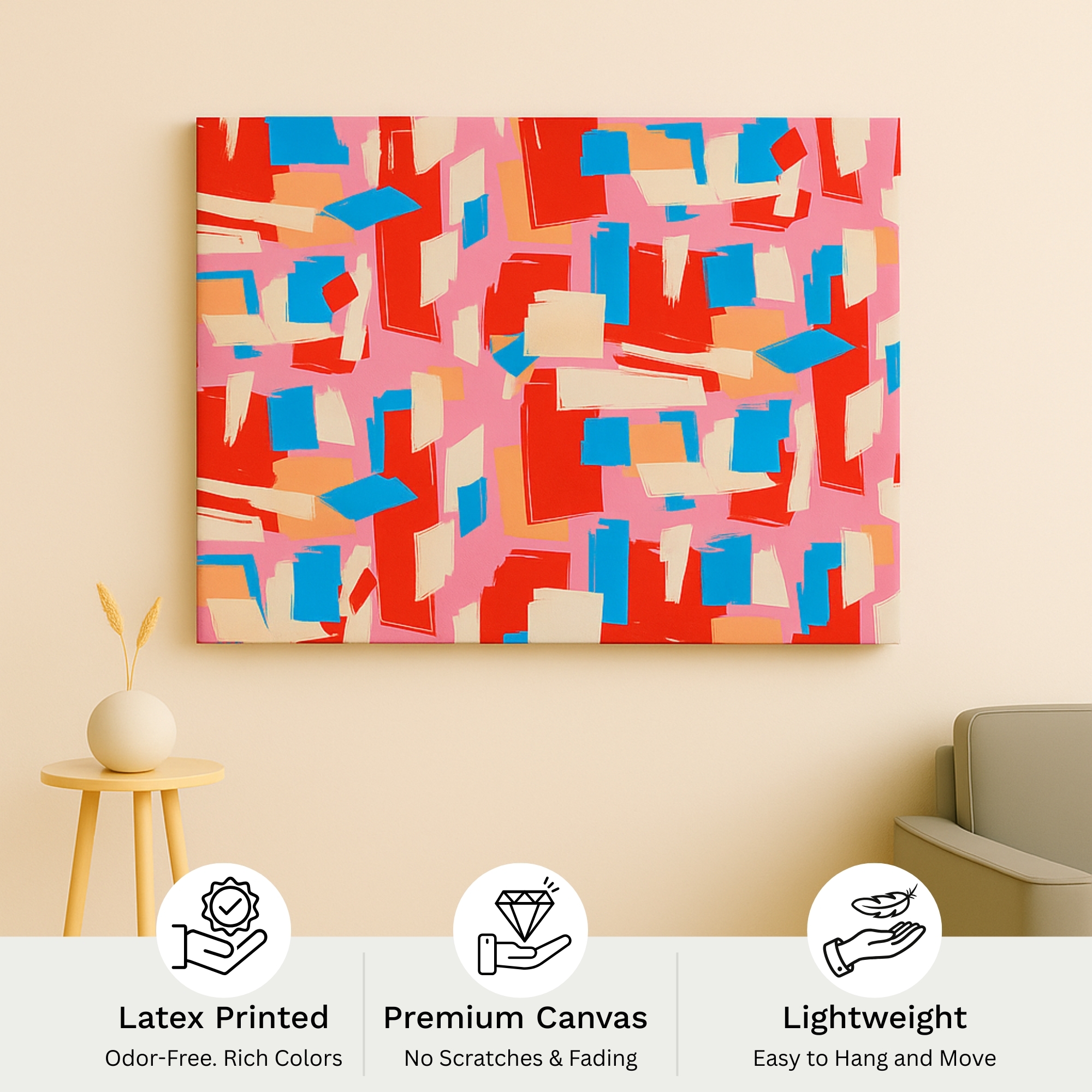 “The Abstract Tempo Canvas Print explodes with expressive color and rhythmic brushwork, creating a bold artistic statement ideal for modern interiors. Its dynamic mix of reds, blues, pinks, and soft neutrals energizes any living room, studio, office, or creative workspace. This canvas print brings life and movement while maintaining a refined gallery-quality finish.