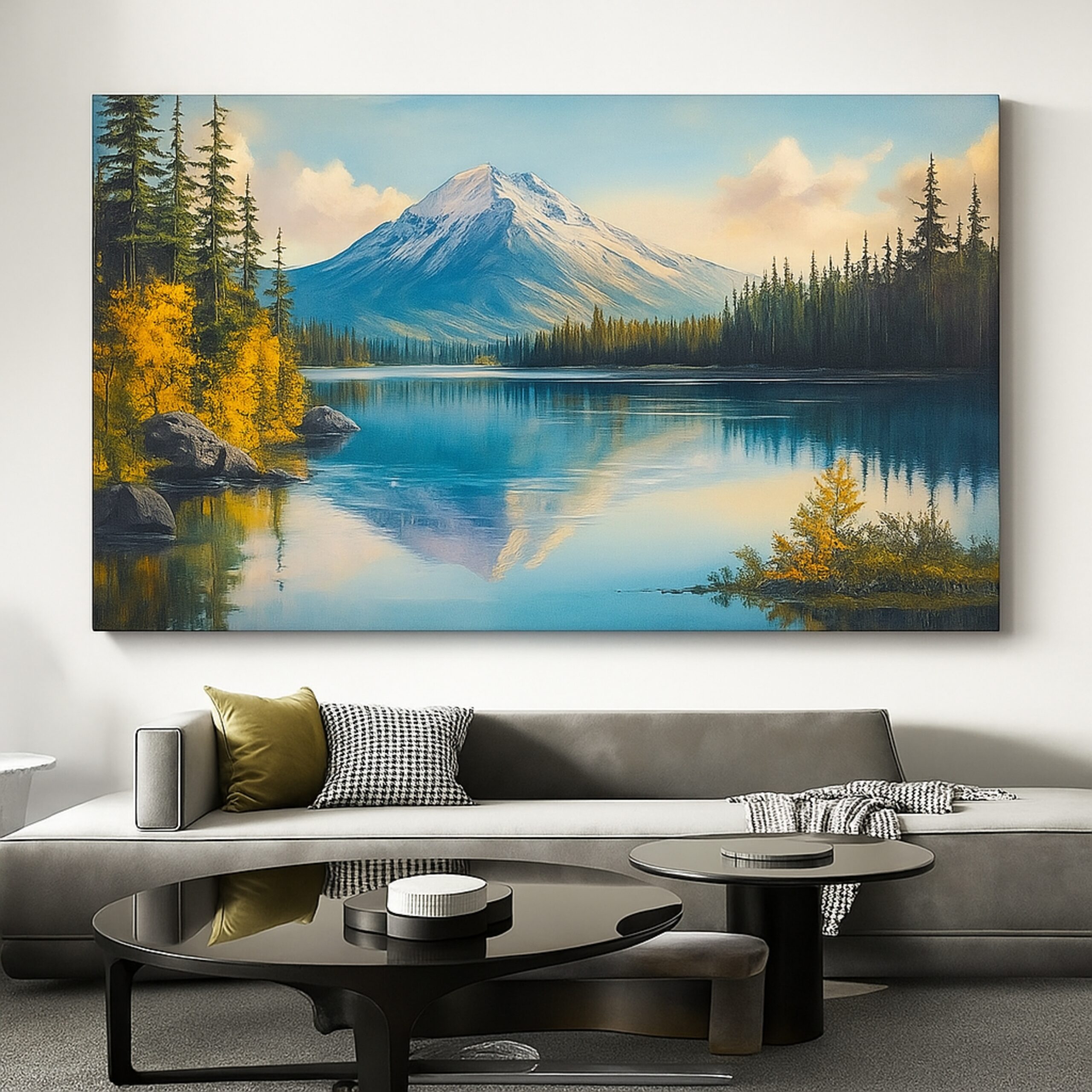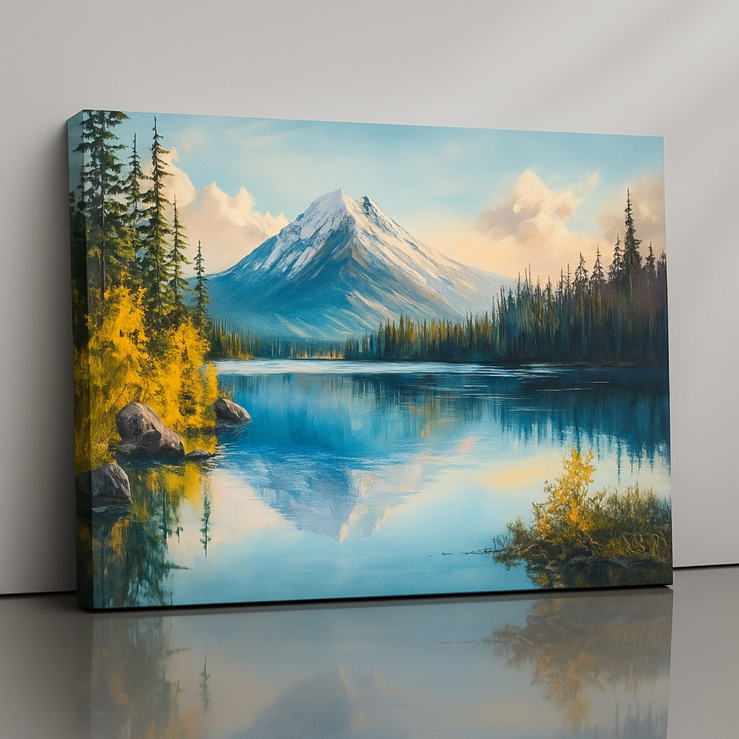 Alpine mountain peaks mirrored in calm lake. Premium canvas, fade-resistant inks, hand-stretched, ready to hang.