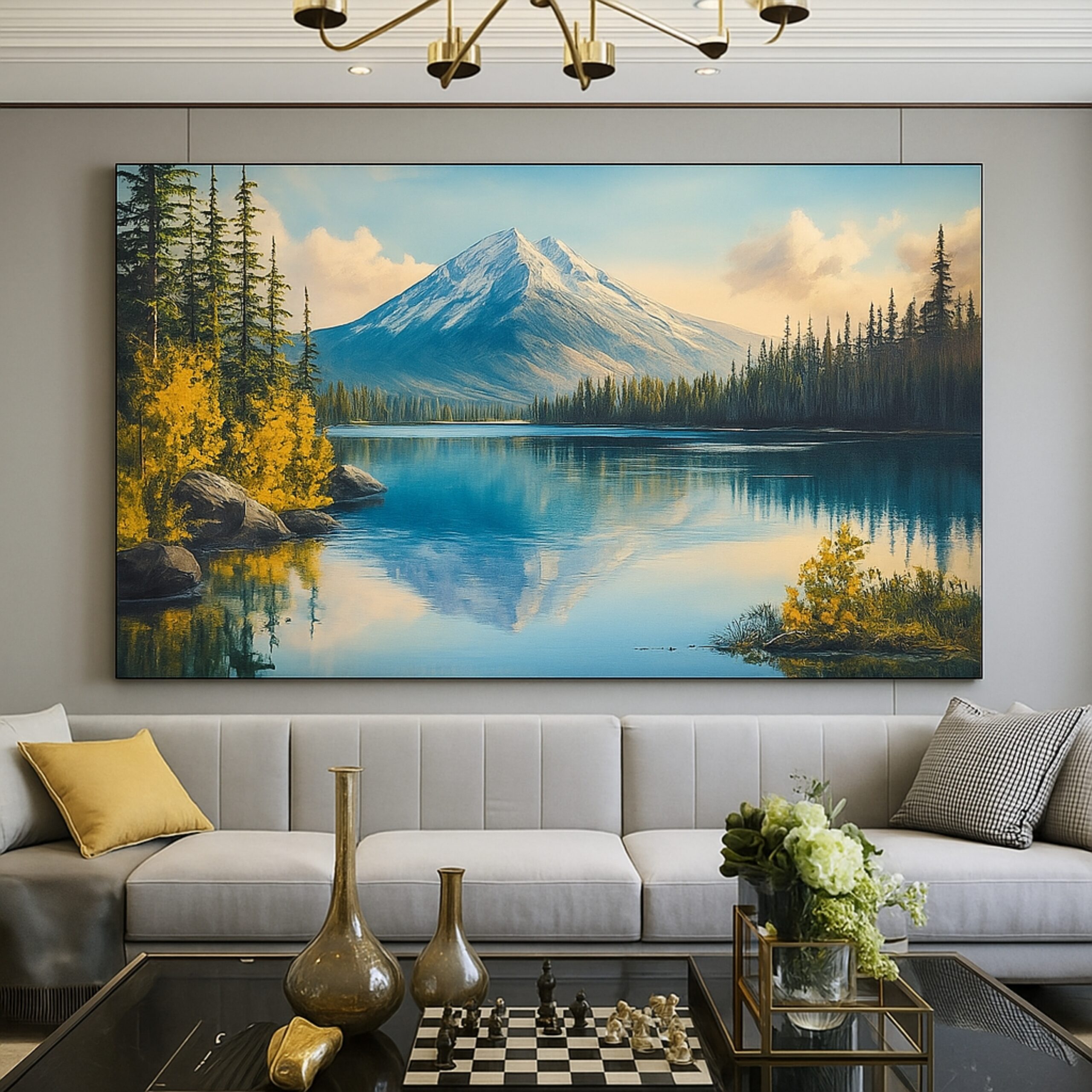 “Alpine Reflection” is a breathtaking Canvas Print that mirrors snow-capped peaks over a calm blue lake with golden autumn foliage. The artwork balances majesty and serenity, celebrating the grandeur of alpine landscapes.