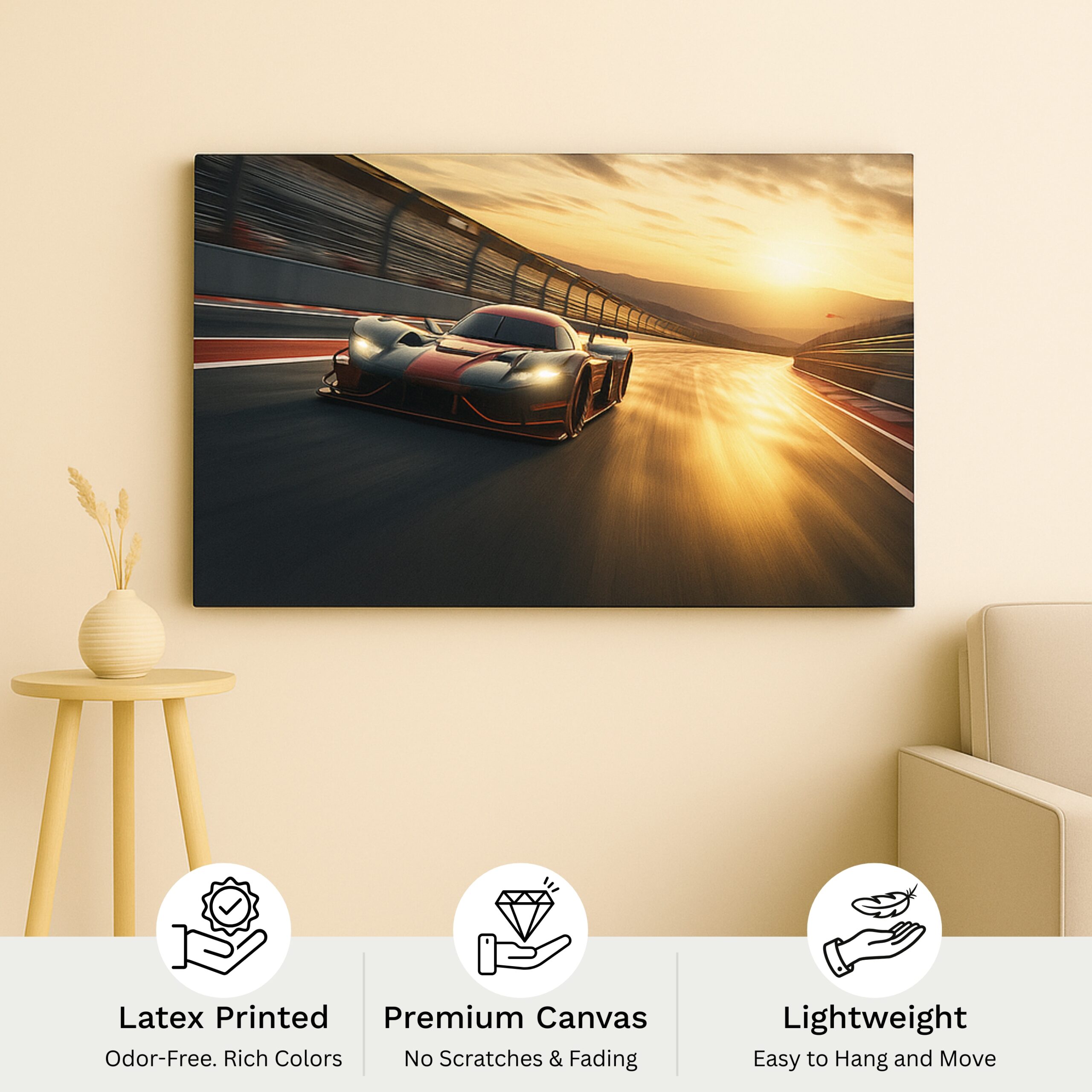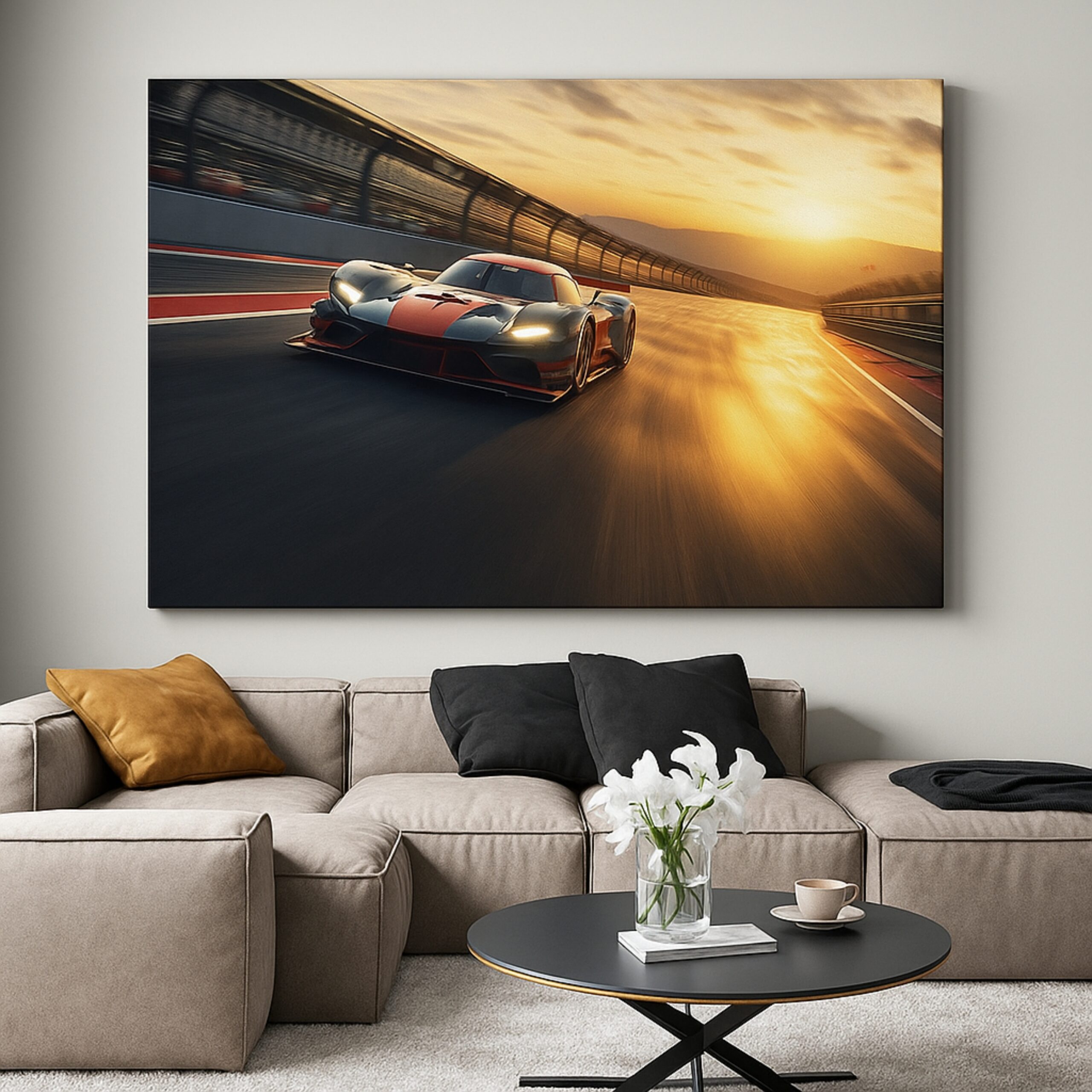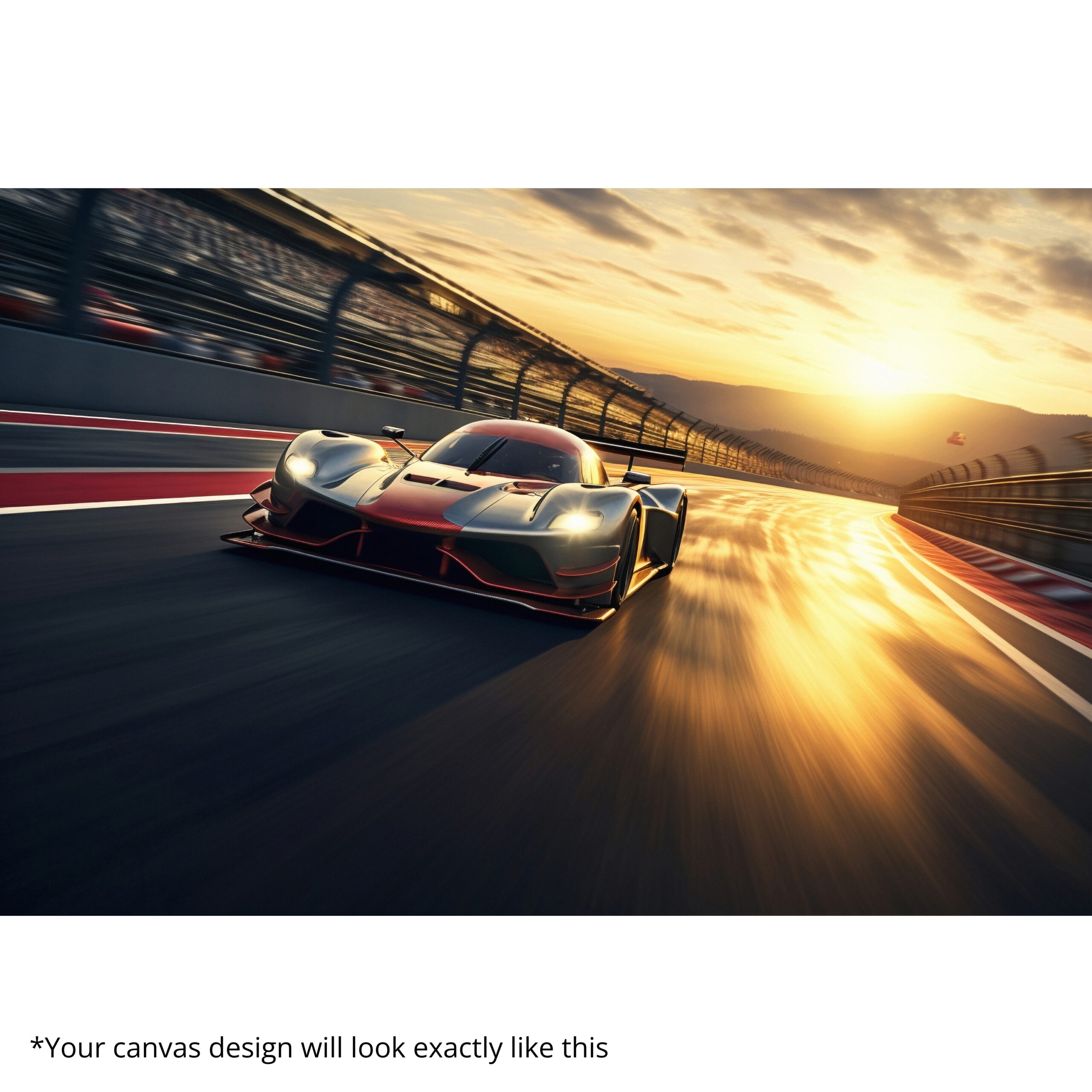 The Apex Velocity Canvas Print captures the thrill of motion as a futuristic race car blazes across the track under golden sunset light. Glossy reflections, dynamic perspective, and streamlined contours turn your wall into a celebration of ambition and momentum.
