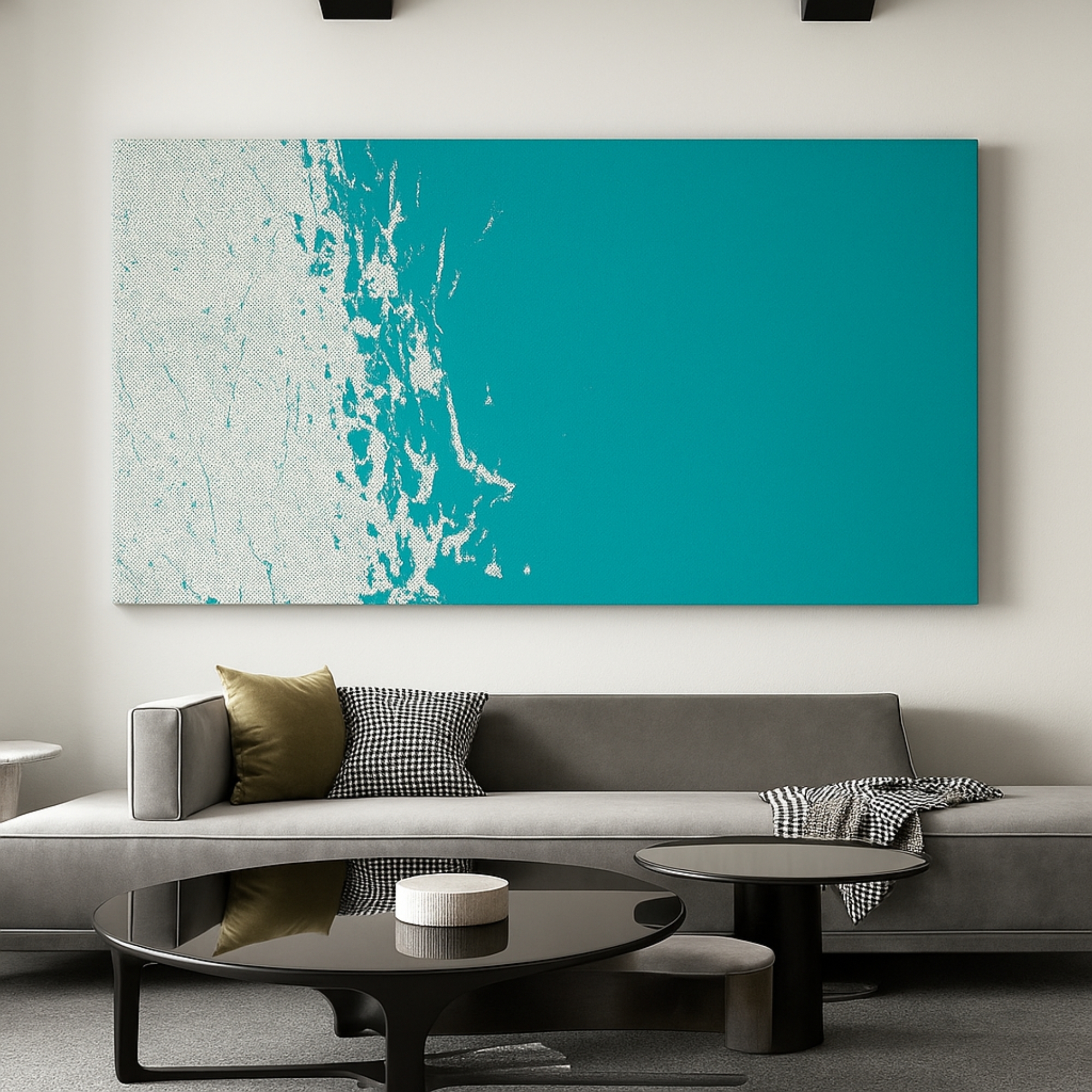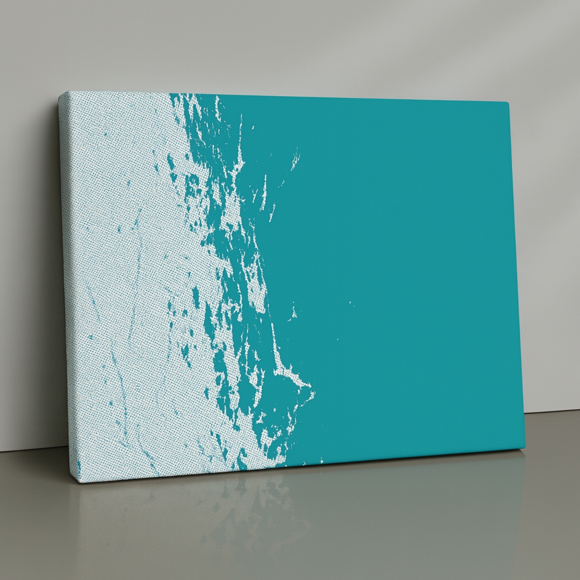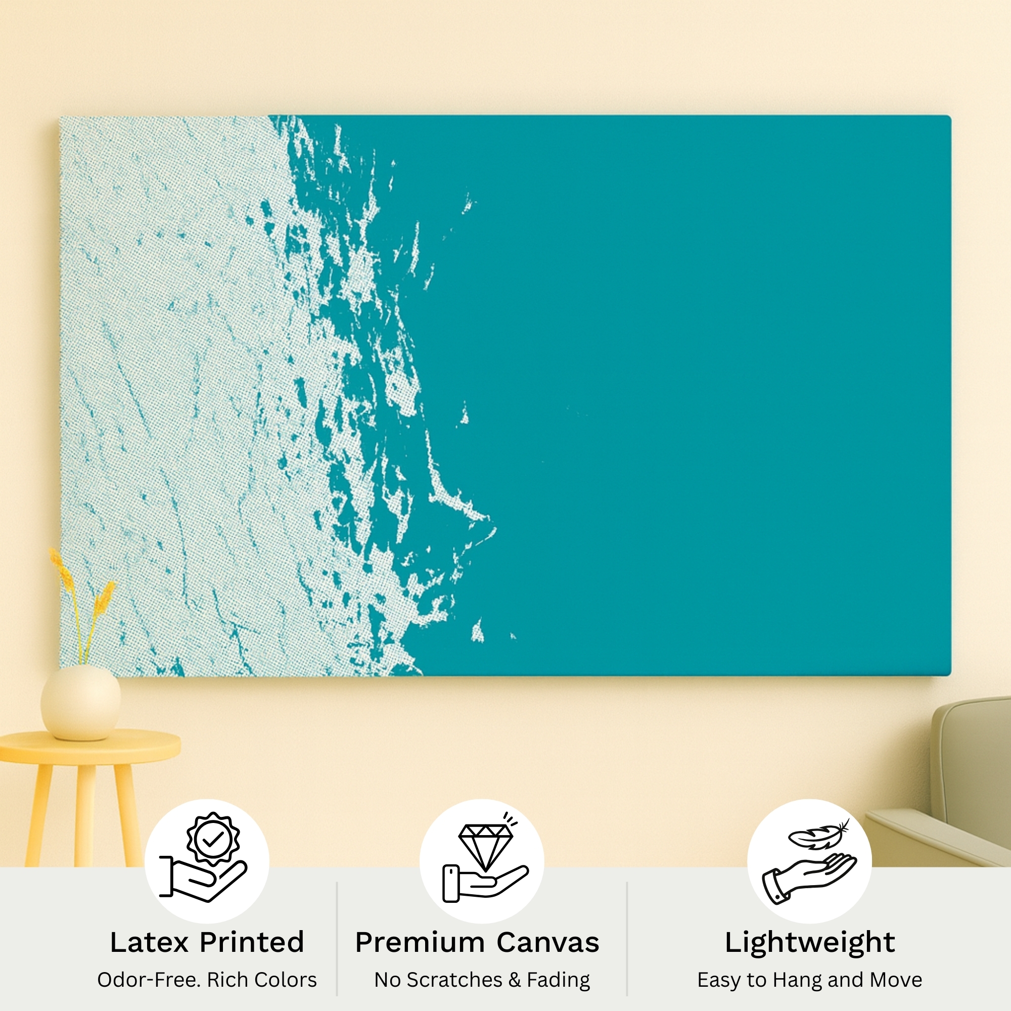 The Aqua Divide canvas print features a bold block of cool aqua contrasted by a crisp textured splash, offering a clean, modern aesthetic. This canvas enhances minimal interiors with fresh color, simplicity, and airy visual balance. Perfect for offices, studios, and contemporary Indian homes, the artwork adds refreshing contrast and modern clarity.