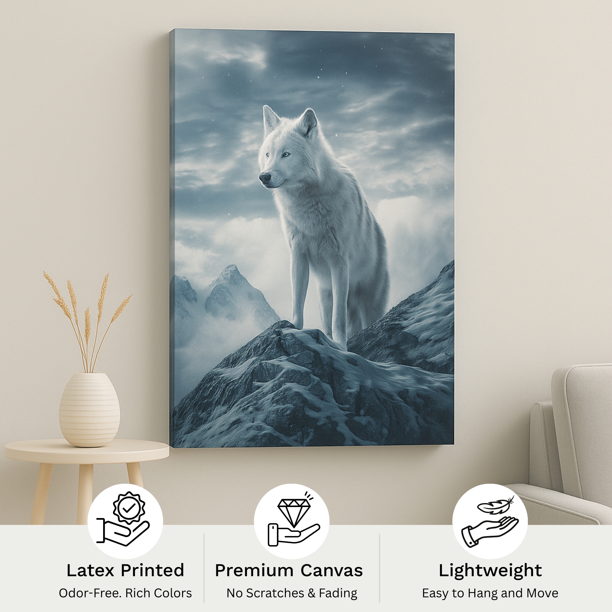 The Arctic Sentinel Canvas Print showcases a majestic white wolf standing against a powerful snow-covered mountain backdrop. Cool blue accents, crisp winter lighting, and highly detailed fur textures create a dramatic wildlife atmosphere filled with courage, solitude, and arctic mystery. Ideal for modern homes, gaming setups, winter-themed décor, offices, and nature-inspired spaces.