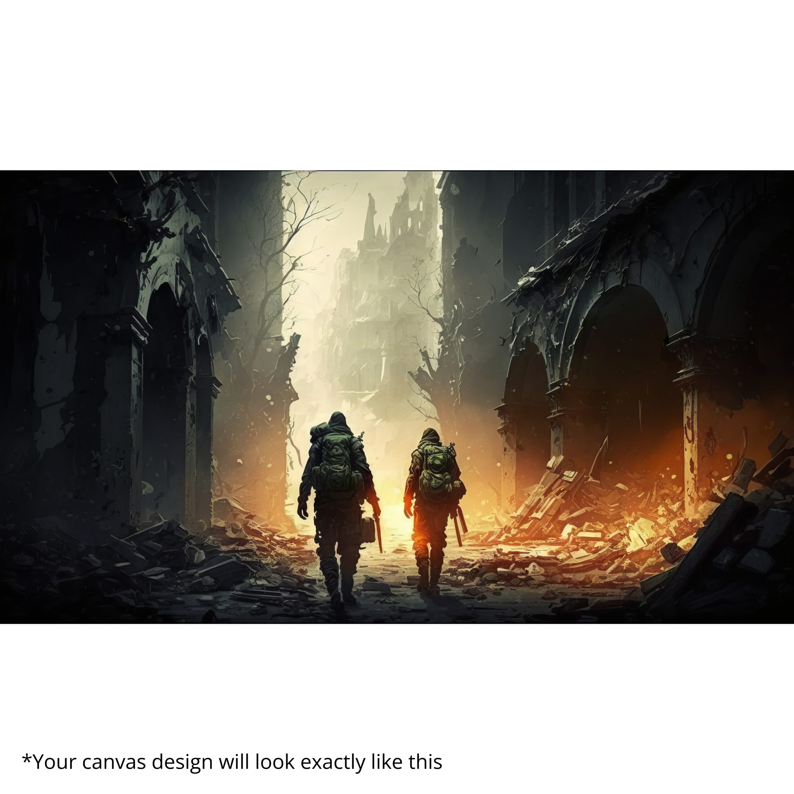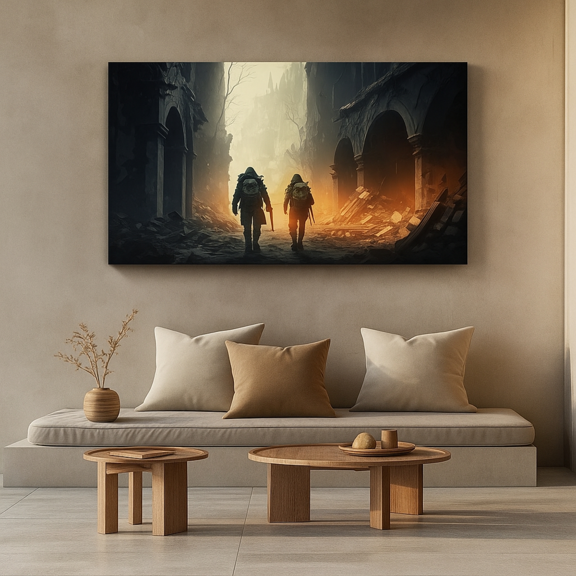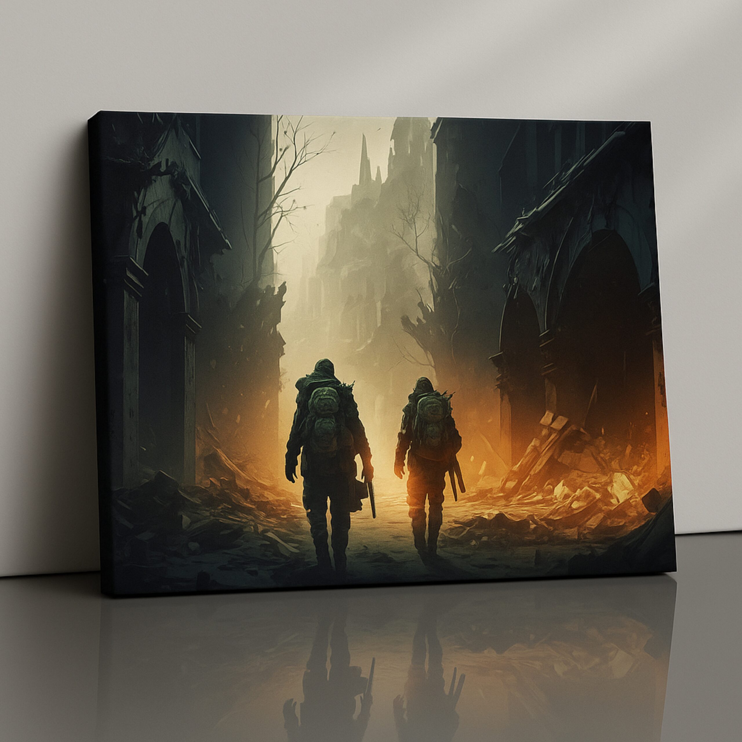 The Ashes of Valor Canvas Print portrays survivors navigating a glowing ruined city, symbolizing endurance, courage, and hope. With cinematic tones and dramatic atmosphere, this canvas print adds bold storytelling to modern interiors. A blend of tragedy and resilience, it creates powerful focal points in living rooms, studios, or offices that value art with emotional impact.