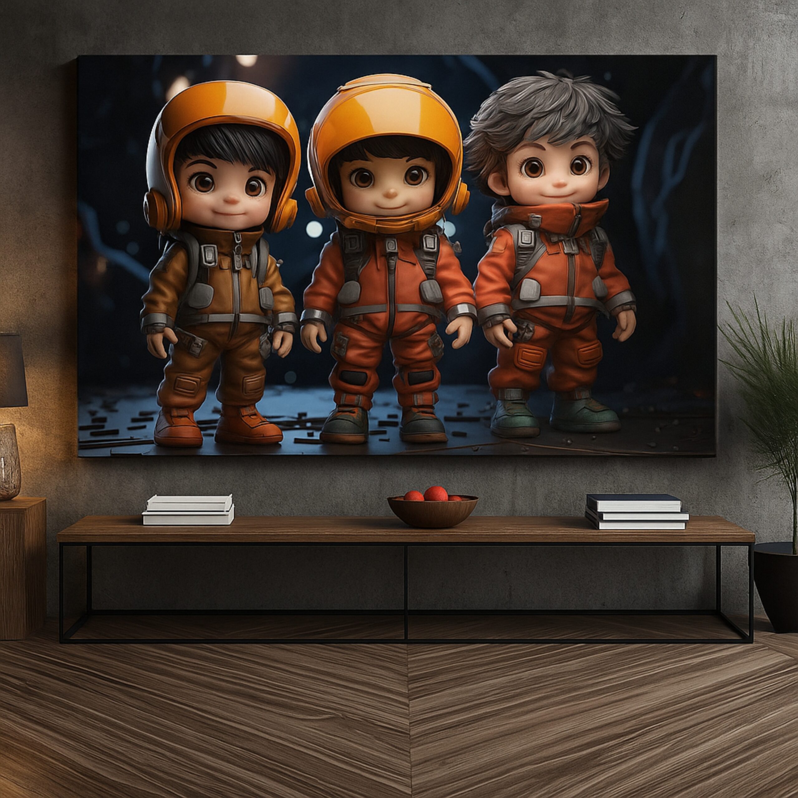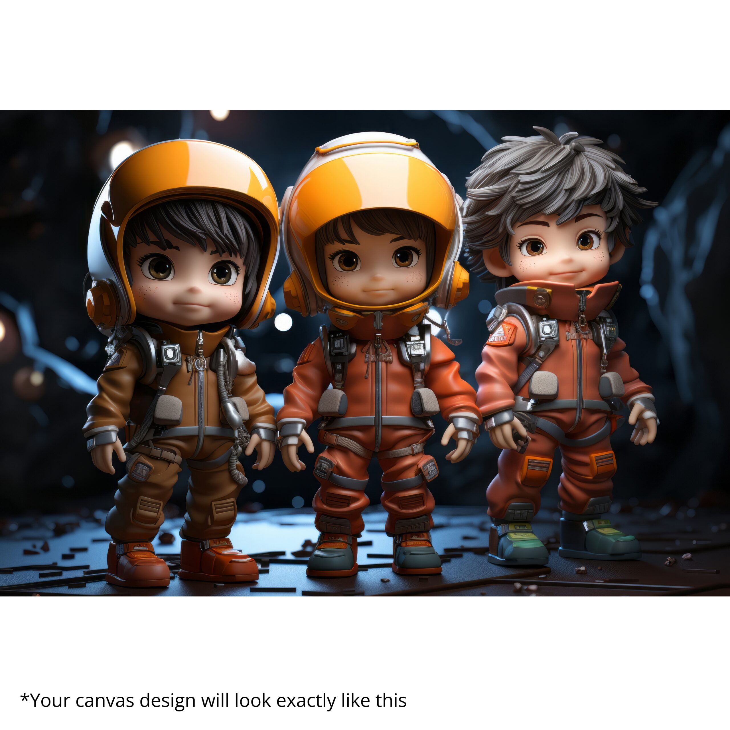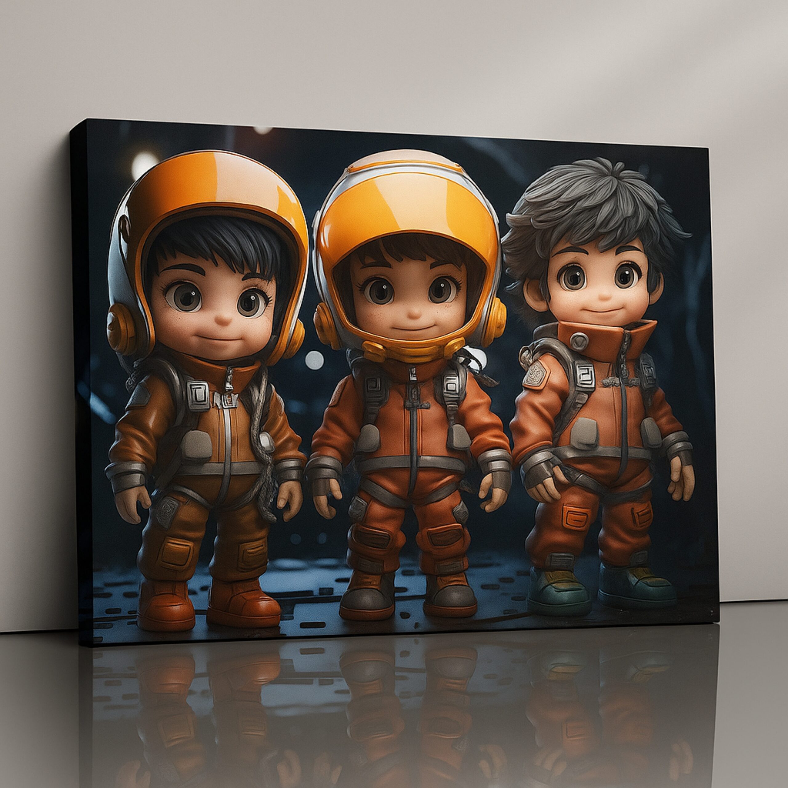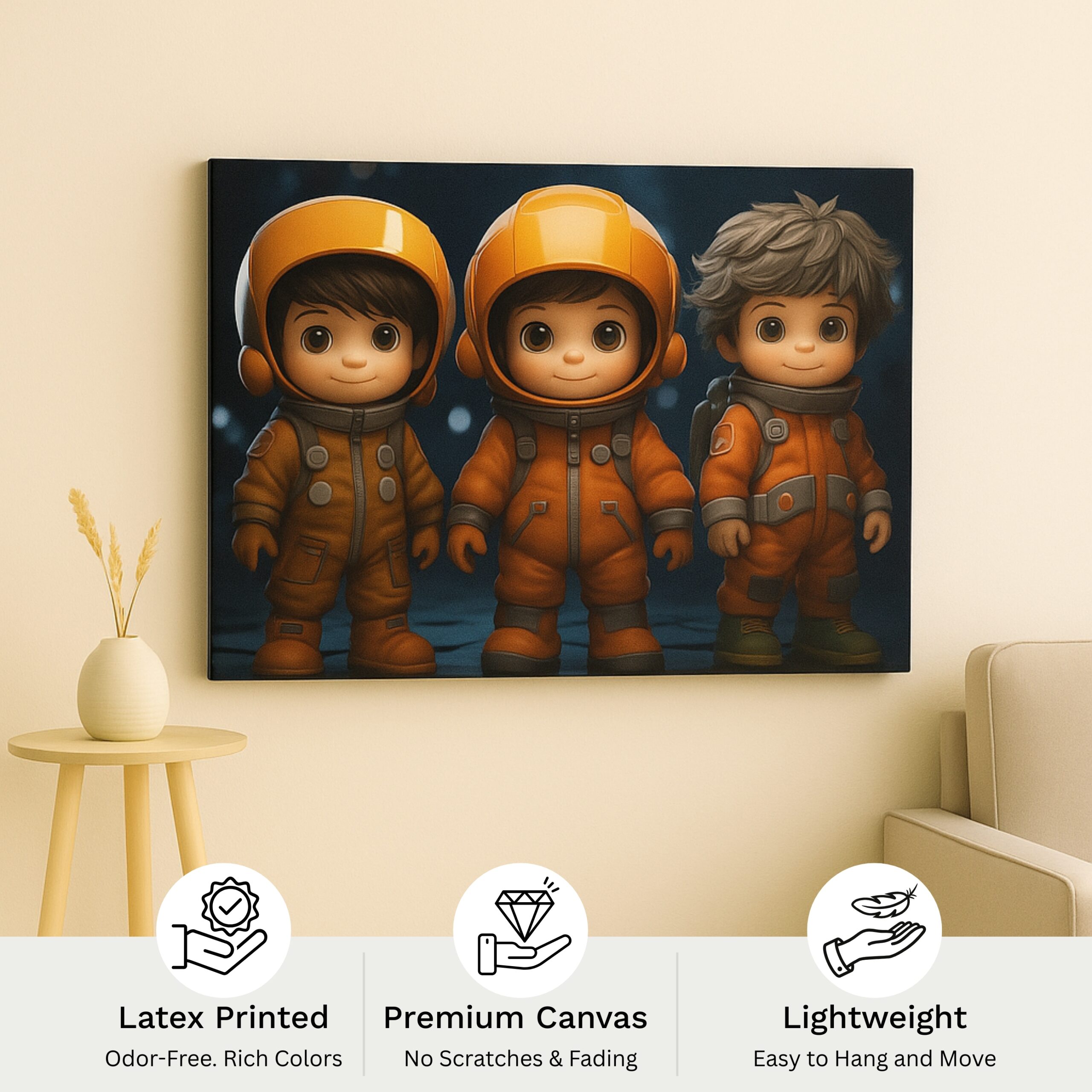 The Astro Cadets Canvas Print launches childhood wonder into orbit with adorable explorers in bright orange space suits. Their wide-eyed excitement and star-filled backdrop spark curiosity, courage, and joy—perfect for families who love playful yet inspiring décor.