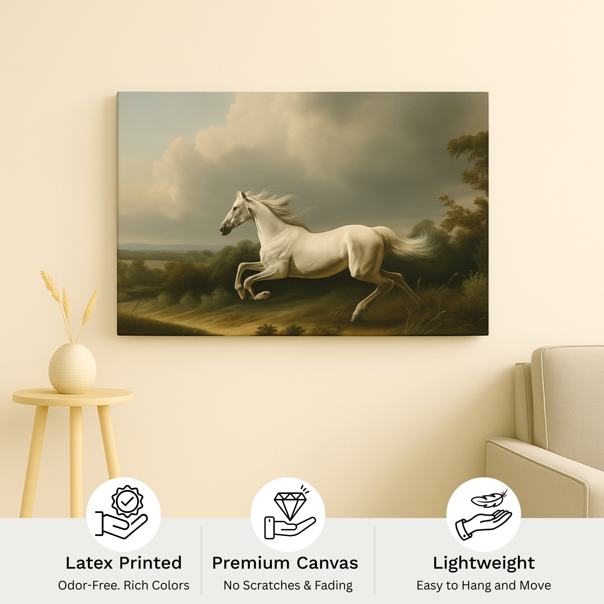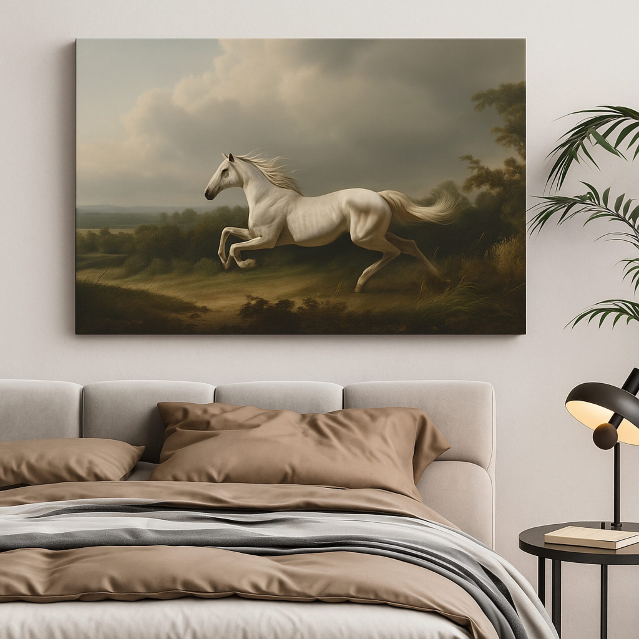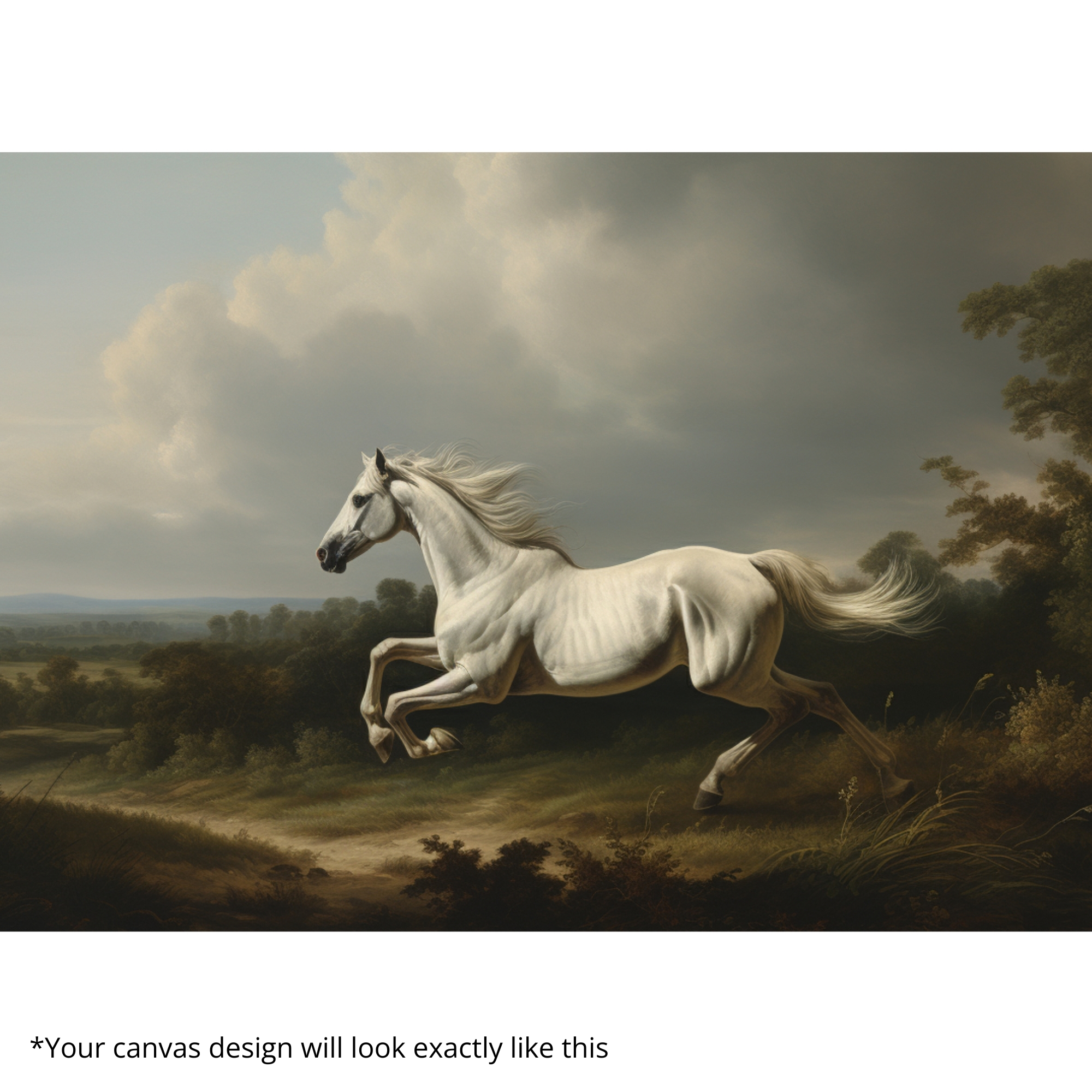 “BioCircuit Gallop” Canvas Print embodies motion, vitality, and freedom. A majestic white horse charges across open fields beneath storm-lit skies, its flowing mane radiating untamed energy. This artwork celebrates strength and resilience, infusing interiors with dynamism and natural grace. More than a painting, it’s a bold reminder of the spirit of freedom.