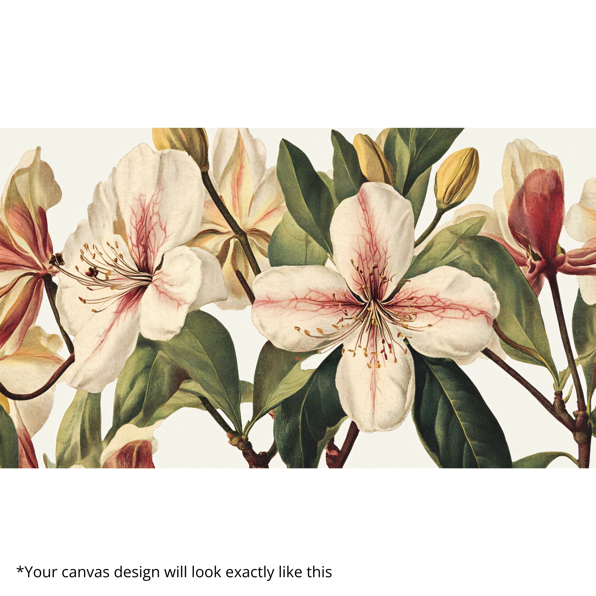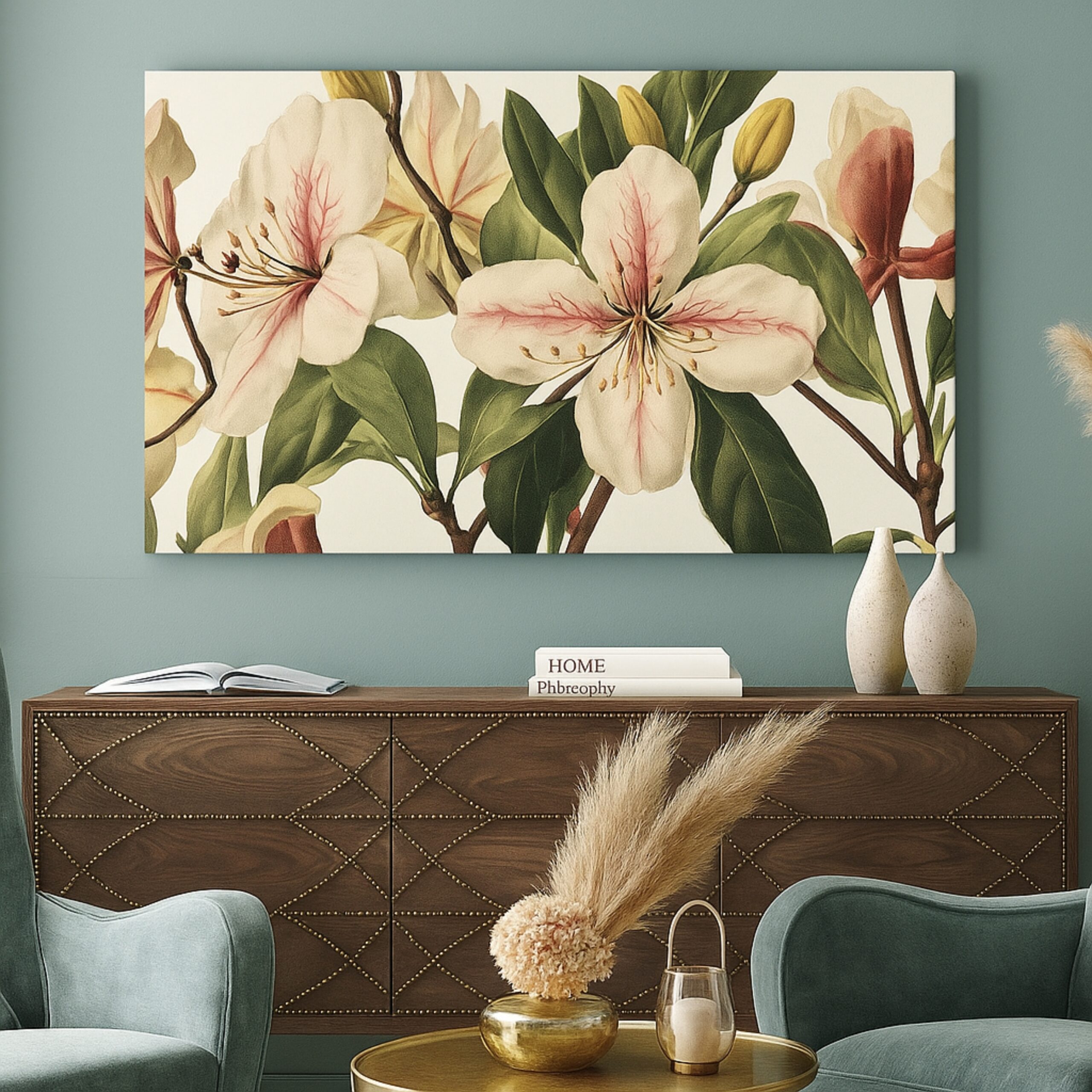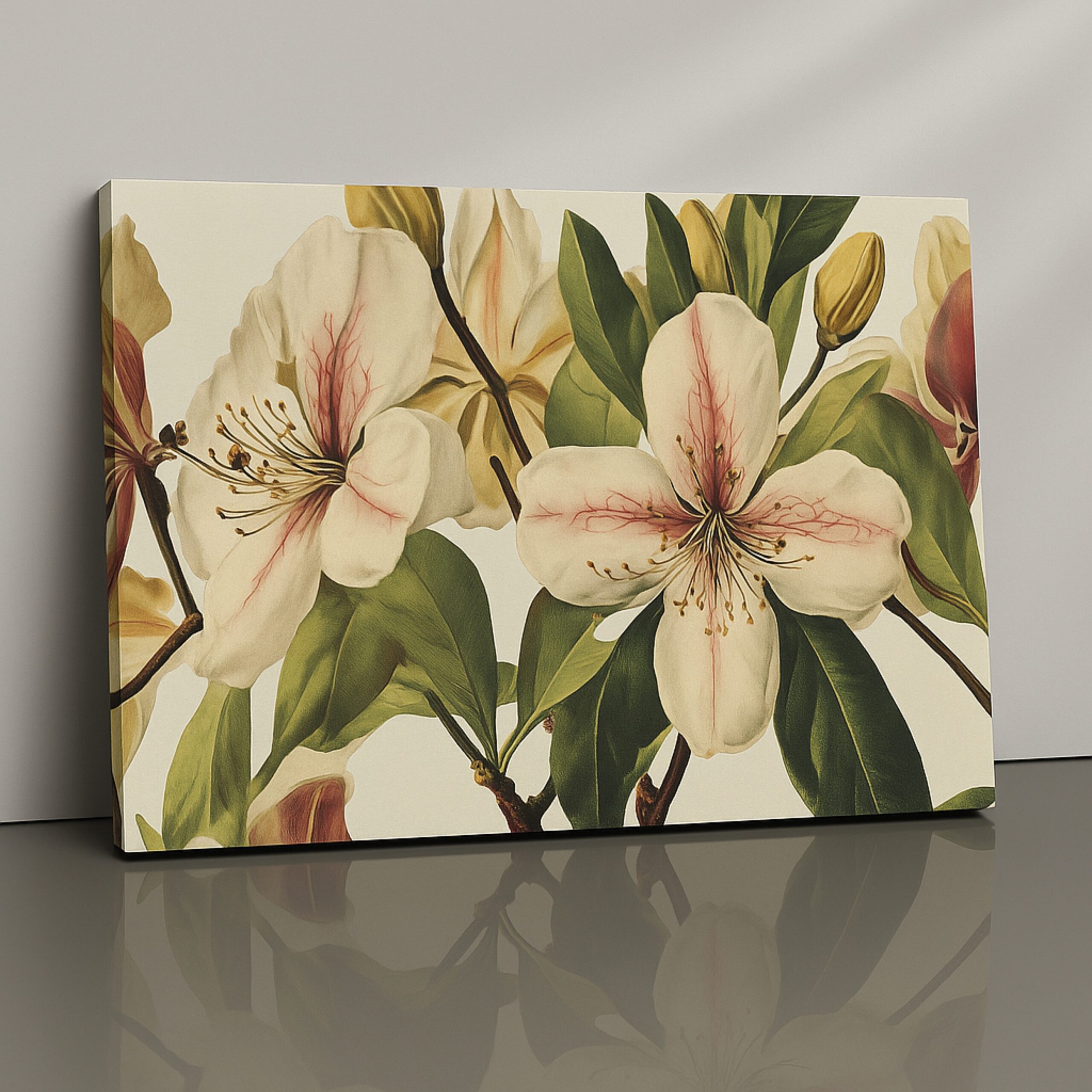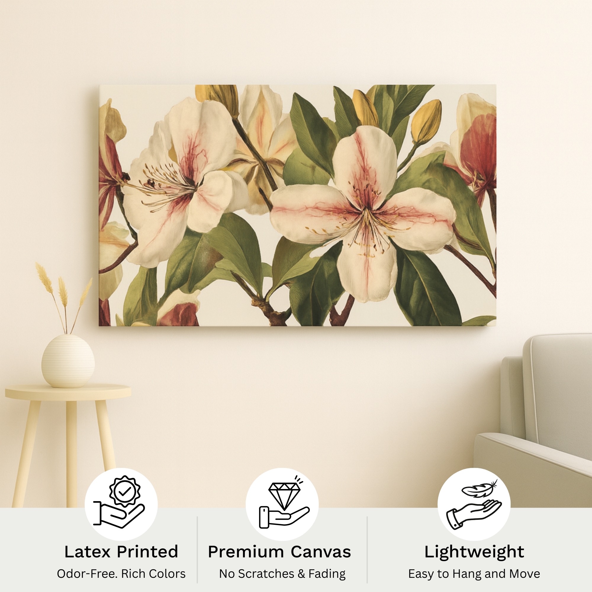 Soft magnolia blossoms in blush tones. Premium canvas, fade-resistant inks, hand-stretched, ready to hang.