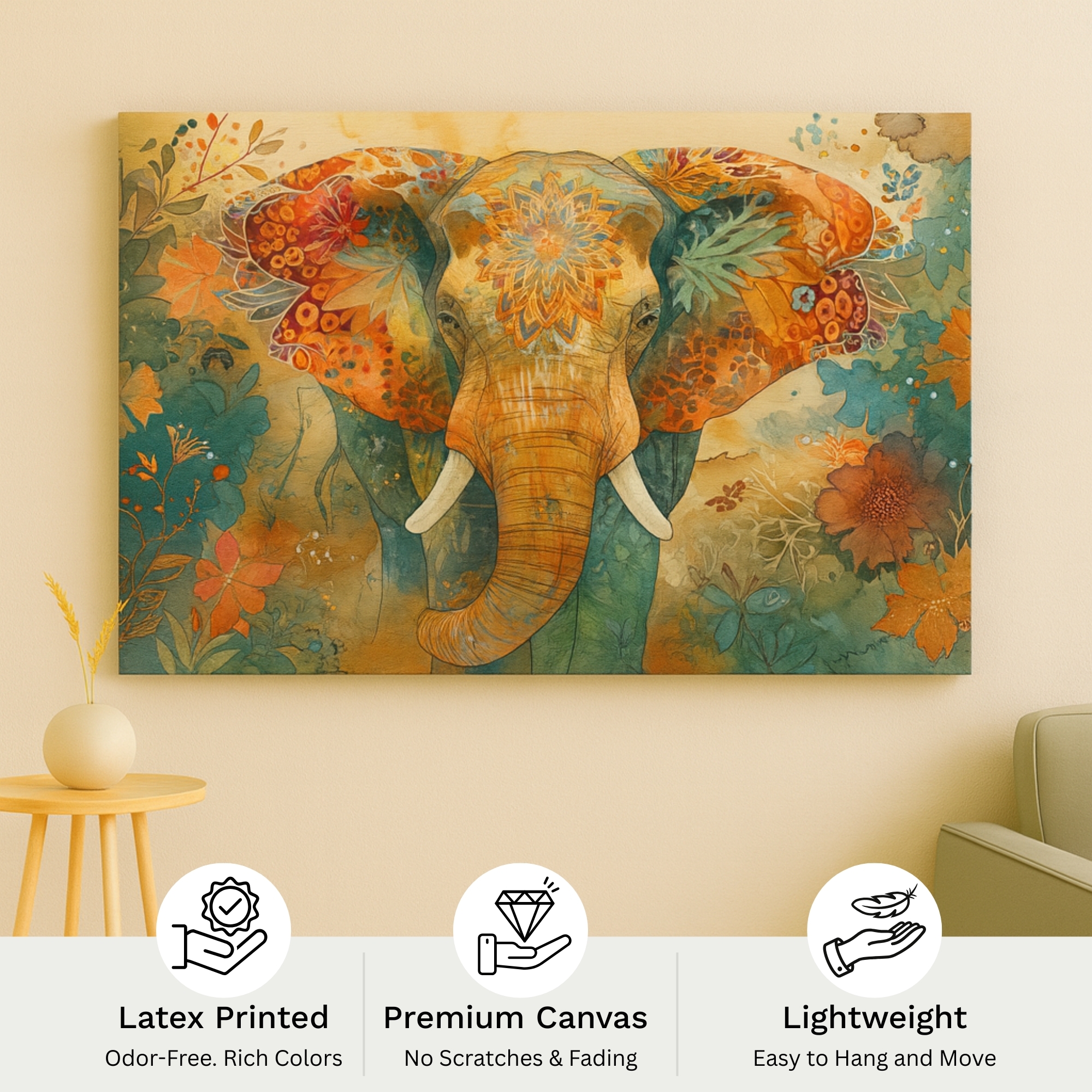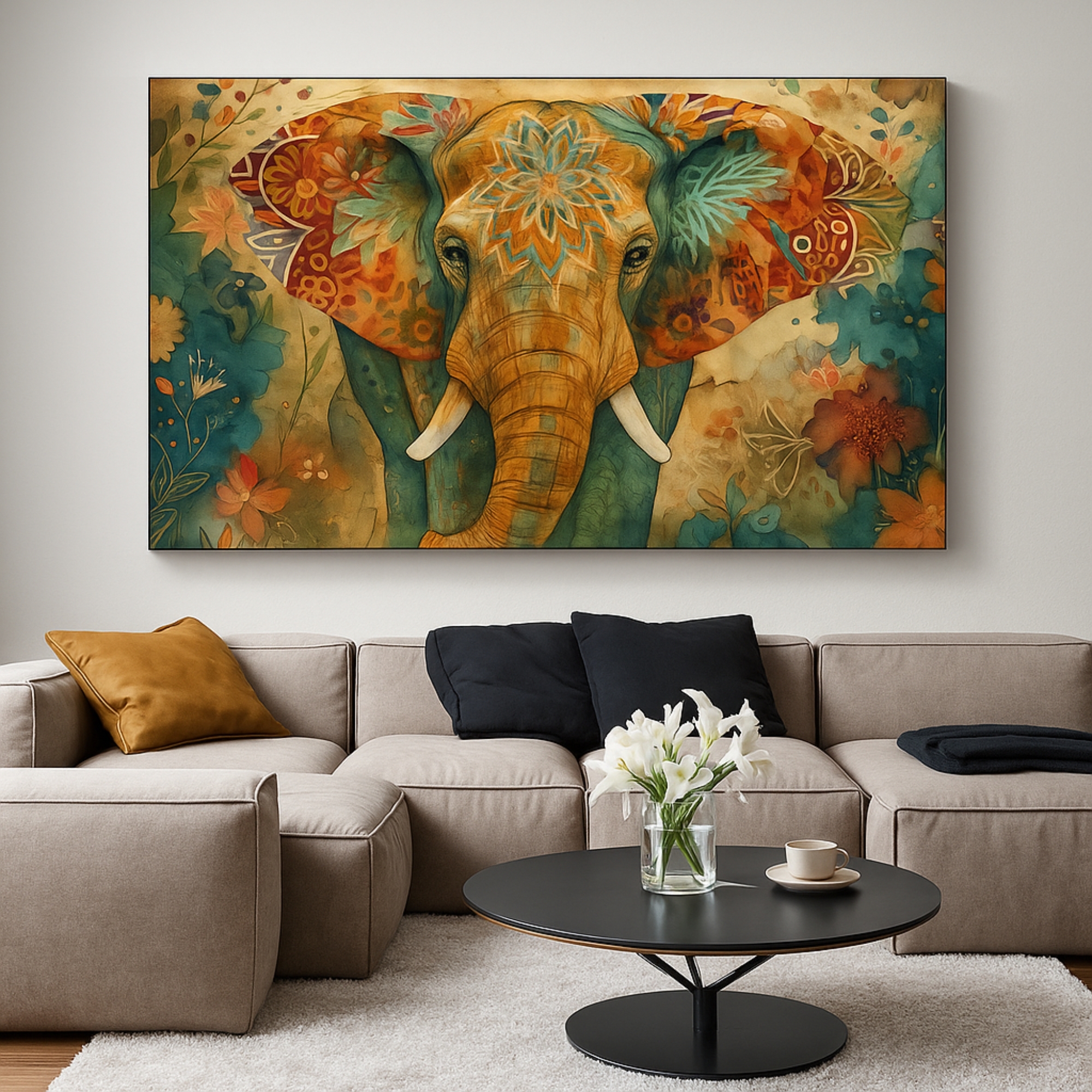 “Boho Giant canvas print showcases an elephant covered in intricate mandala patterns, radiating artistic richness and cultural charm. Perfect for bohemian, earthy, and Indian eclectic interiors, this artwork symbolizes wisdom, strength, and heritage artistry. The warm tones and ornamental detailing transform any wall into a vibrant cultural highlight.