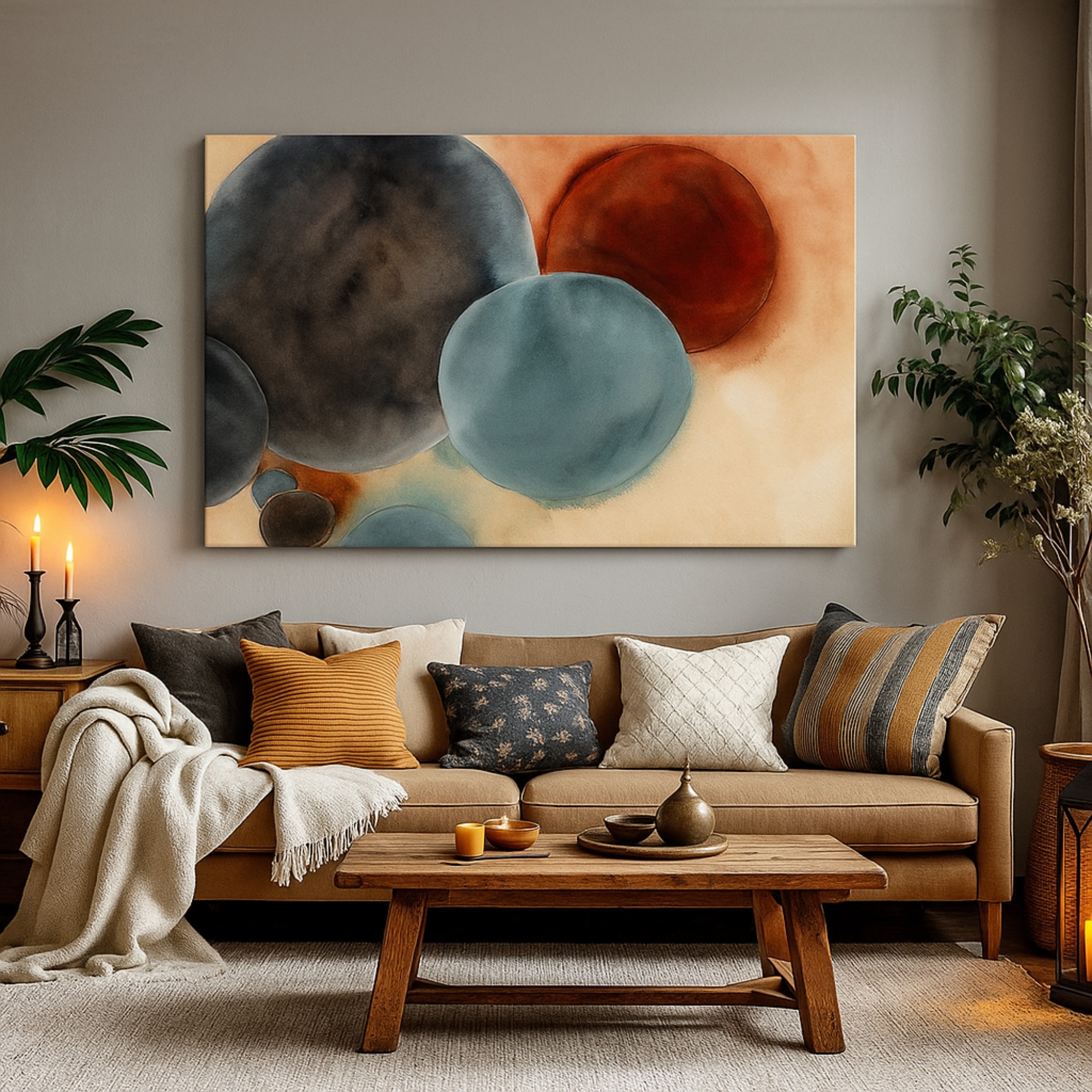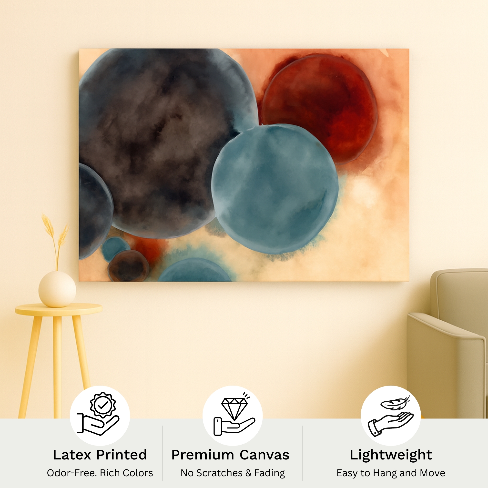 The Cosmic Spheres canvas print features large blended orbs in deep charcoal, teal, and warm rust tones, creating a cosmic, atmospheric visual. Perfect for brightening living rooms, nurseries, creative corners, and home offices, this canvas print delivers warmth, balance, and high-end aesthetic appeal. Playful Echoes fits beautifully with pastel décor, Scandinavian themes, and modern abstract styling.