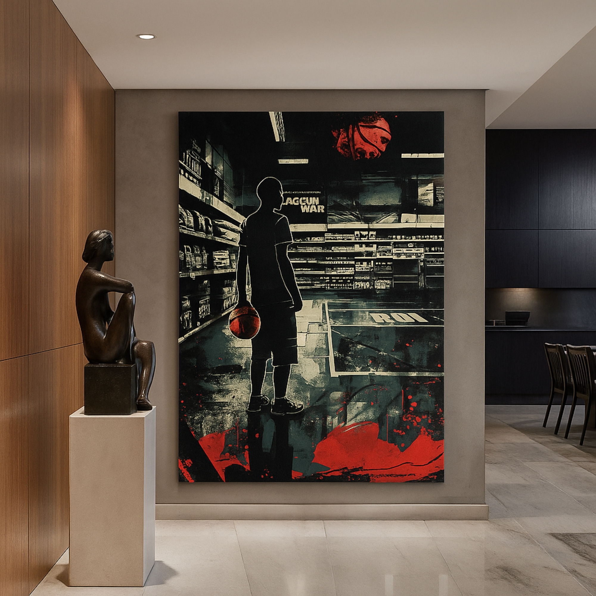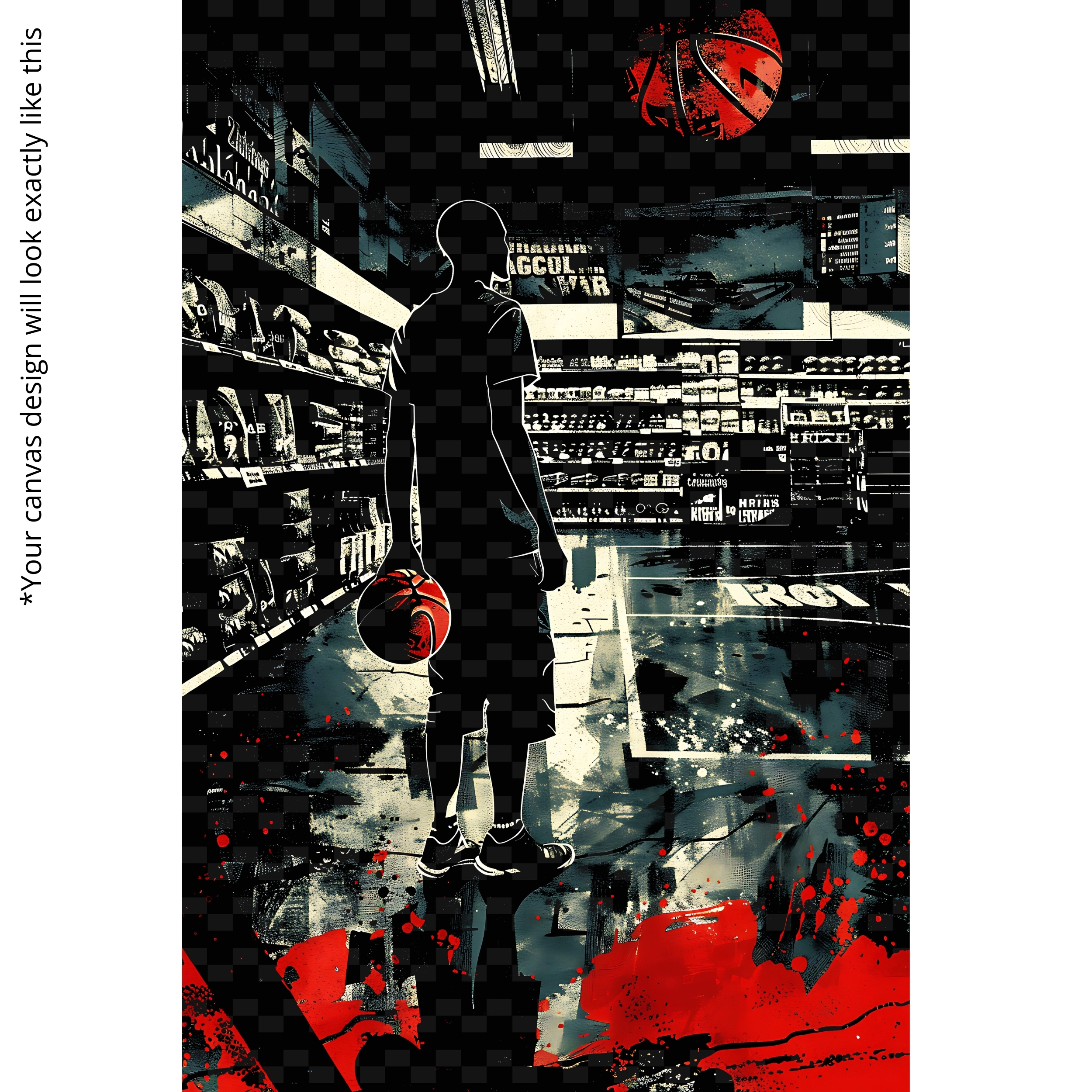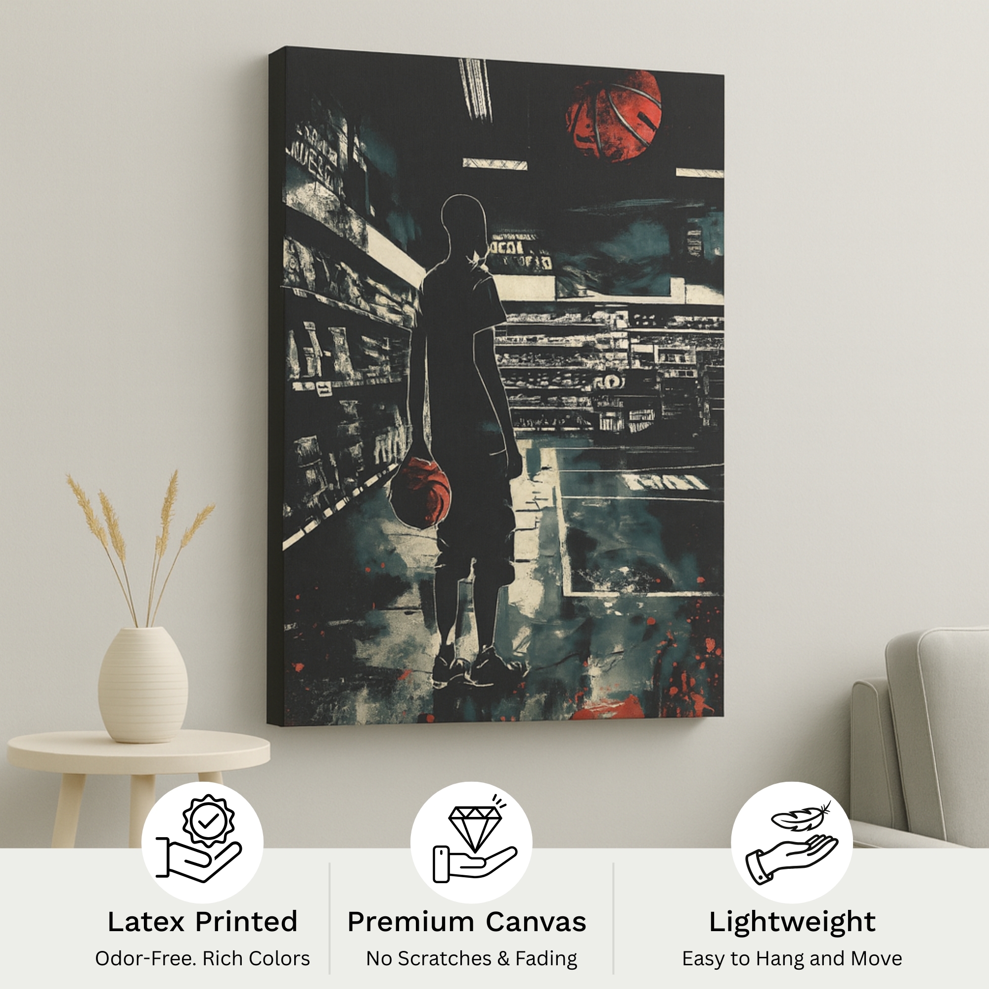 The Court Dreams Canvas Print is a tribute to basketball passion and urban street culture. Featuring a lone figure in moody tones holding a ball, this piece reflects ambition, resilience, and determination. Bold reds and shadows capture the intensity of late-night games and unspoken dedication to the sport.