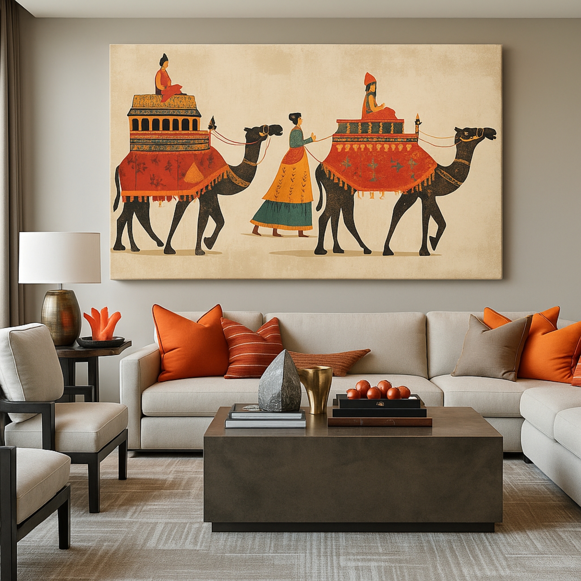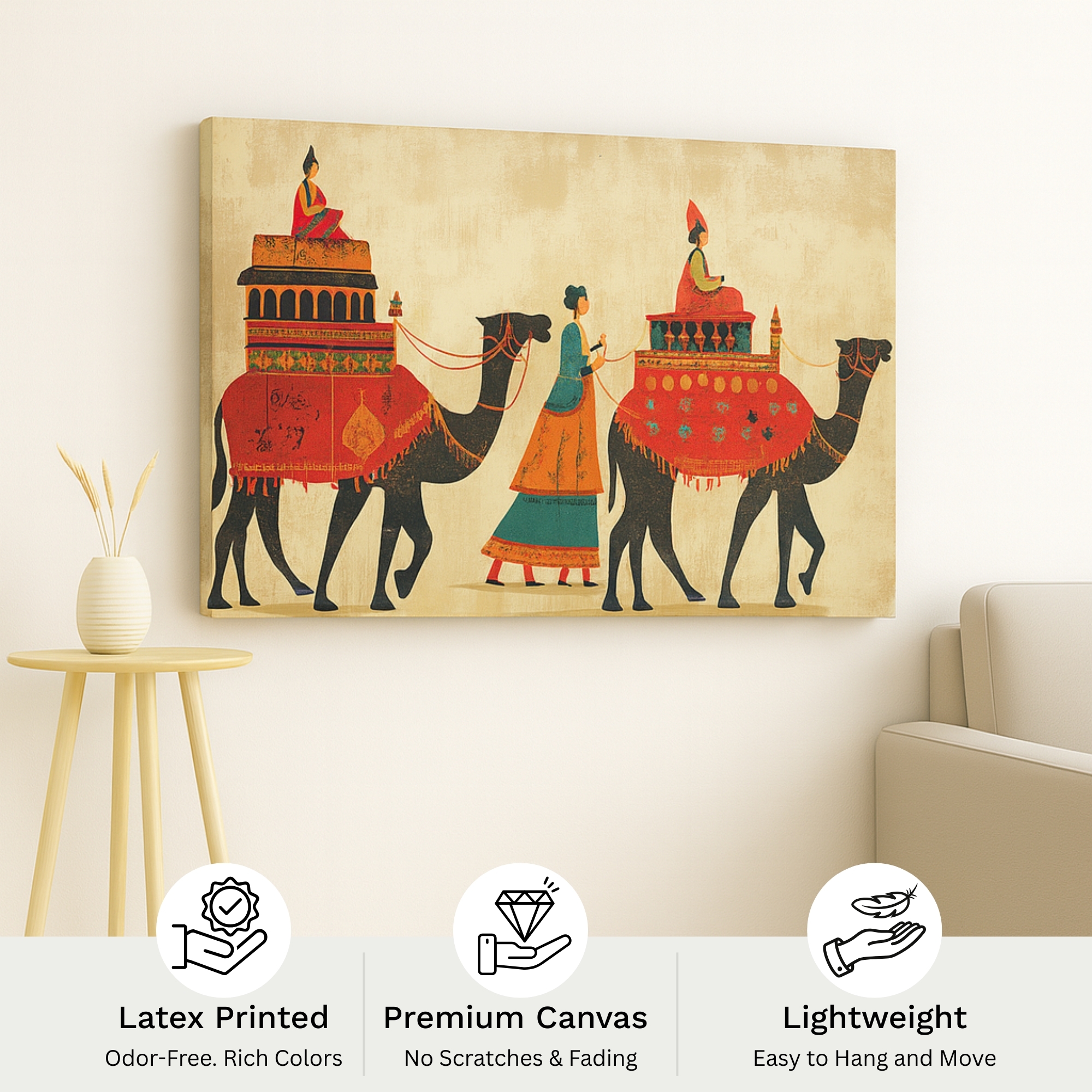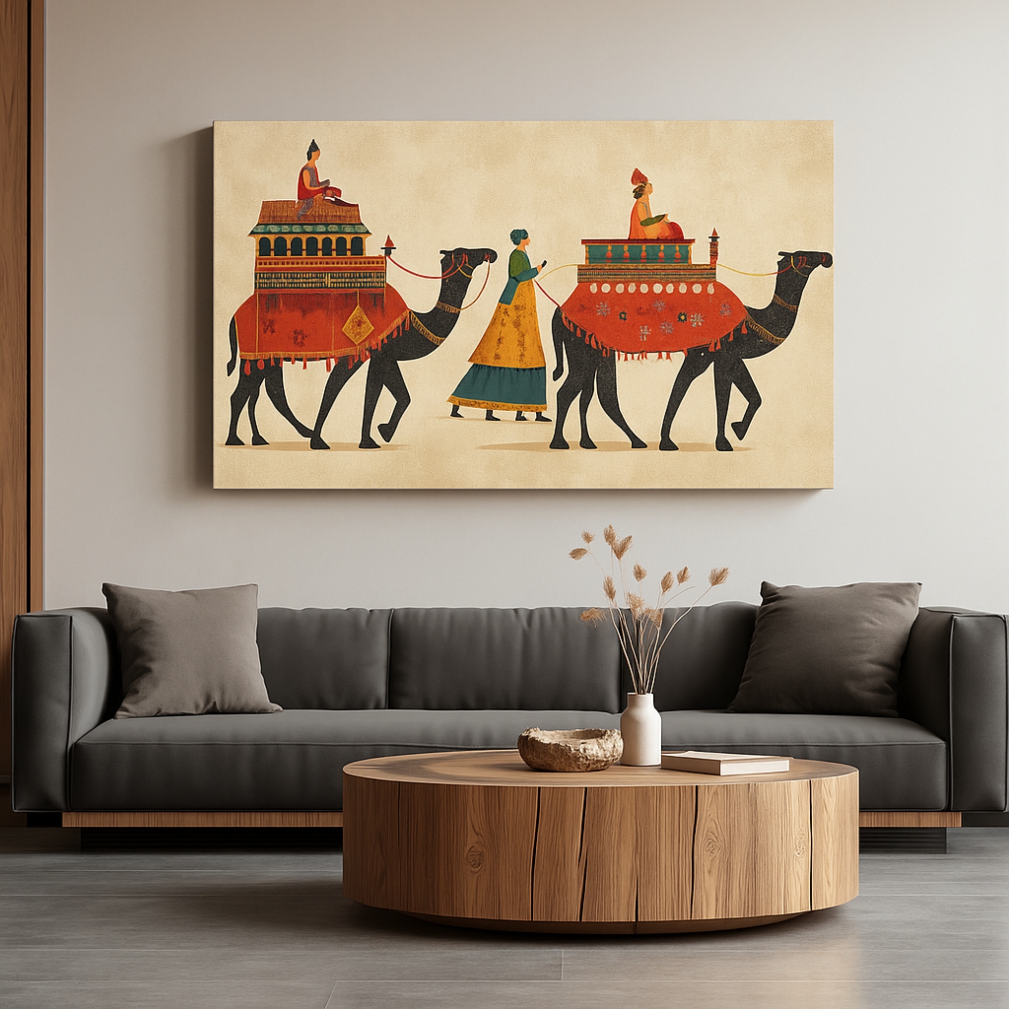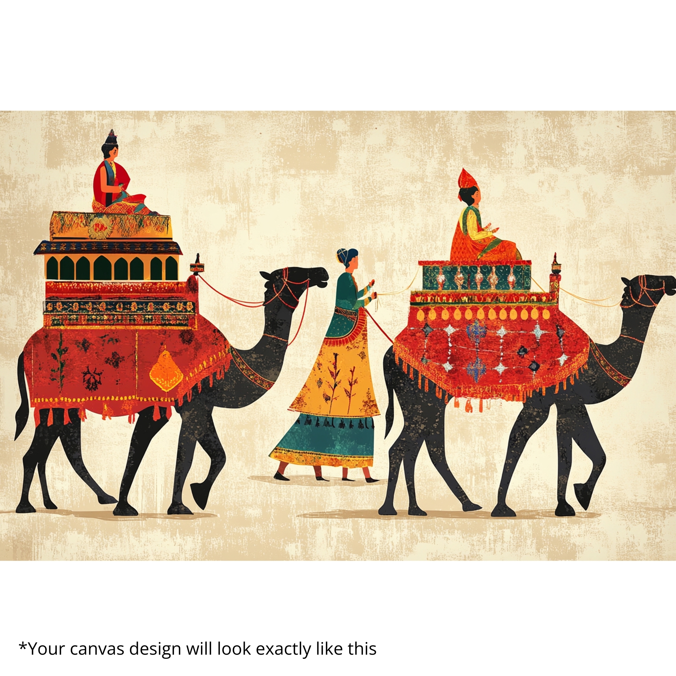 “Desert Caravan” Canvas Print captures the poetic motion of a royal procession crossing the golden dunes. Draped camels stride gracefully under the amber sky, reflecting stories of travel, heritage, and timeless Indian artistry. This artwork embodies wanderlust and elegance, perfect for warm interiors and cultural spaces.
