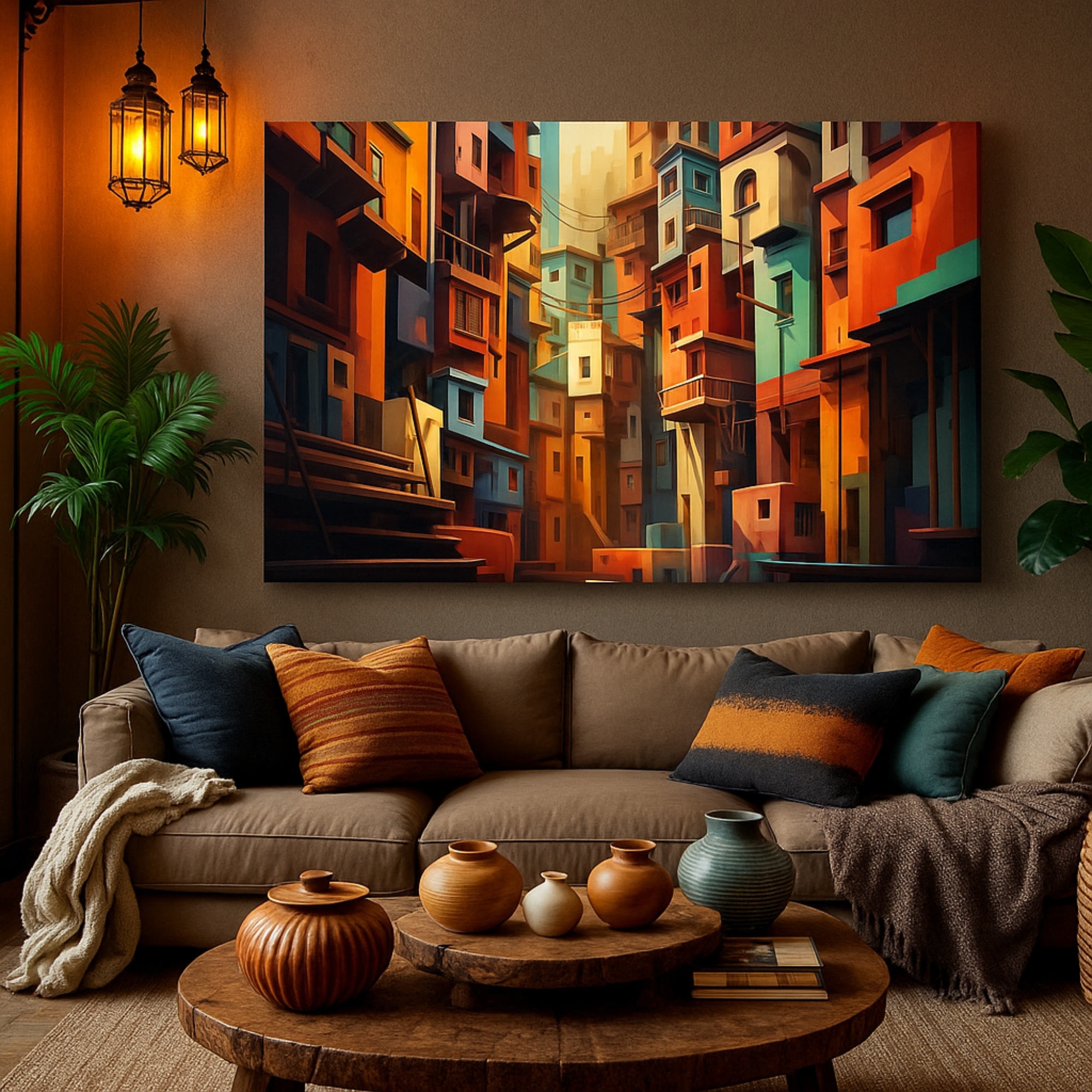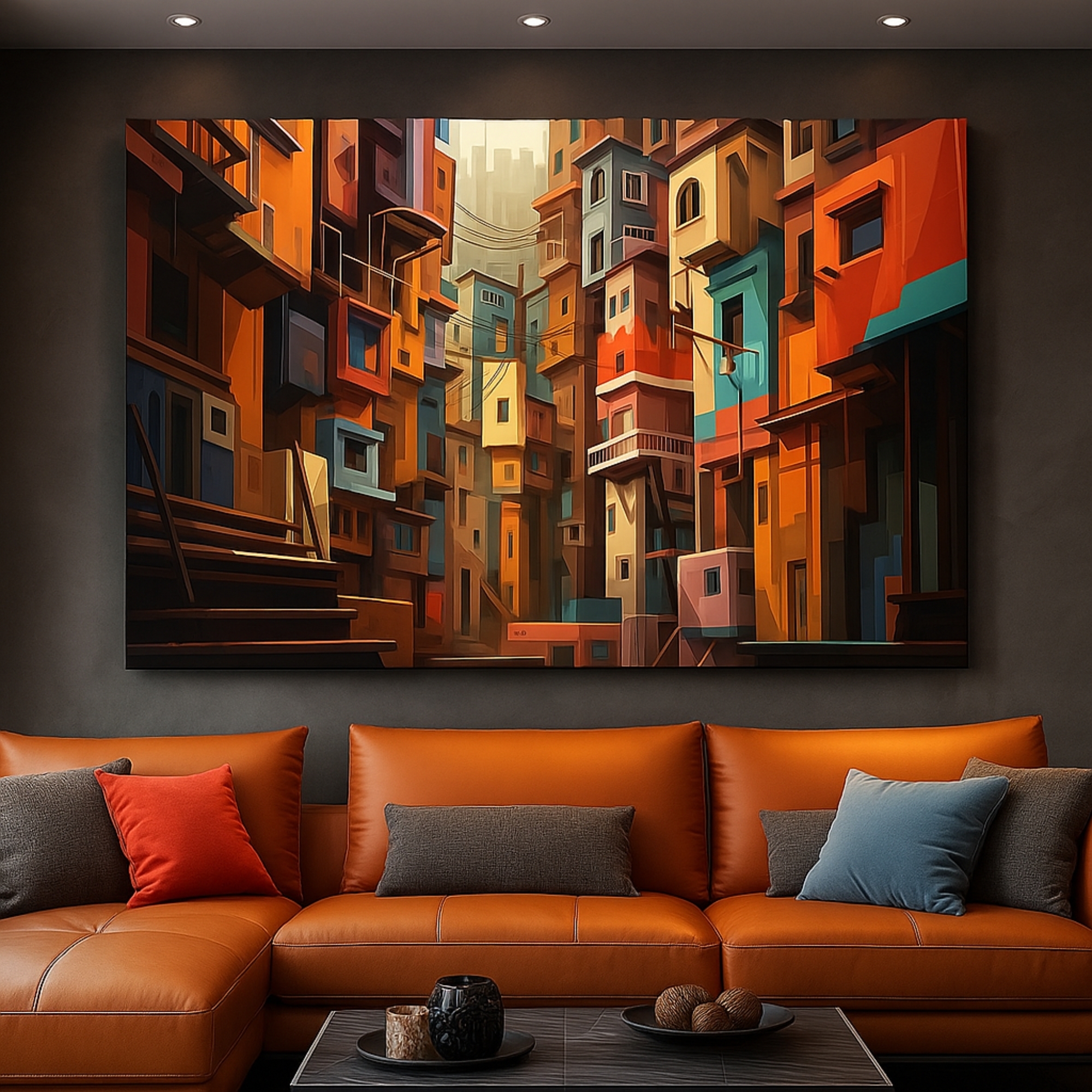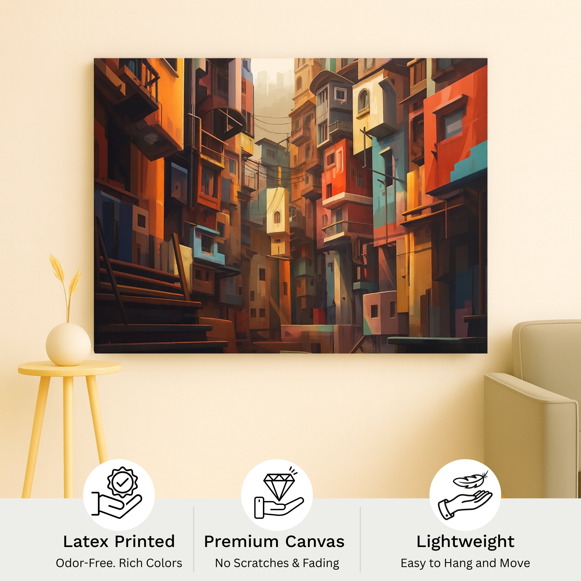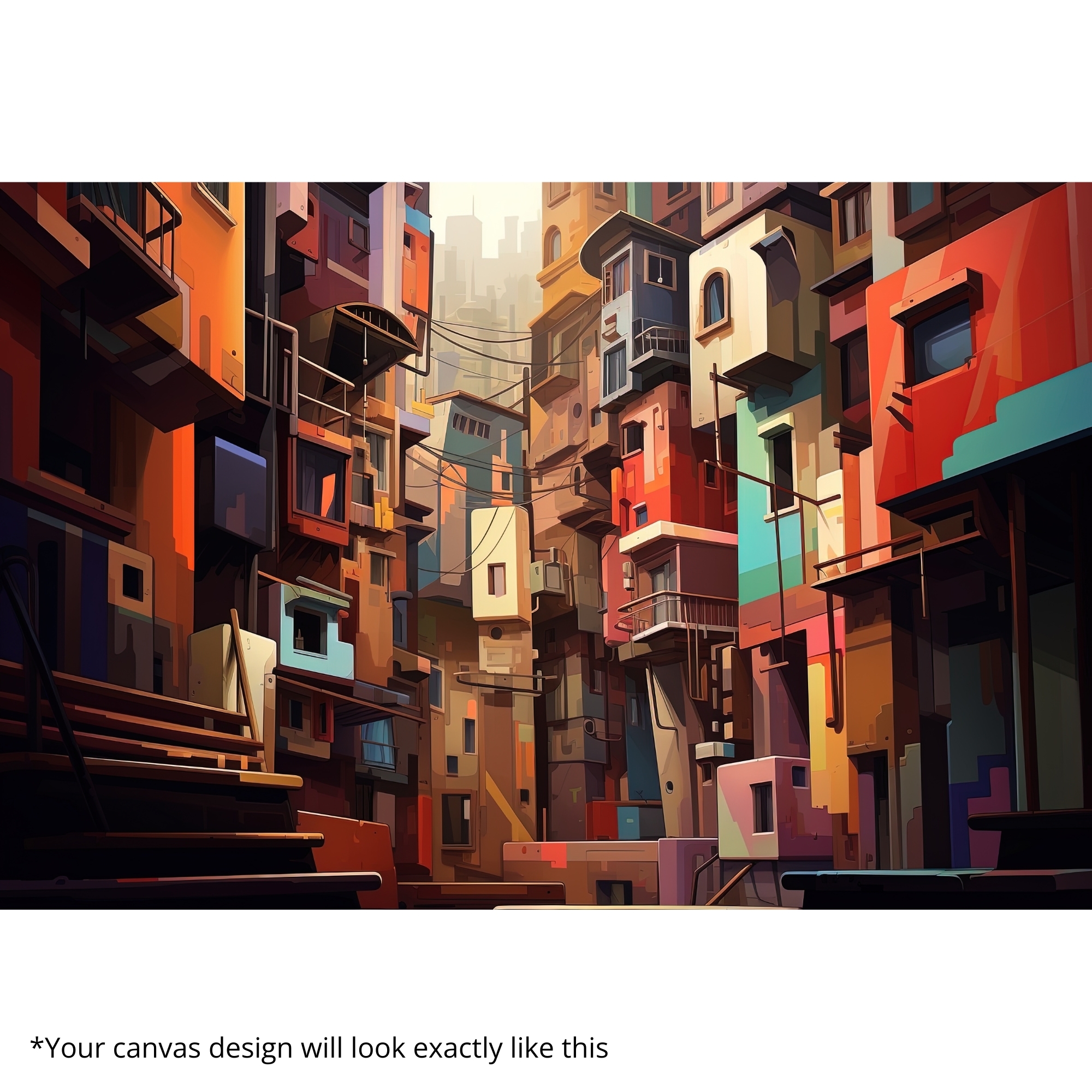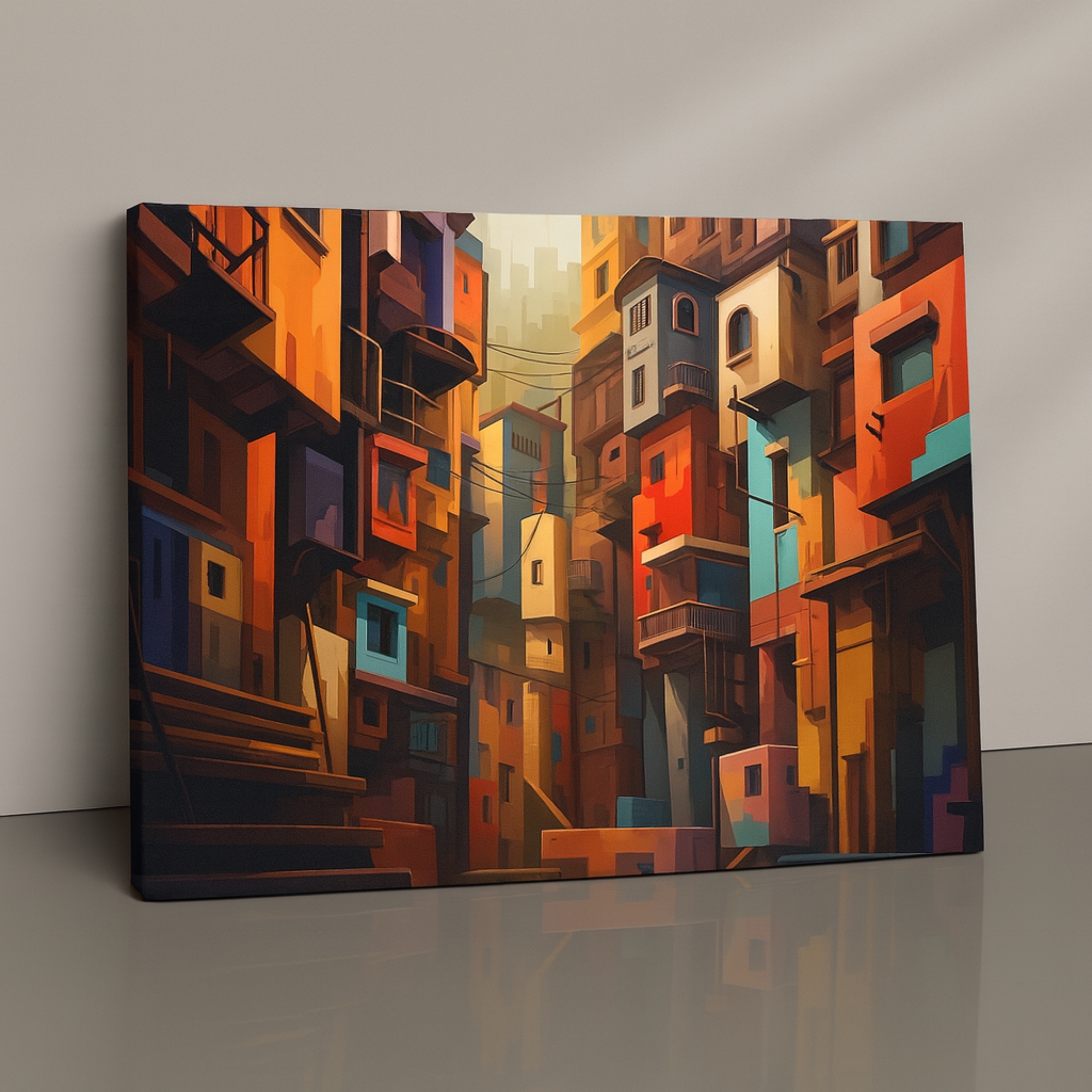 The Ember Cityscape canvas print blends rich oranges, deep reds, and teal accents into a dramatic urban alleyway scene. Perfect for brightening living rooms, nurseries, creative corners, and home offices, this canvas print delivers warmth, balance, and high-end aesthetic appeal. Playful Echoes fits beautifully with pastel décor, Scandinavian themes, and modern abstract styling.