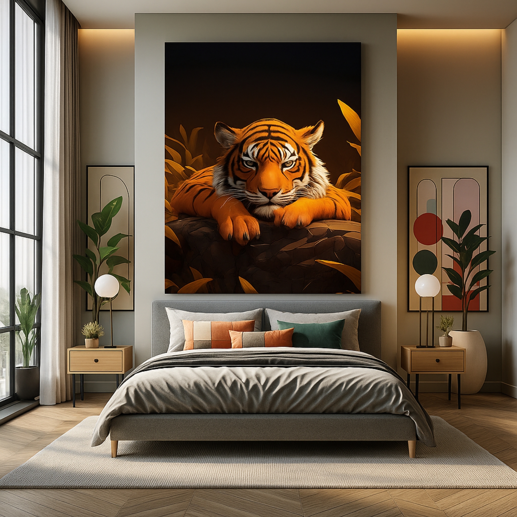 “Ember Gaze” Canvas Print captures a fierce tiger resting atop glowing stones, surrounded by rich golden tones that radiate warmth and power. The deep shadows and striking orange hues evoke primal strength and wild elegance, making this piece perfect for bold interiors, gaming rooms, modern living spaces, and artistic dens.