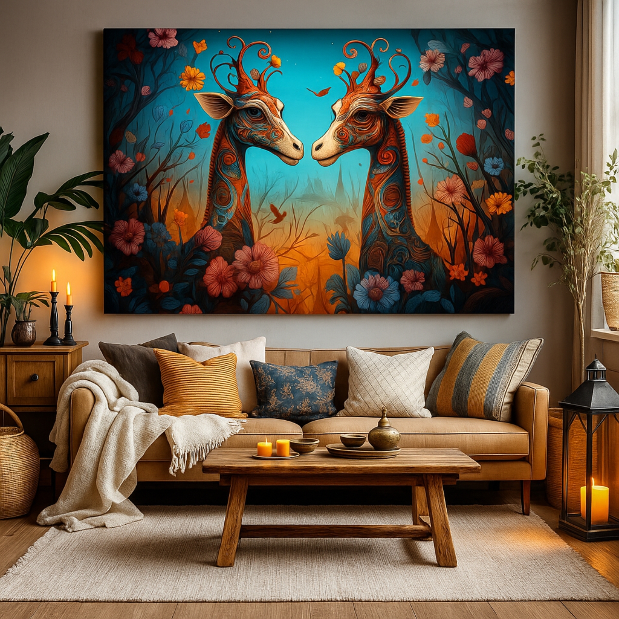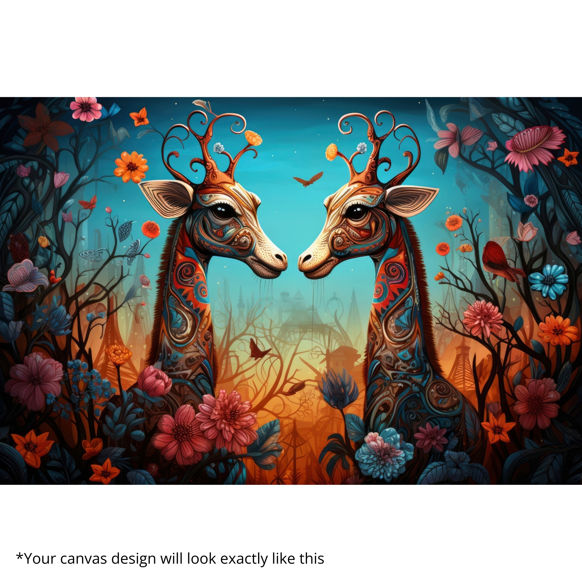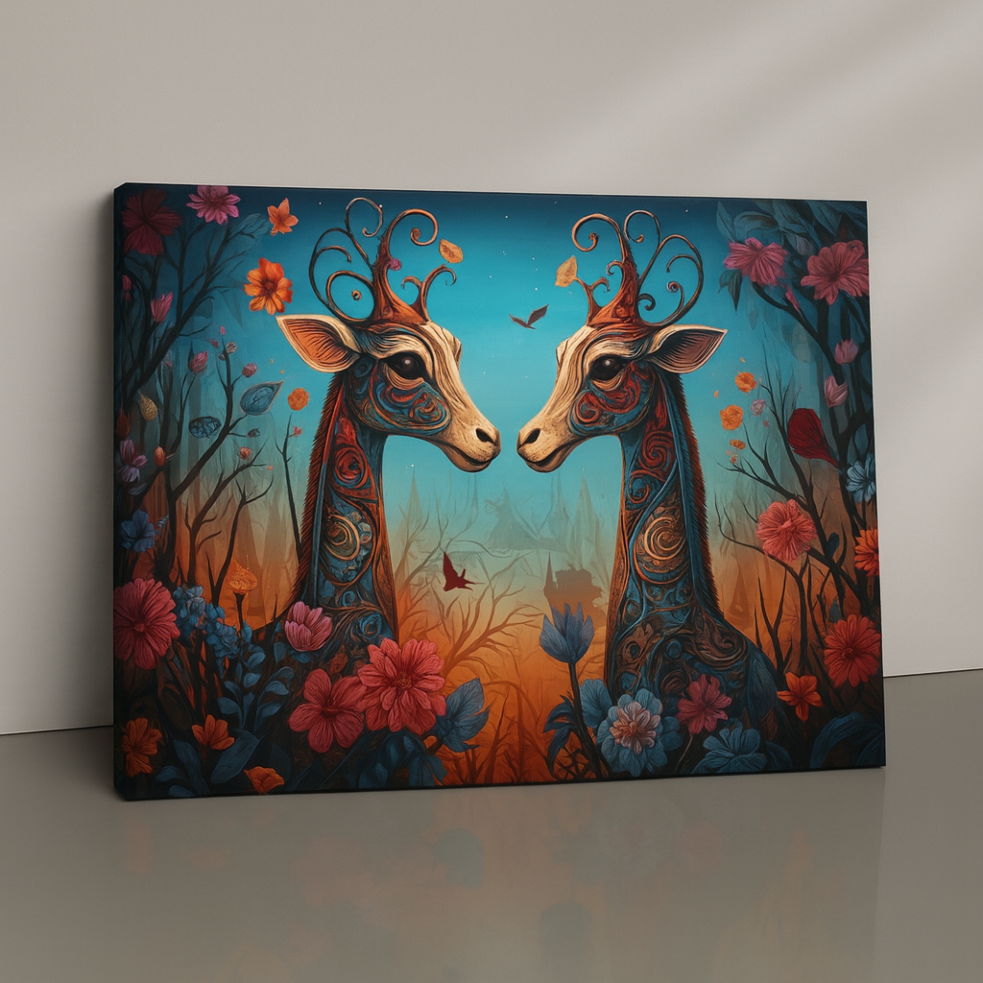 “Enchanted Twins canvas print features two ornate fantasy giraffes surrounded by glowing floral patterns, symbolizing imagination, harmony, and playful wonder. The vibrant colors and dreamy styling make it perfect for kids’ rooms, studios, cafés, and colorful Indian contemporary spaces.