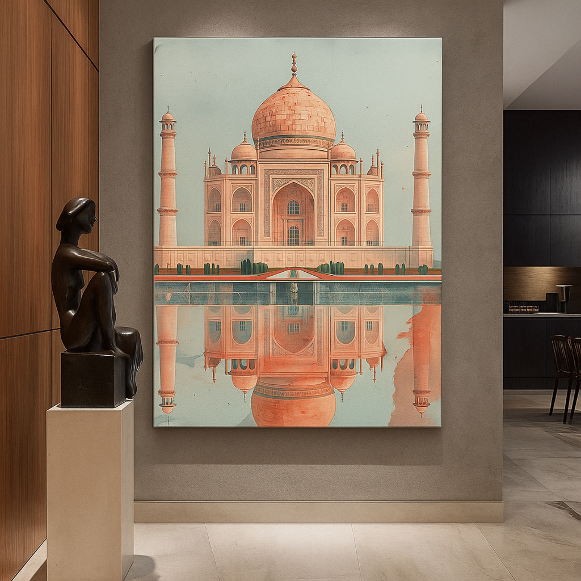 The Eternal Monument Canvas Print pays homage to India’s architectural wonder—the Taj Mahal. Captured in soft hues with its reflection mirrored, this canvas print exudes love, serenity, and grandeur. More than an artwork, it symbolizes devotion and timeless heritage, infusing Mughal elegance into modern interiors. Its serene tones make it versatile for bedrooms, living rooms, or offices.