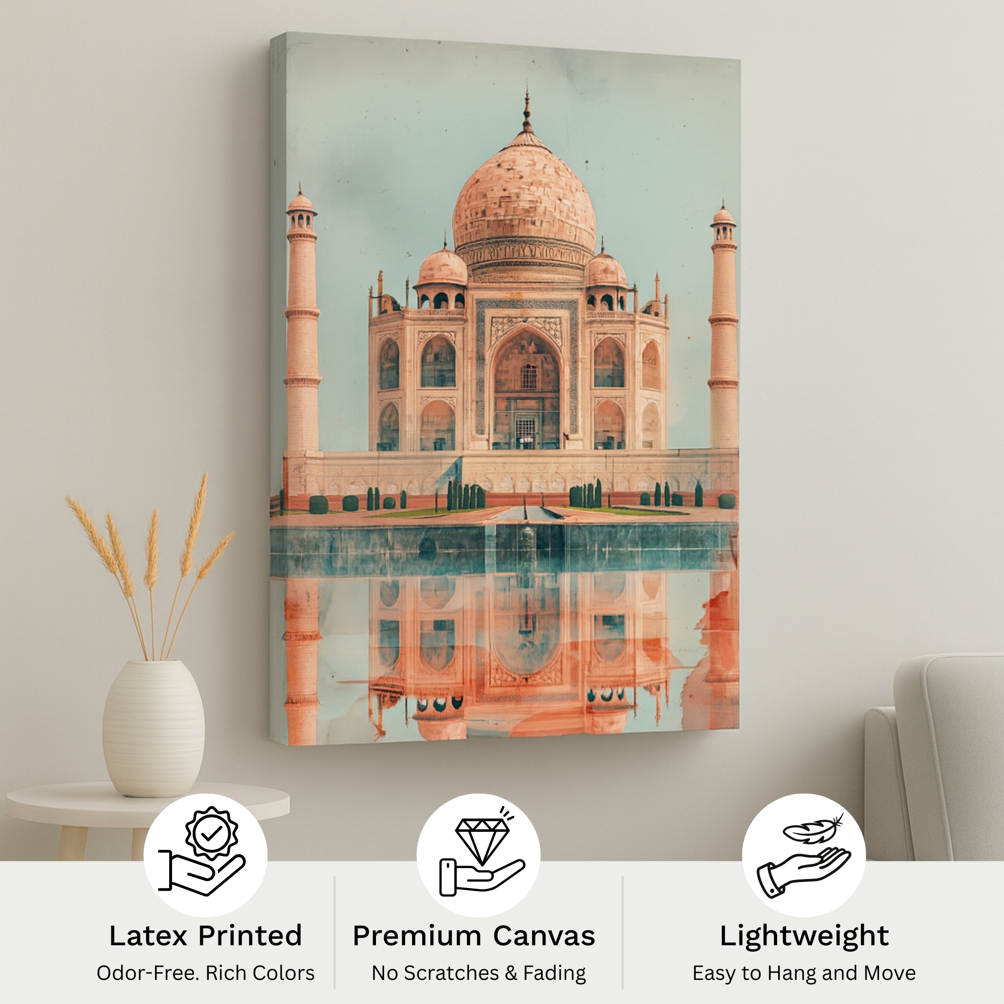 Perfect as a wedding or anniversary gift, this Taj Mahal canvas print combines romance with cultural authenticity. Printed on premium stretched canvas with fade-resistant inks, it ensures long-lasting vibrancy and elegance. Proudly made in India, this canvas wall art carries forward a timeless legacy of love and craftsmanship.