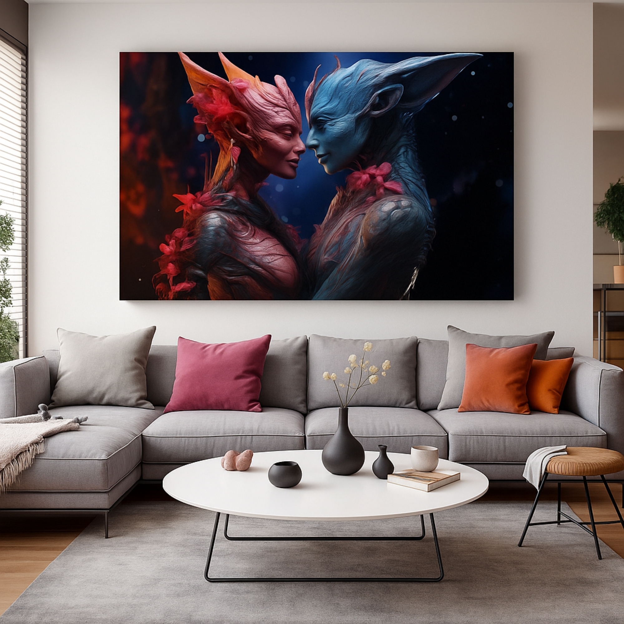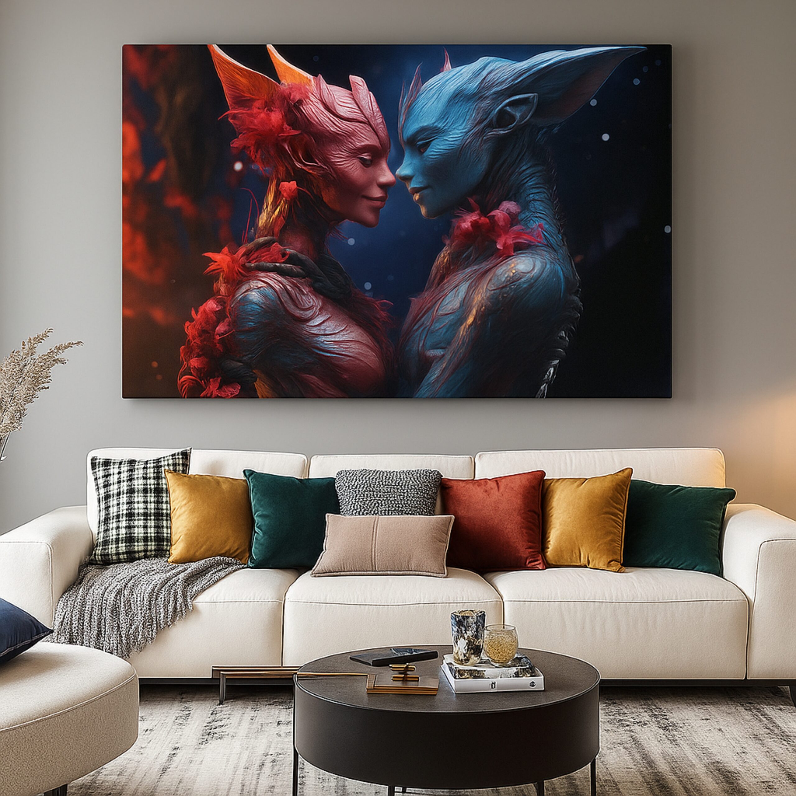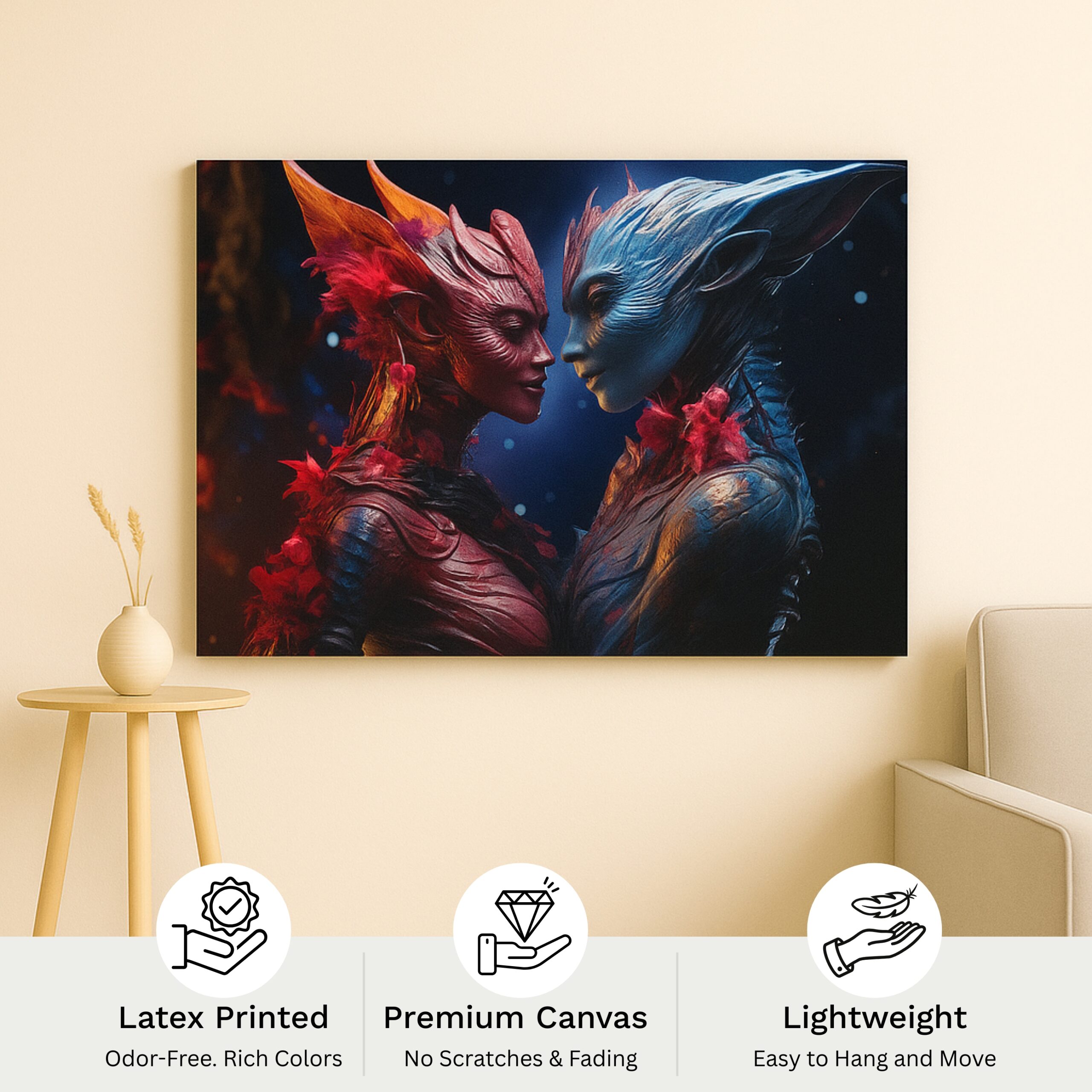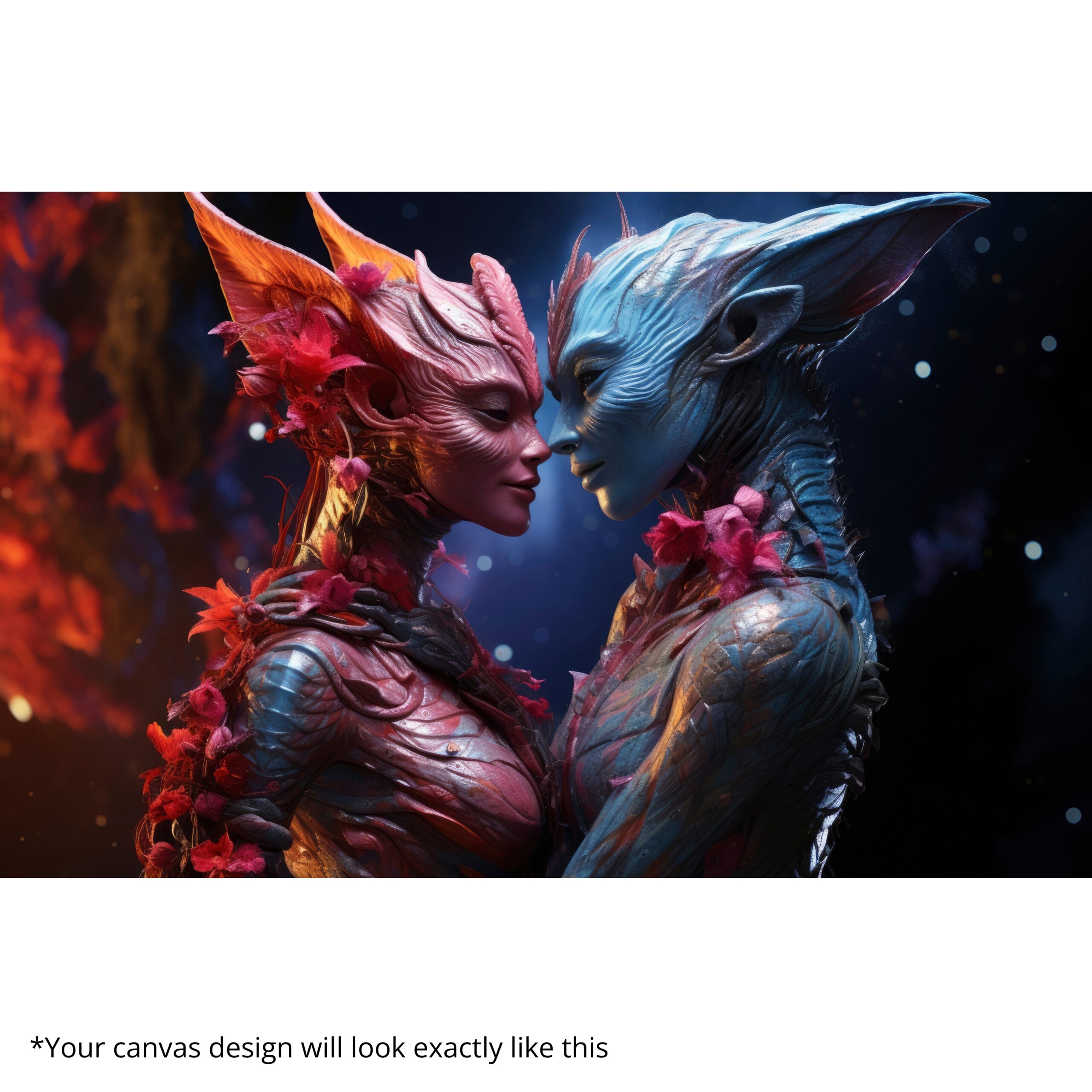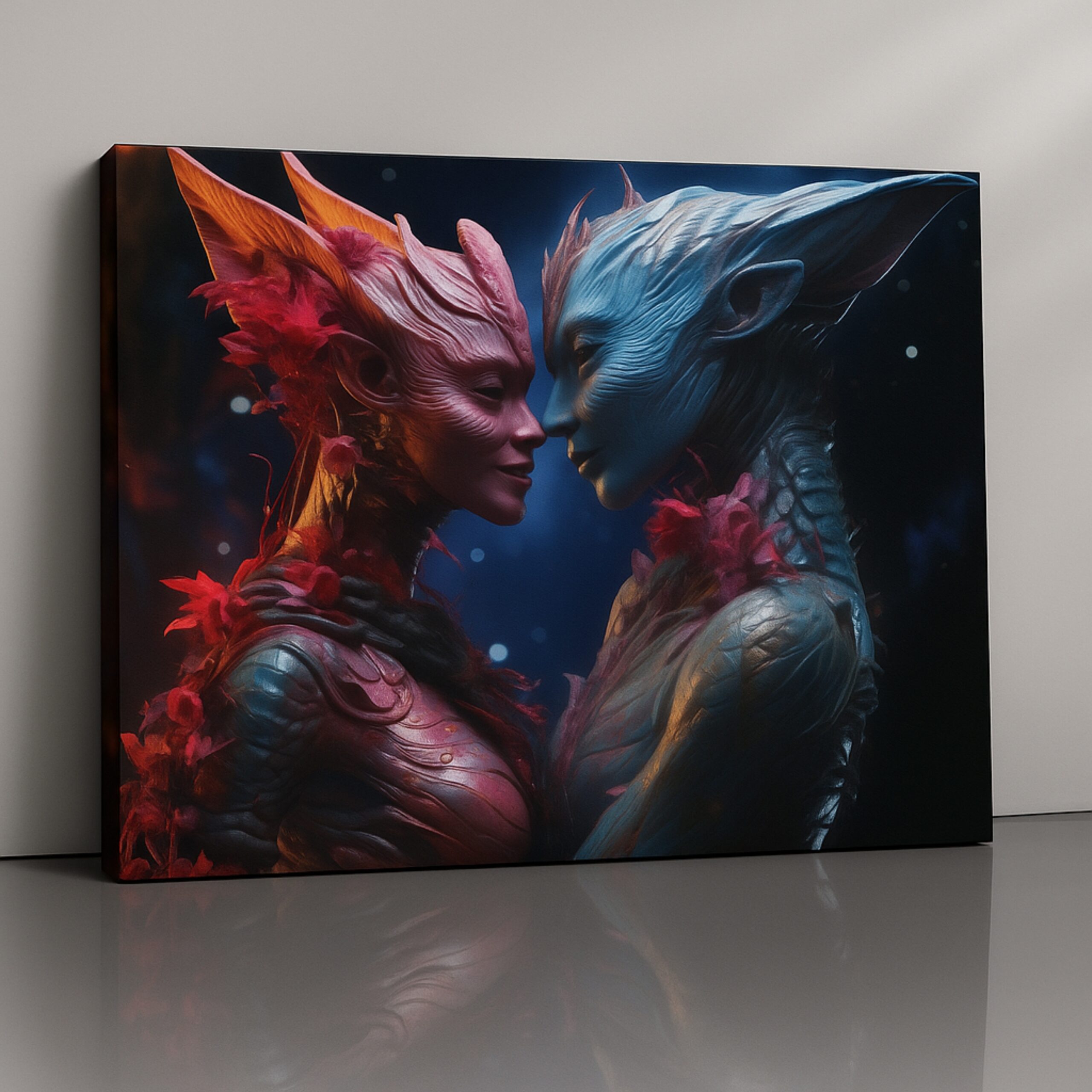 The Etherborn Hearts Canvas Print unveils a surreal love story between two alien beings whose glowing forms—radiant reds and luminous blues—embody unity beyond worlds. With sculptural silhouettes and cosmic textures, this canvas symbolizes harmony, connection, and the beauty of love without boundaries.