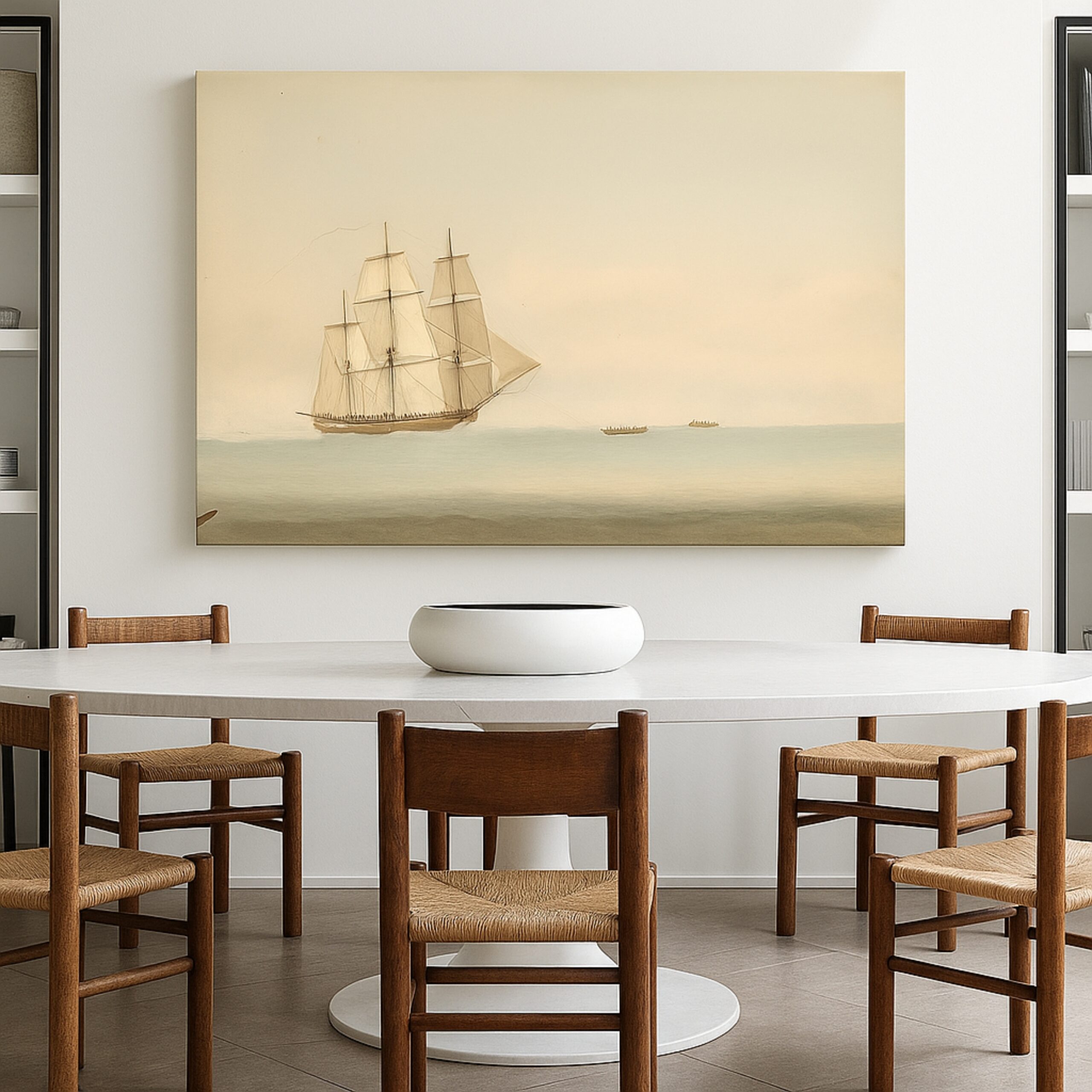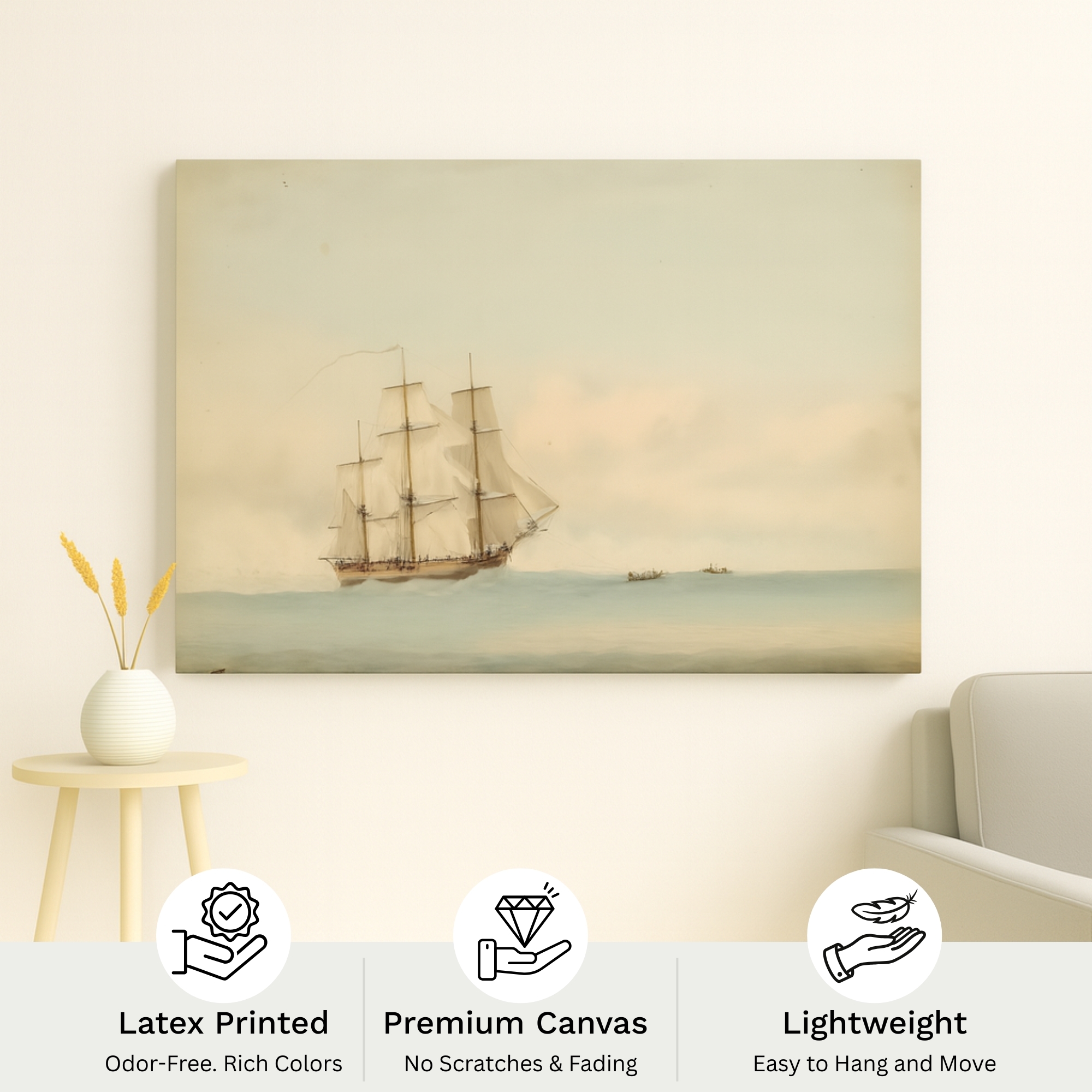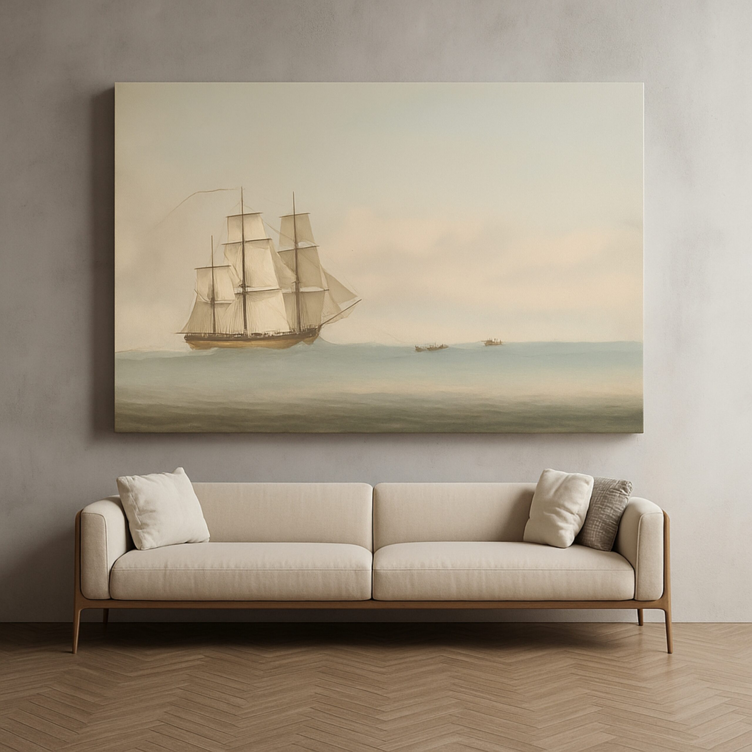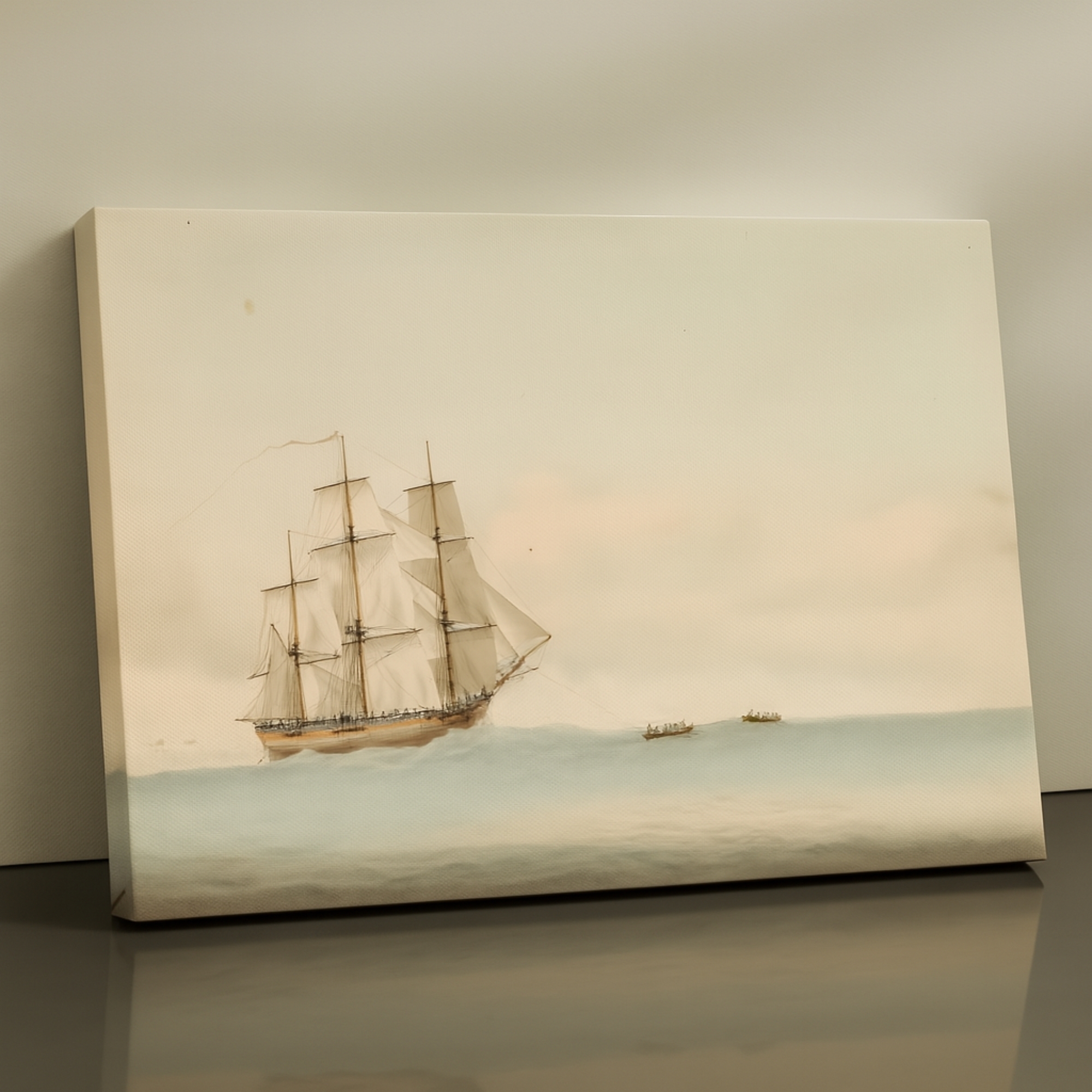 “Etherbound Vessel” Canvas Print celebrates the romance of the sea with a timeless sailing ship drifting across calm waters. Painted in soft pastels and neutrals, it balances nostalgia with openness, evoking voyages of discovery and poetic solitude. The gentle palette adds grace, making it suitable for both classic and modern interiors. This nautical artwork symbolizes courage, exploration, and the allure of distant horizons.