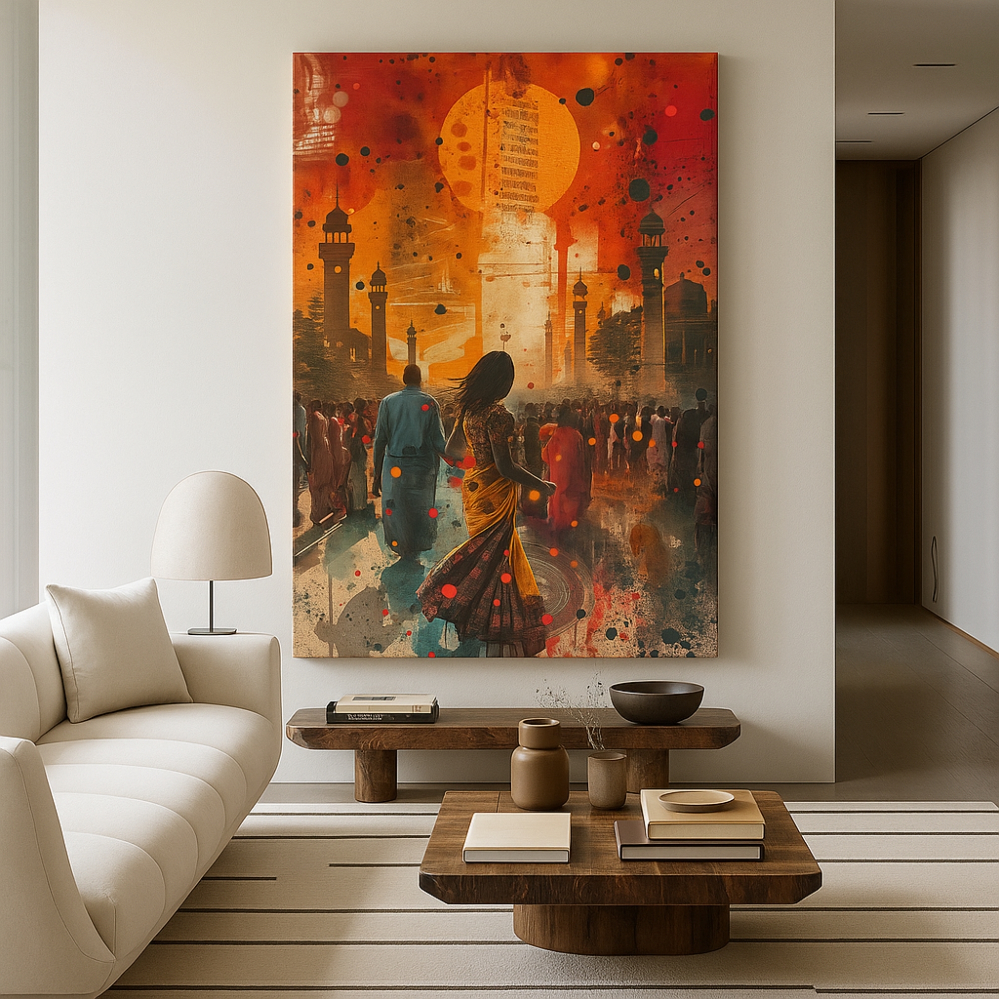 The Festival Dawn Canvas Print is an explosion of color and joy, capturing the vibrant spirit of Indian festivals at first light. Glowing oranges and reds dance with lively silhouettes to symbolize celebration, community, and cultural unity. This dynamic wall art brings a festive pulse to modern interiors, transforming blank walls into statements of energy and optimism. The abstract strokes and radiant light feel contemporary yet soulful, making this canvas print equally suited to homes, cafés, and creative spaces.