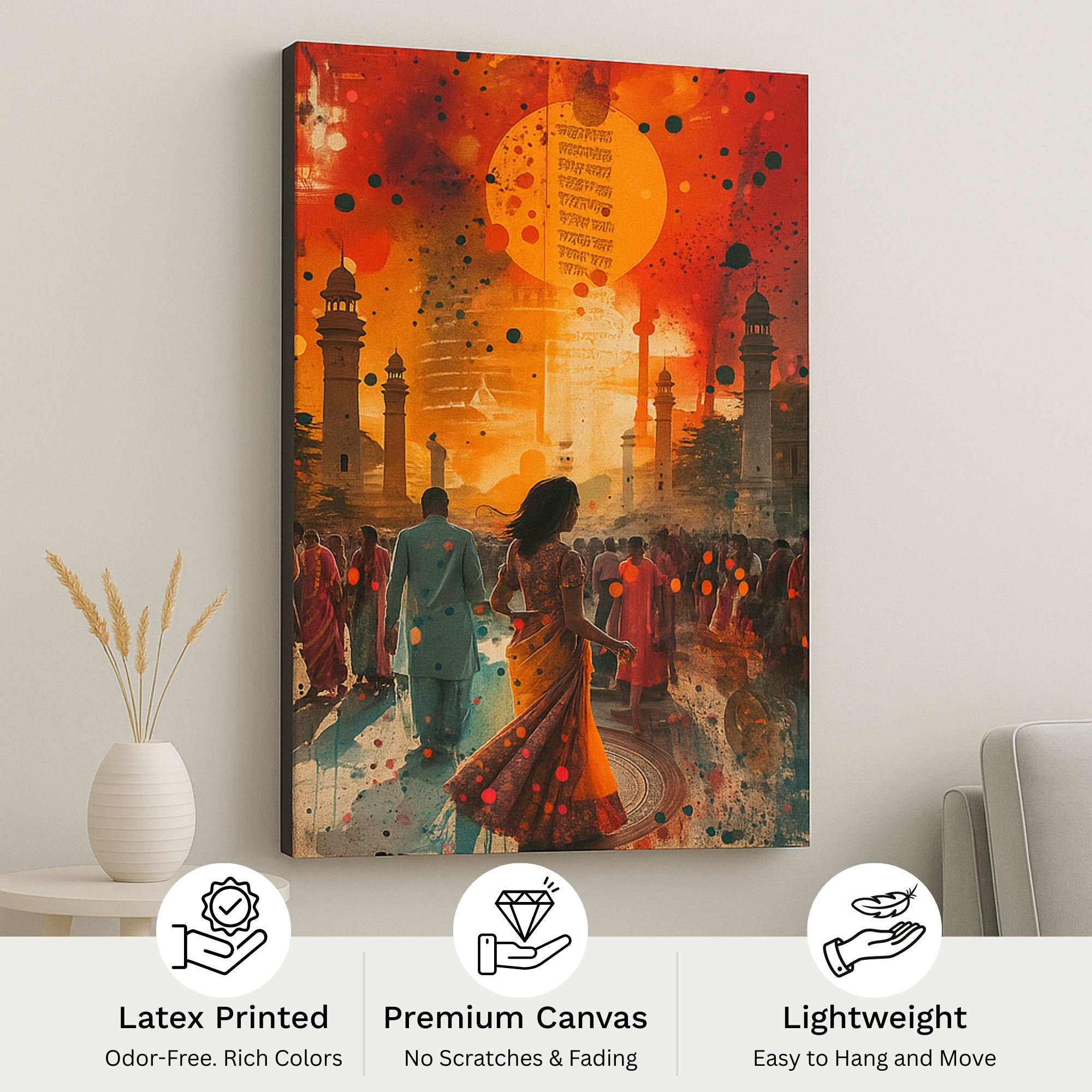Style it above a sofa or console to amplify warmth, or place the canvas in lounges and offices to spark conversation and cultural pride. This festival canvas print also makes a thoughtful gift during Diwali, Holi, and family occasions. Printed on premium stretched canvas with fade-resistant inks, it offers long-lasting brilliance and easy upkeep. Proudly made in India, this canvas wall art blends modern décor with timeless celebration.
