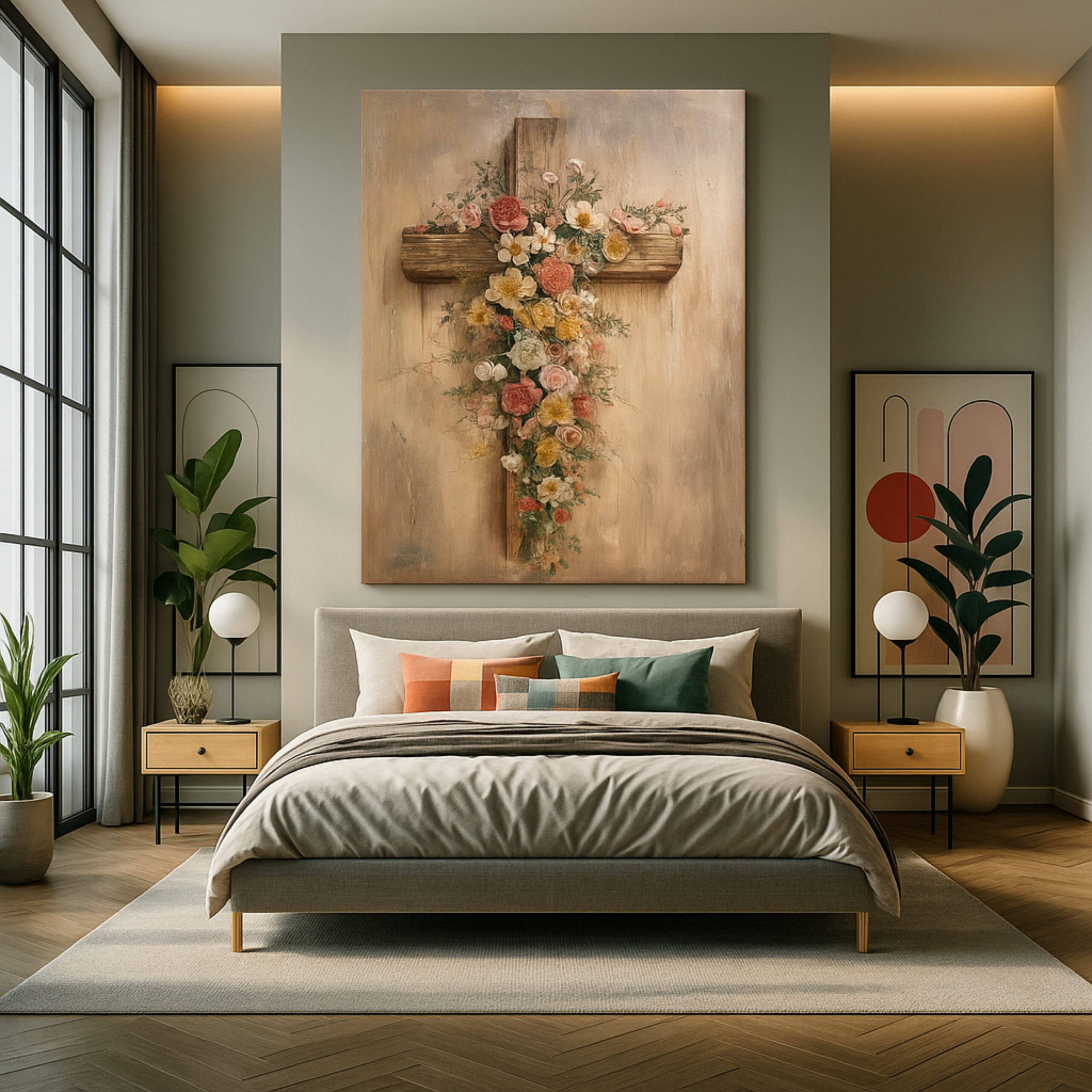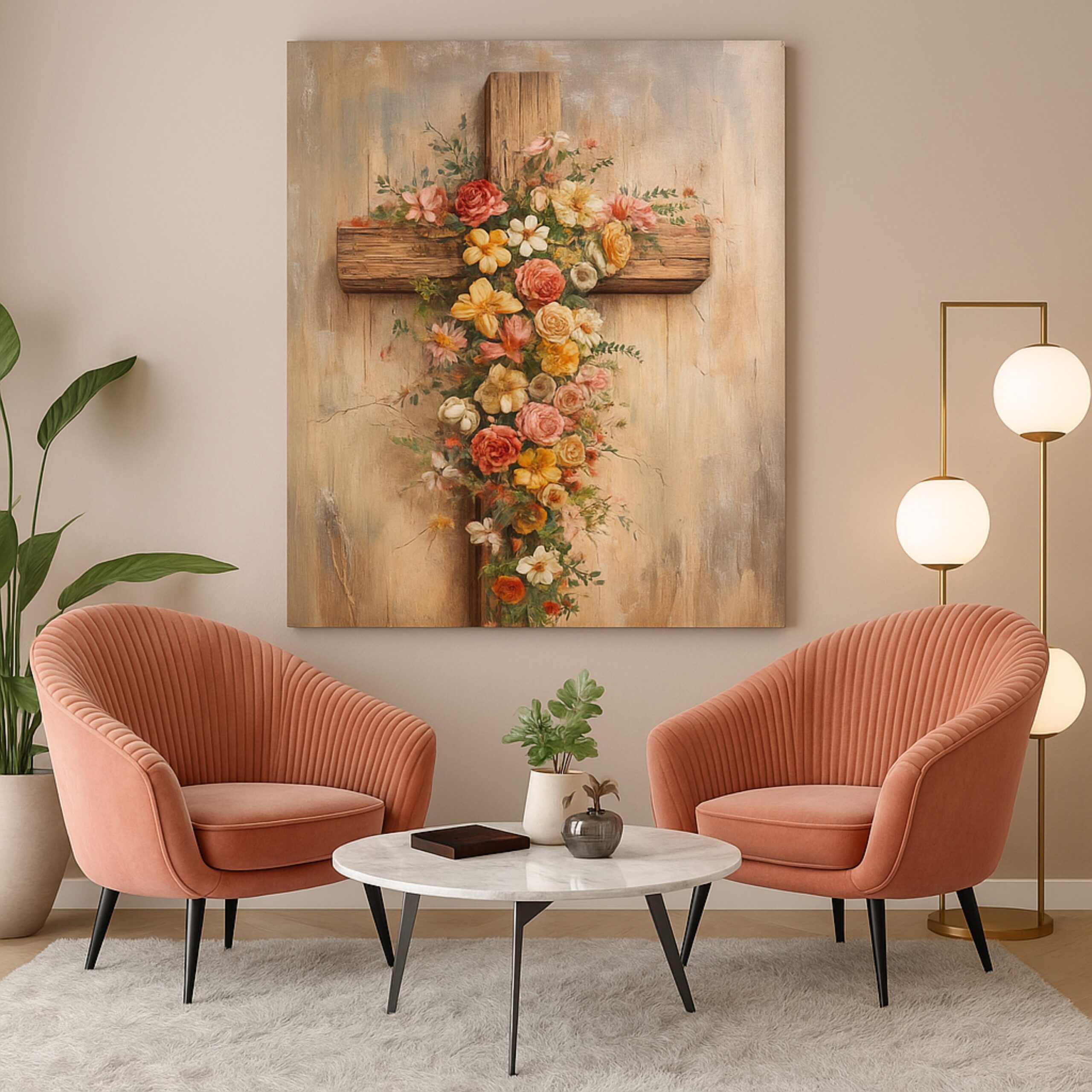 Canvas Print of  “Floral Benediction” is a divine celebration of faith and renewal, depicting a wooden cross adorned with blooming flowers. The radiant blossoms symbolize life, hope, and rebirth, creating a comforting presence in every home. This Christian wall art combines rustic textures with soft floral tones, ideal for prayer rooms, bedrooms, or living spaces that reflect devotion and warmth.