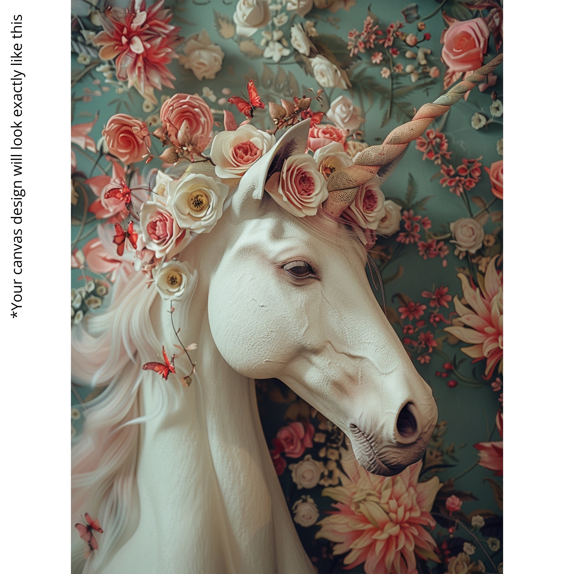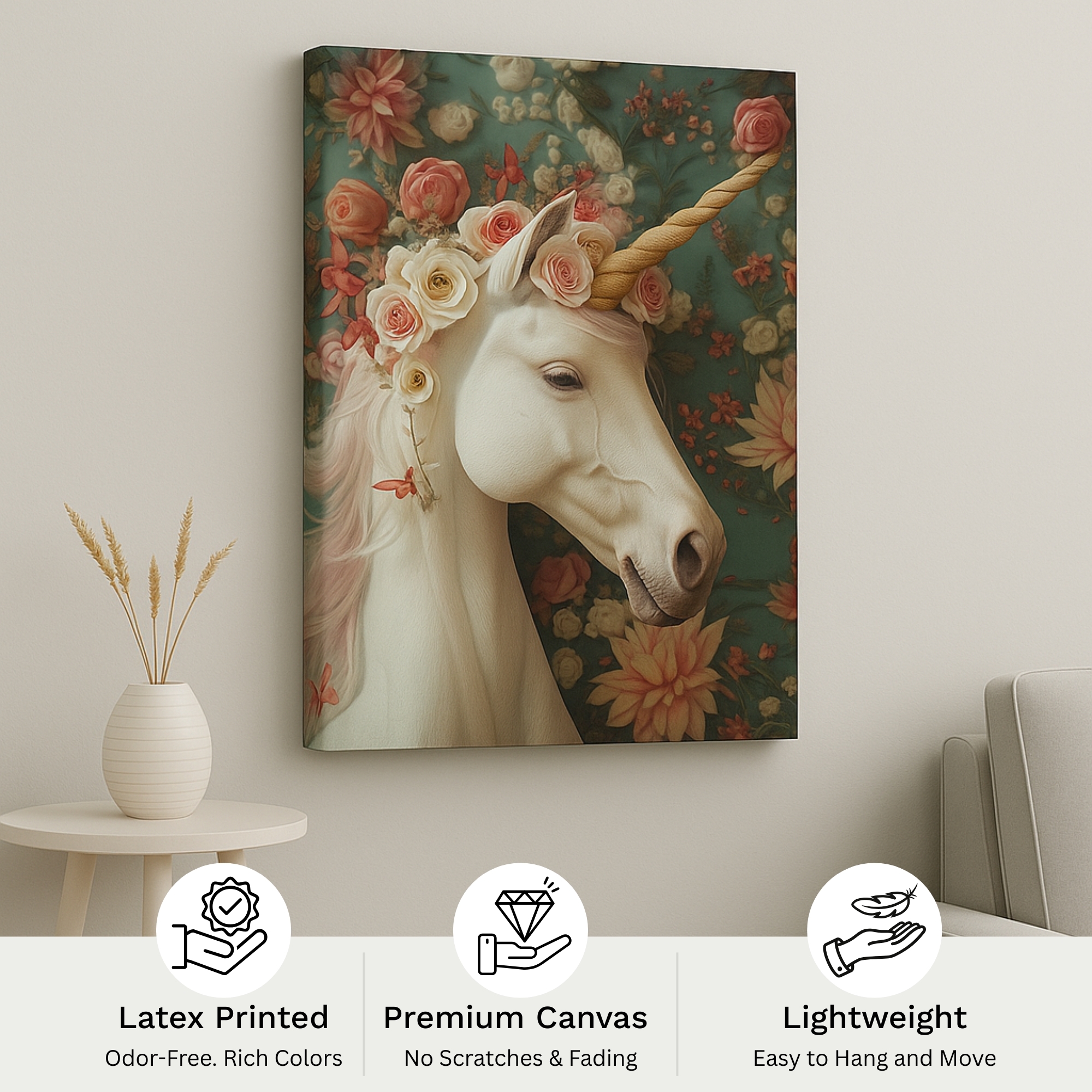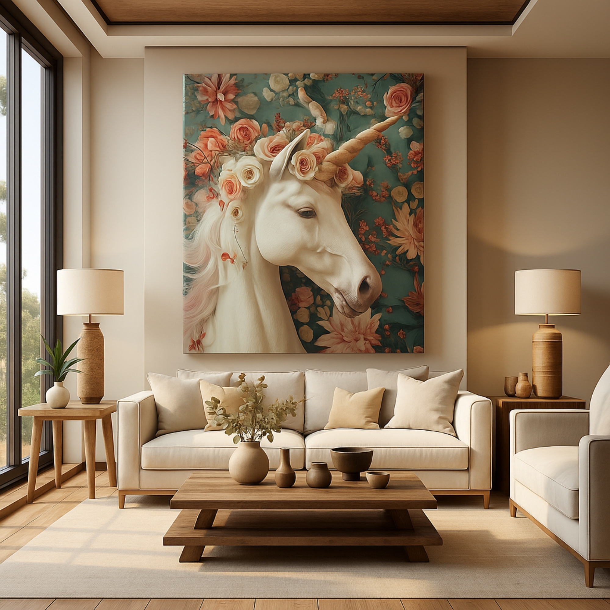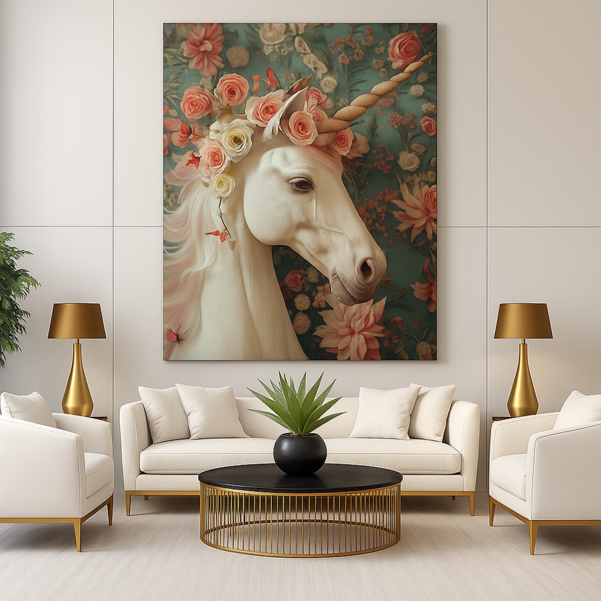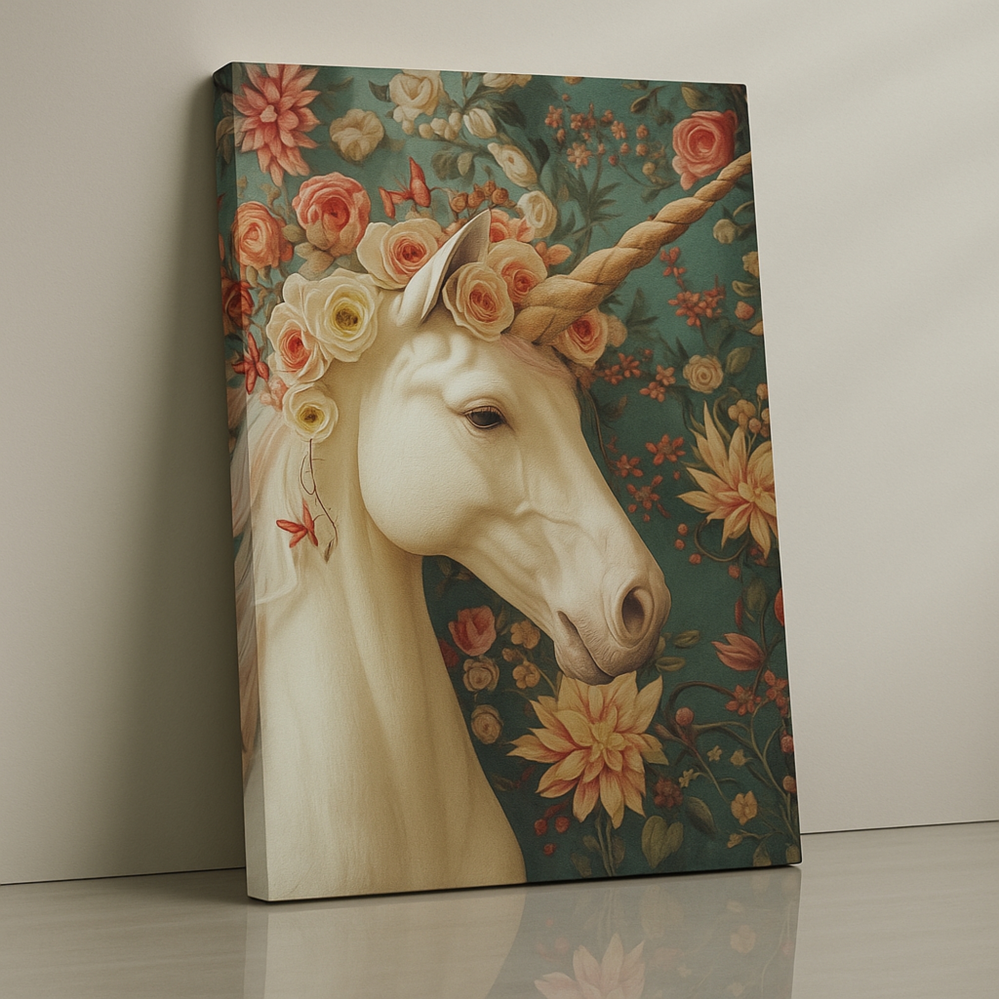 “Floral Unicorn” Premium Canvas Print brings a soft, fantasy-inspired charm to any room. This beautifully illustrated unicorn, adorned with blooming flowers, features gentle pastel tones, dreamy composition, and elegant textures—creating a soothing, magical atmosphere ideal for whimsical and creative spaces.