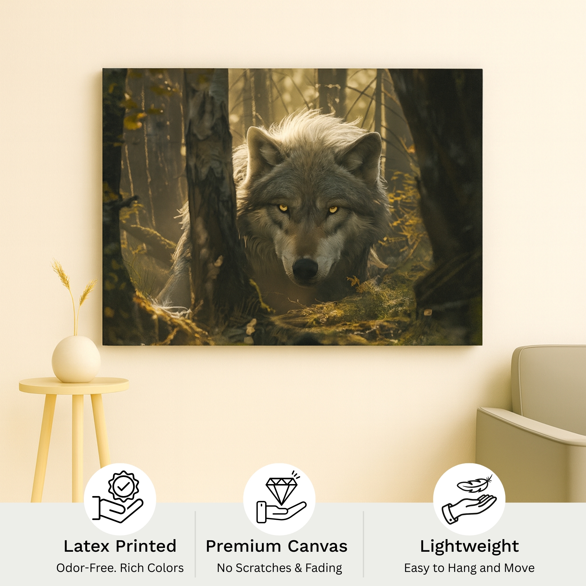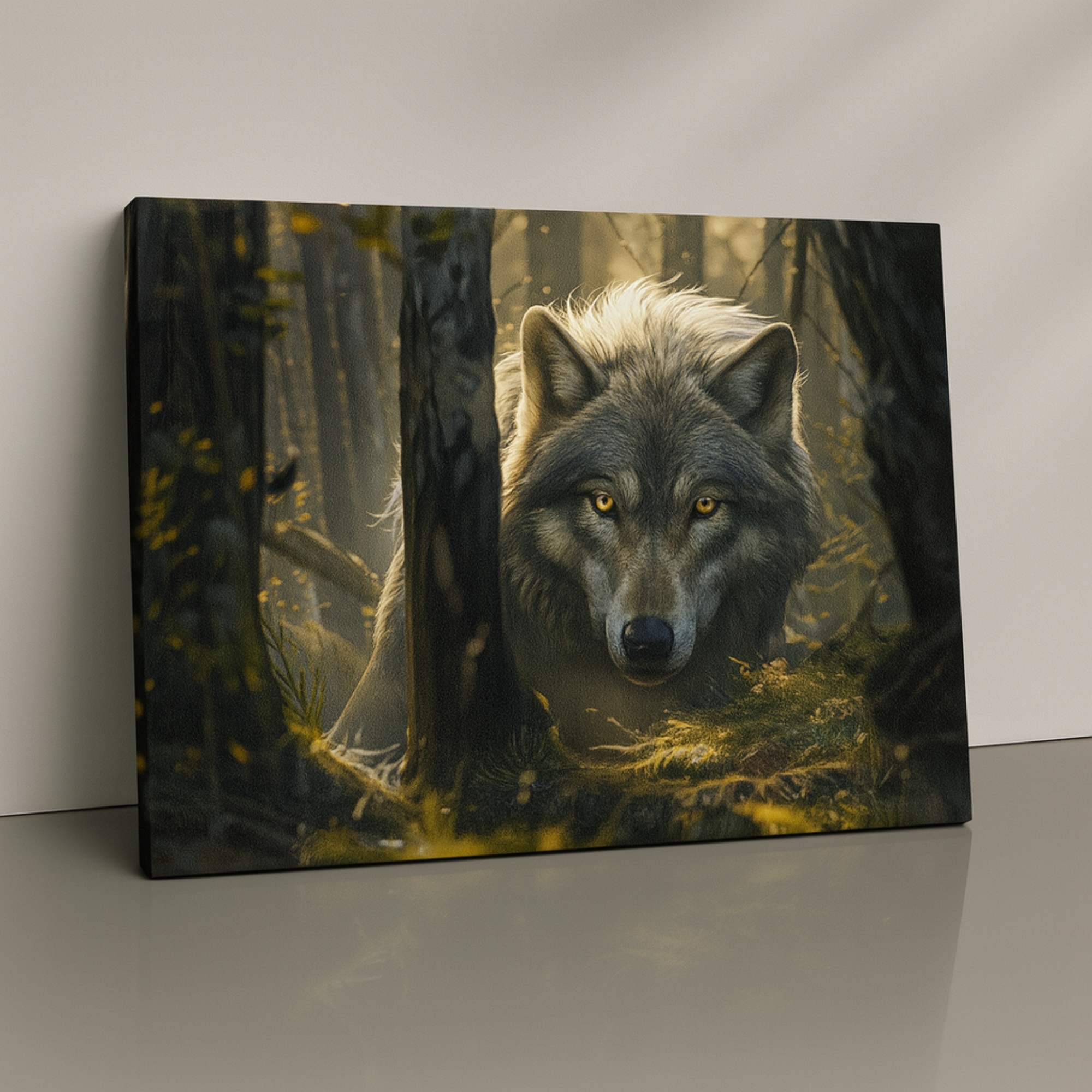 “The Forest Phantom canvas print brings the raw spirit of the wilderness into your home. A lone wolf steps out of the misty forest glow, symbolizing instinct, courage, and untamed freedom. The deep earthy contrasts and cinematic shadows make this artwork a powerful statement piece for rustic, modern, or nature-inspired Indian interiors.