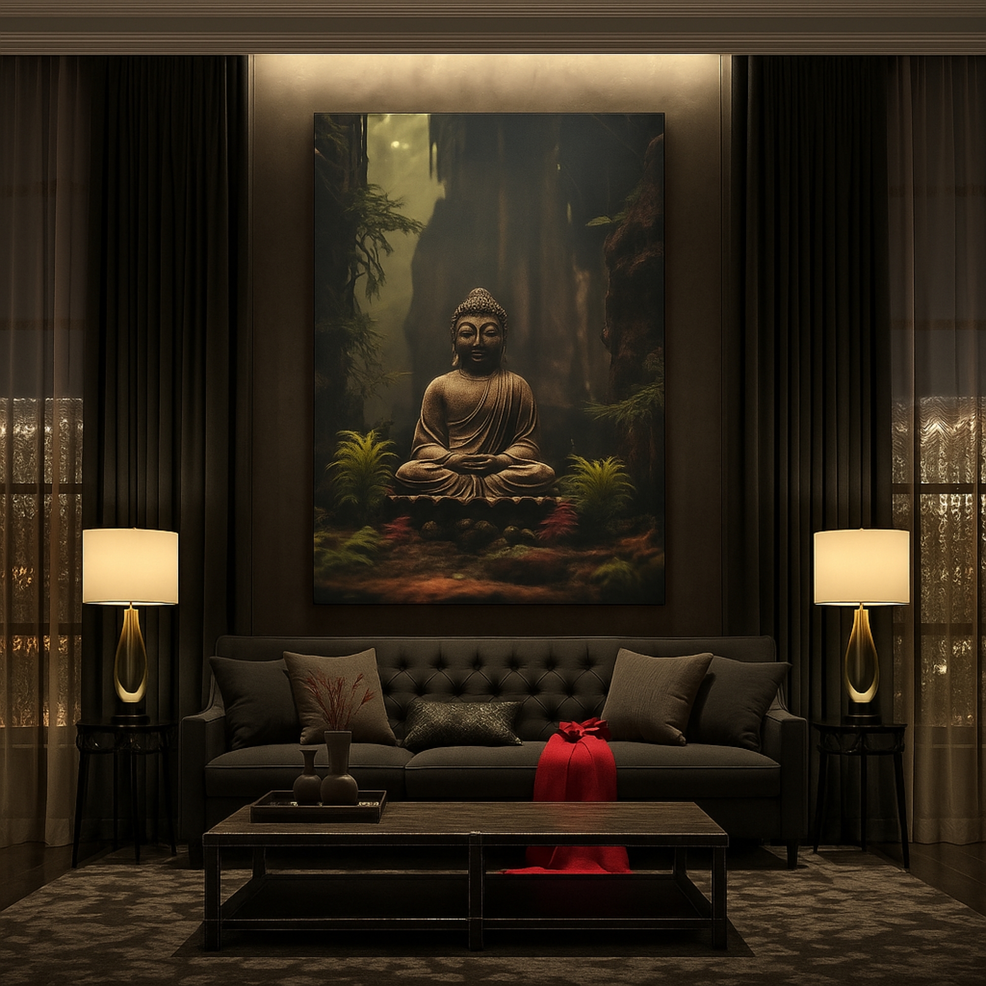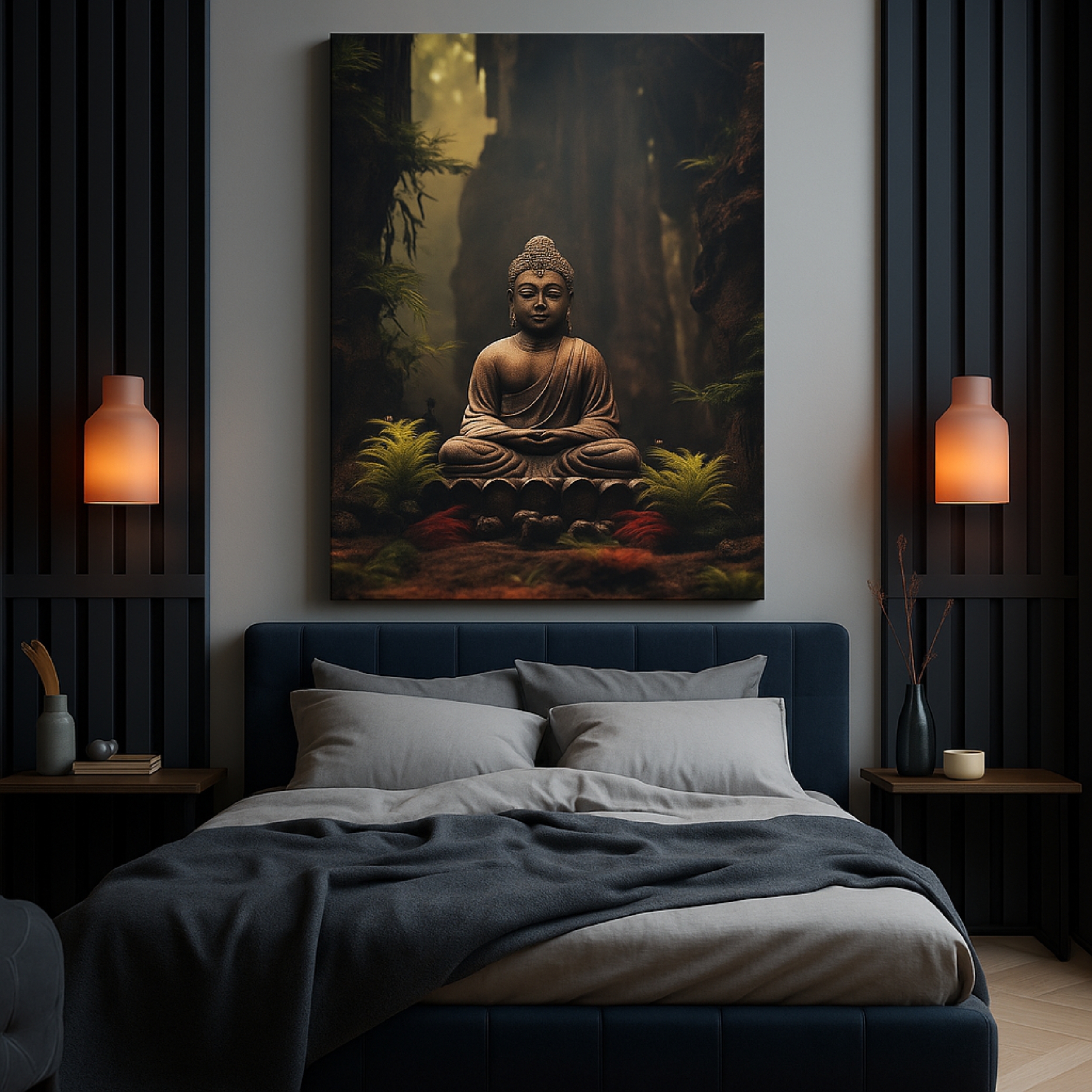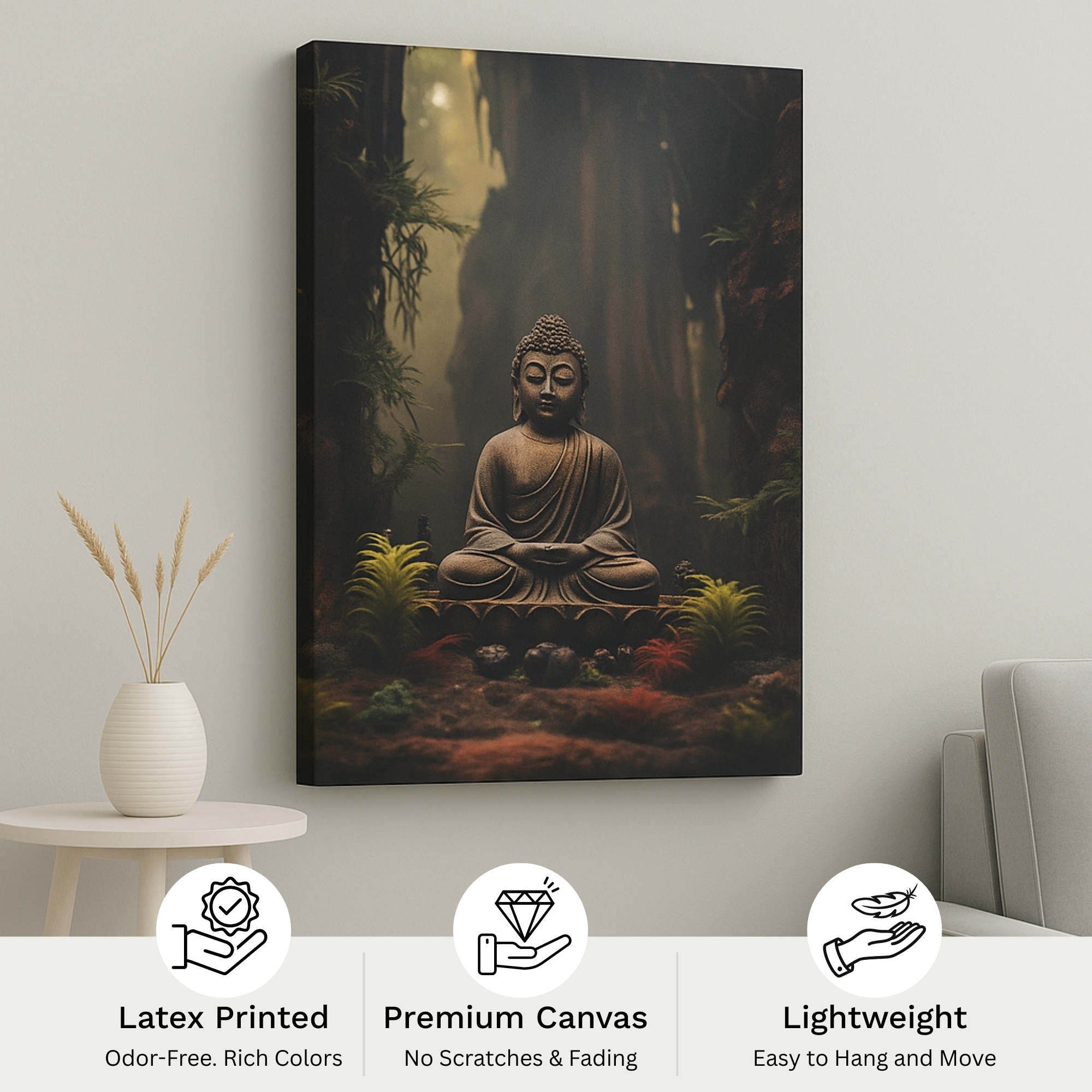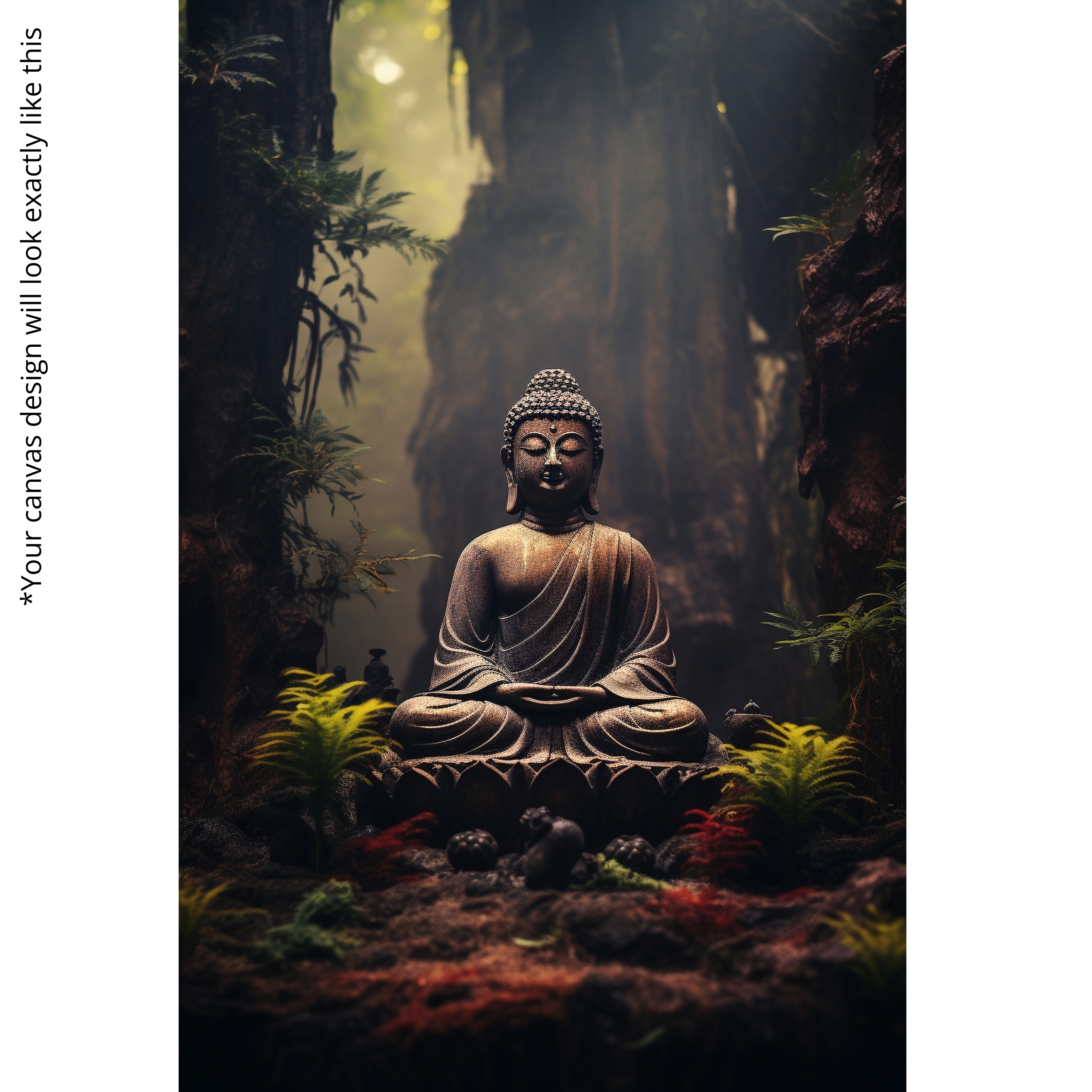 “Forest Silence” is a serene Buddha Canvas Print depicting Buddha meditating in a tranquil forest clearing. Earthy green tones, moss textures, and a natural woodland backdrop create grounding calm and spiritual depth. This artwork unites mindfulness with nature, making it a soulful choice for interiors seeking stillness, balance, and harmony.