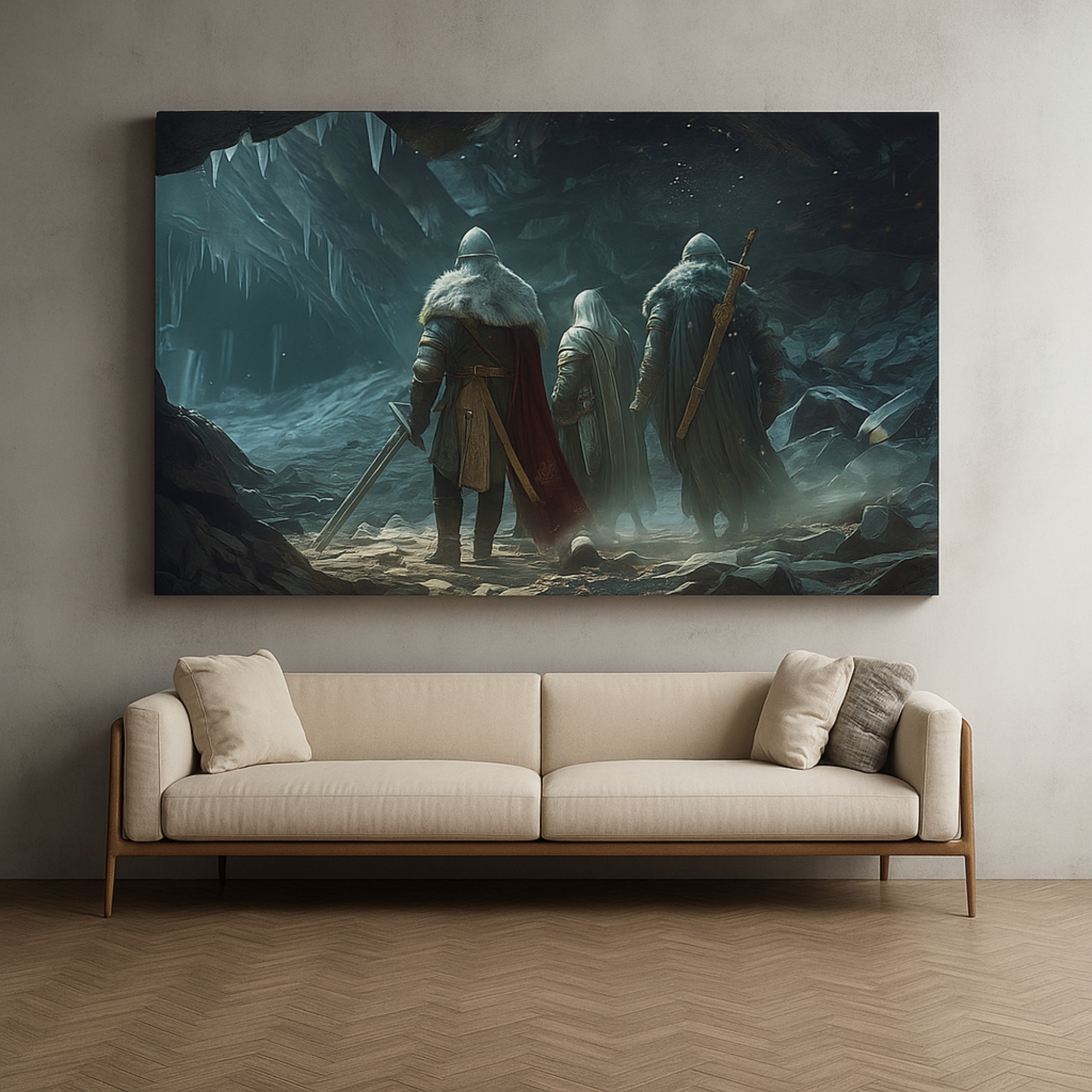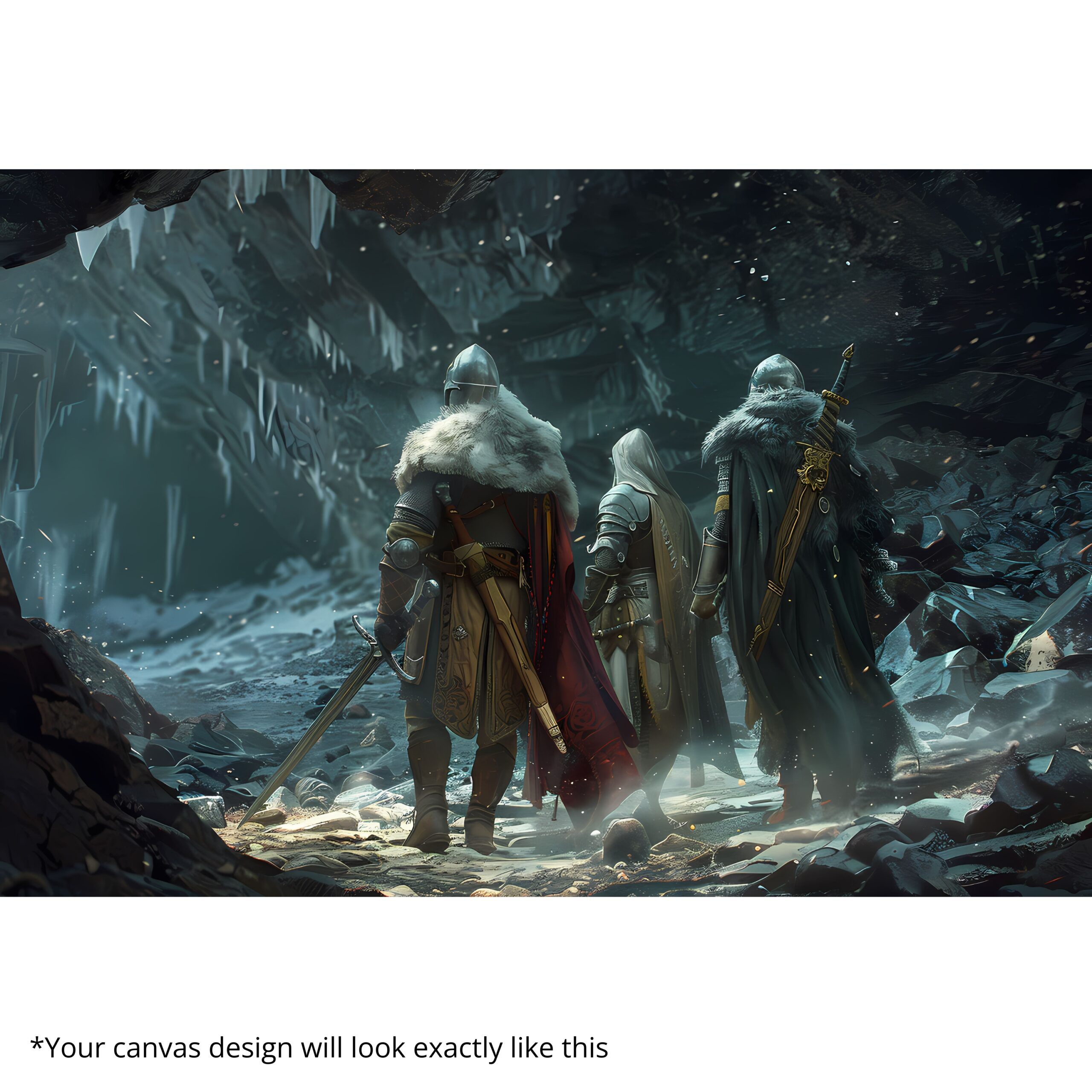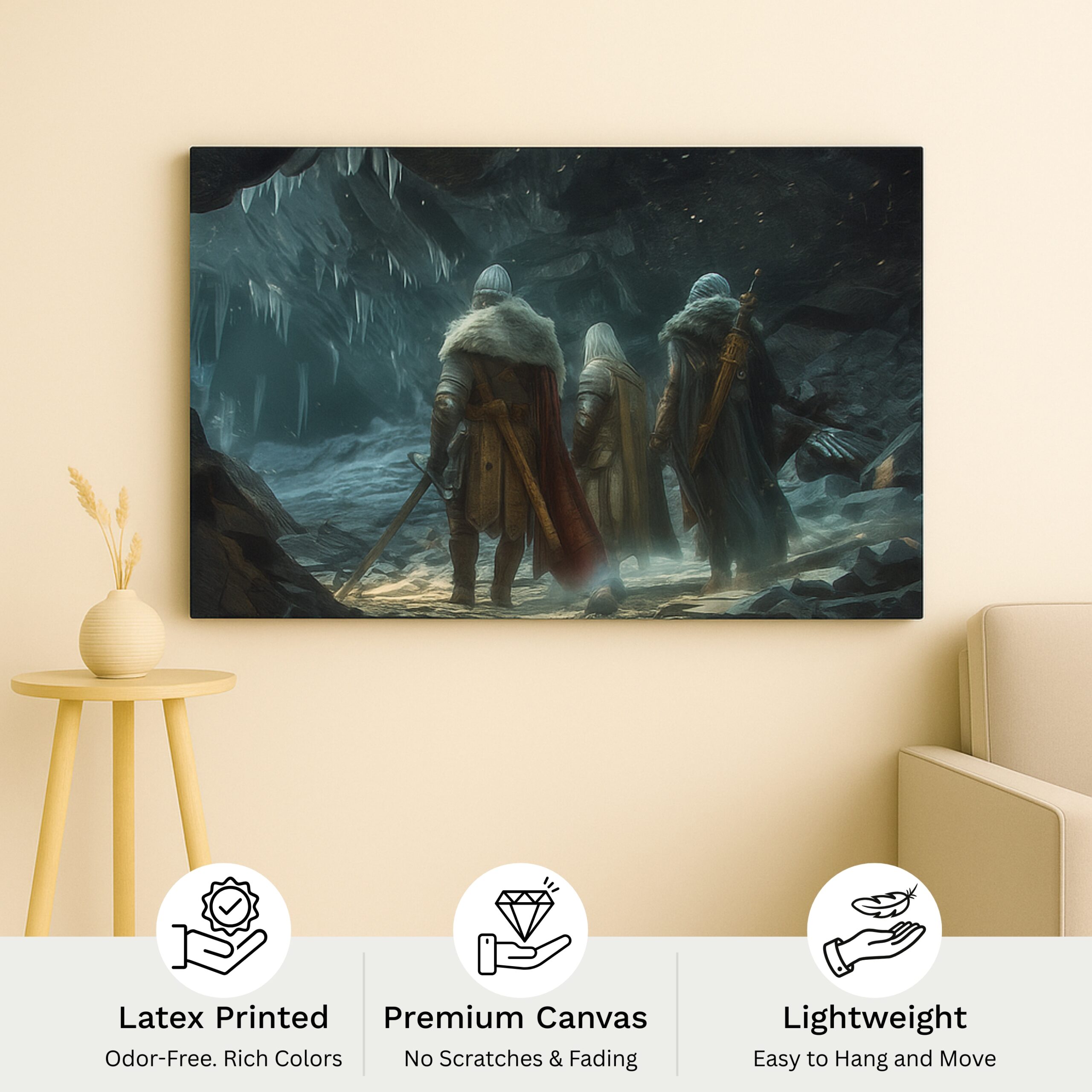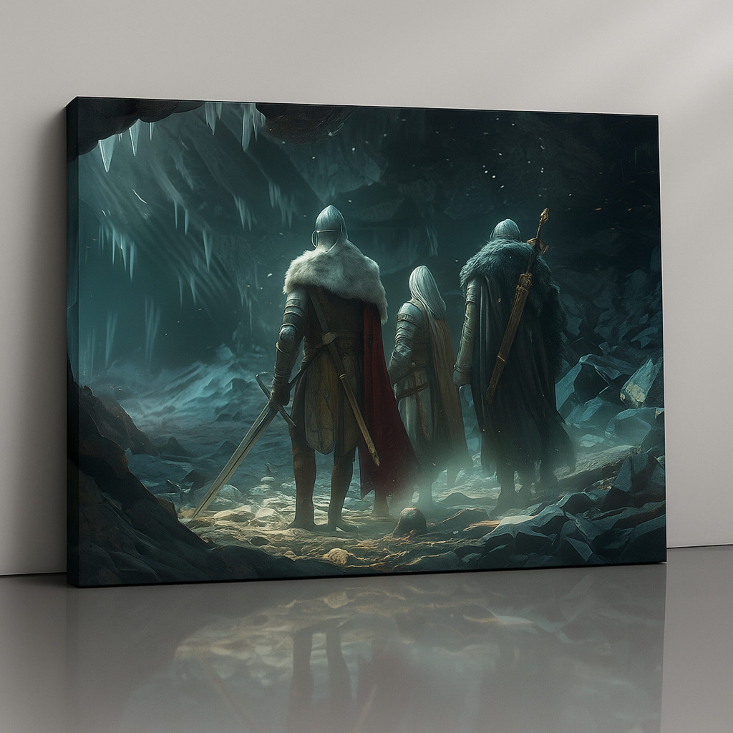 The Frostborne Depths Canvas Print draws you into a chilling underworld where armored adventurers venture into an icy cavern of mystery. Frosty blues, rugged textures, and stoic silhouettes evoke resilience and courage against the unknown, giving modern interiors an epic narrative and striking aesthetic. .