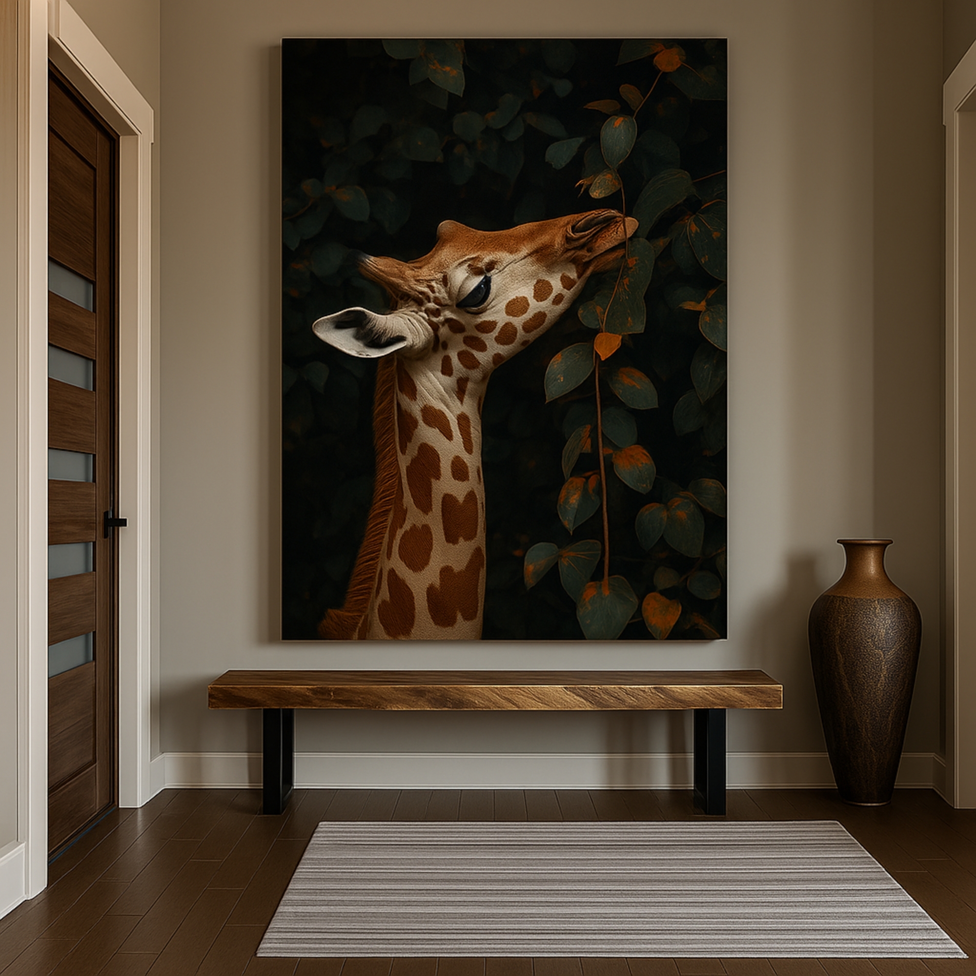 The Gentle Forager Canvas Print features a peaceful giraffe enjoying leaves in a warm, softly lit forest. Rich browns, warm highlights, and natural depth create a soothing wildlife scene ideal for earthy interiors, boho rooms, nurseries, or calm living spaces. This artwork reflects curiosity, softness, and the quiet rhythm of nature.