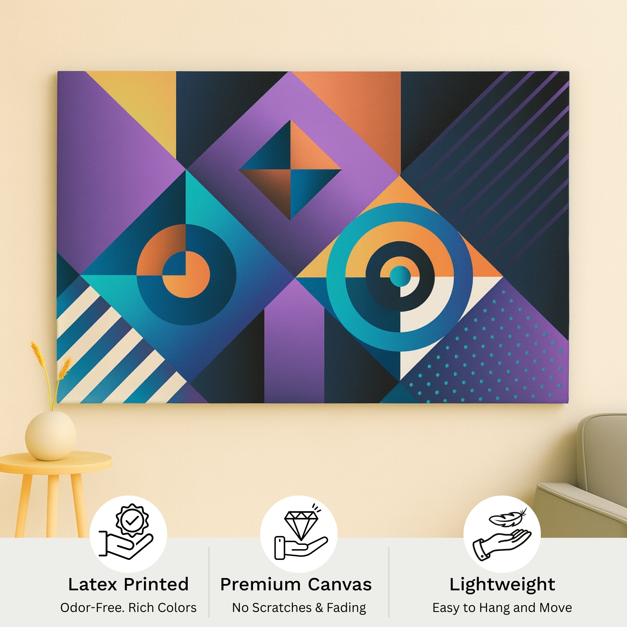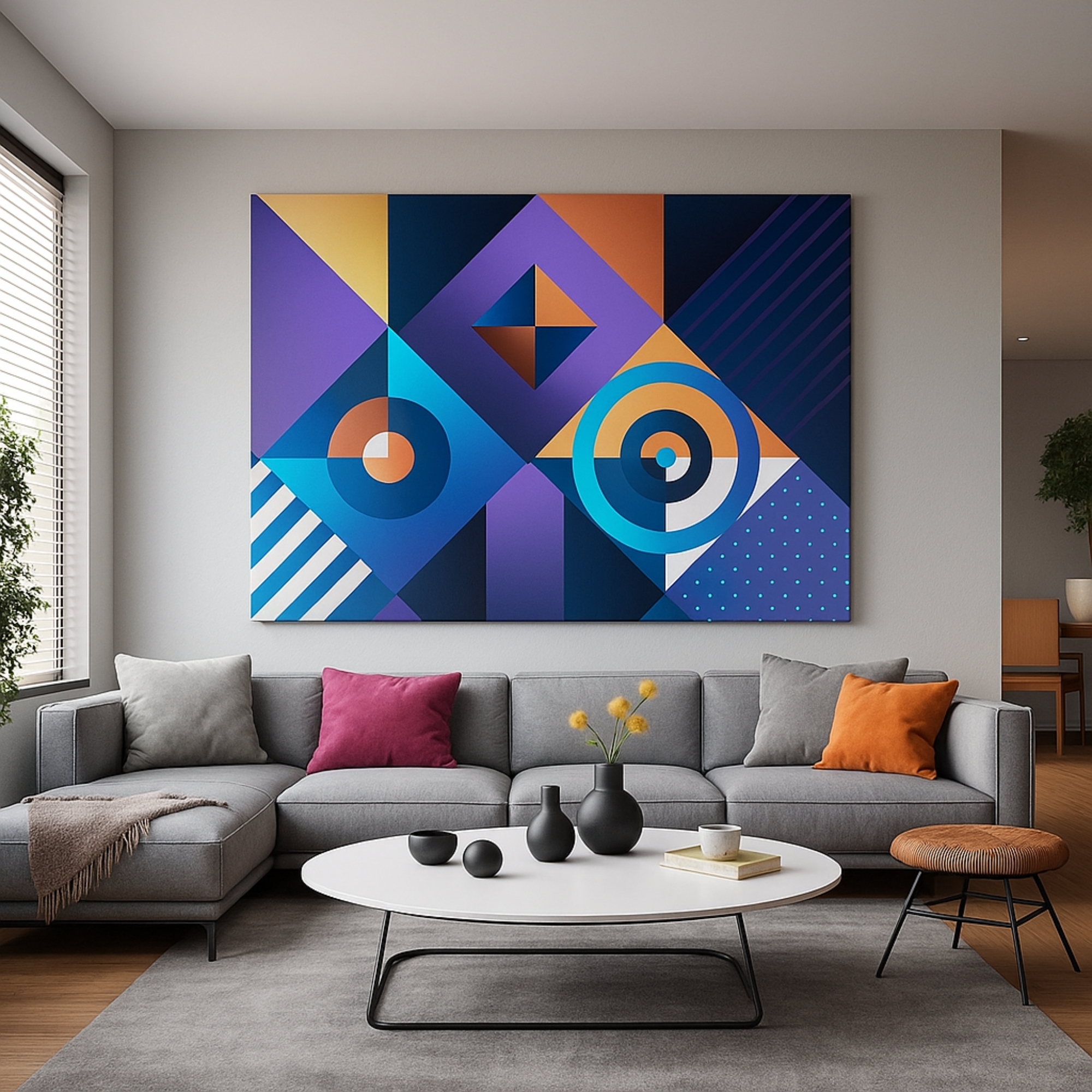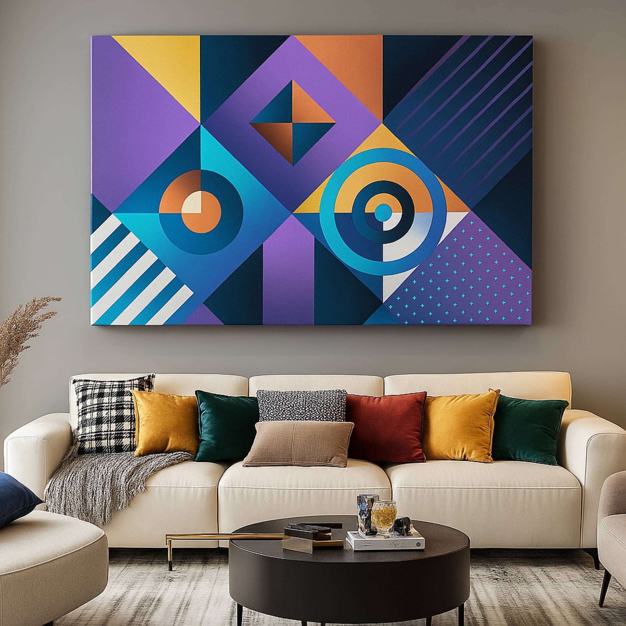 The Geometric Pulse canvas print brings bold retro-inspired shapes, layered symmetry, and high-contrast color geometry designed to enhance stylish contemporary spaces. Perfect for brightening living rooms, nurseries, creative corners, and home offices, this canvas delivers warmth, balance, and high-end aesthetic appeal. Playful Echoes fits beautifully with pastel décor, Scandinavian themes, and modern abstract styling.