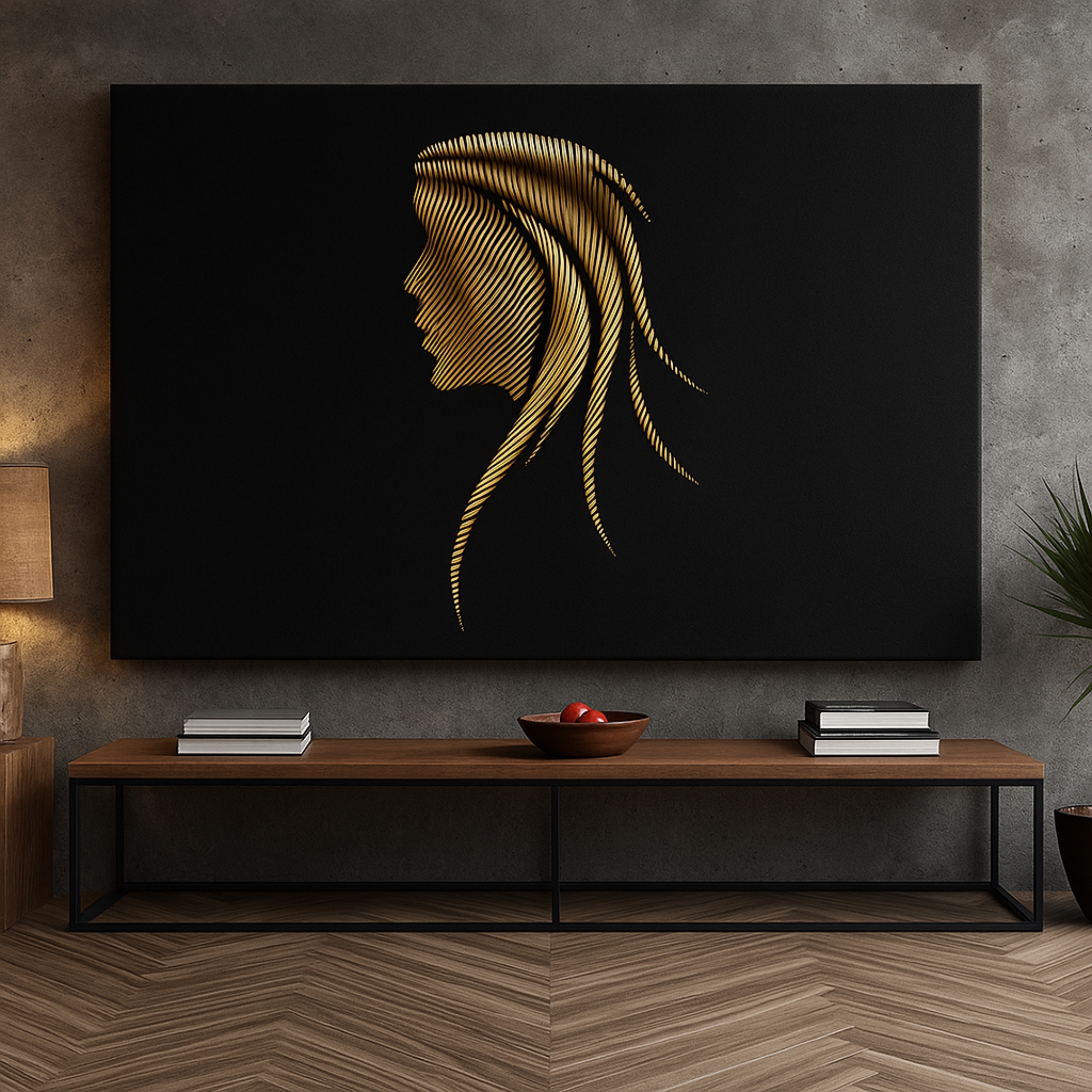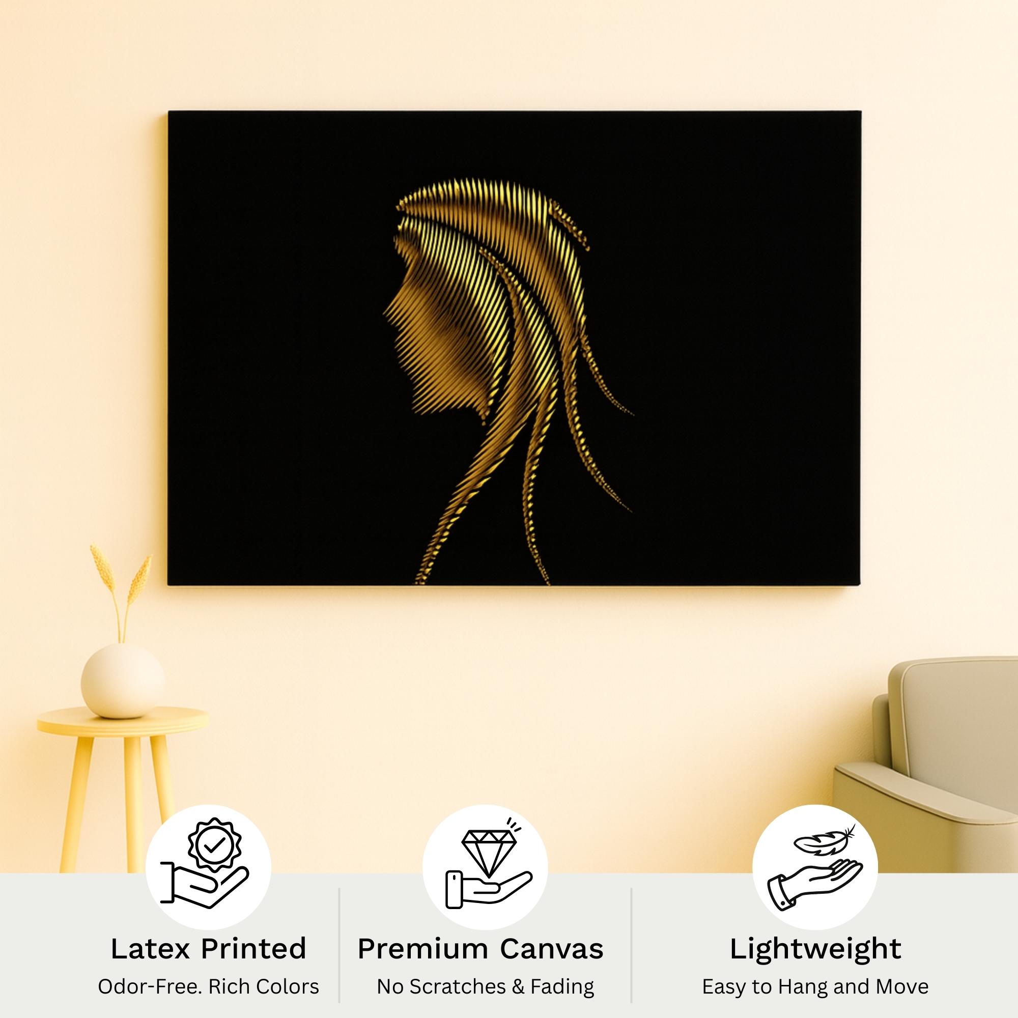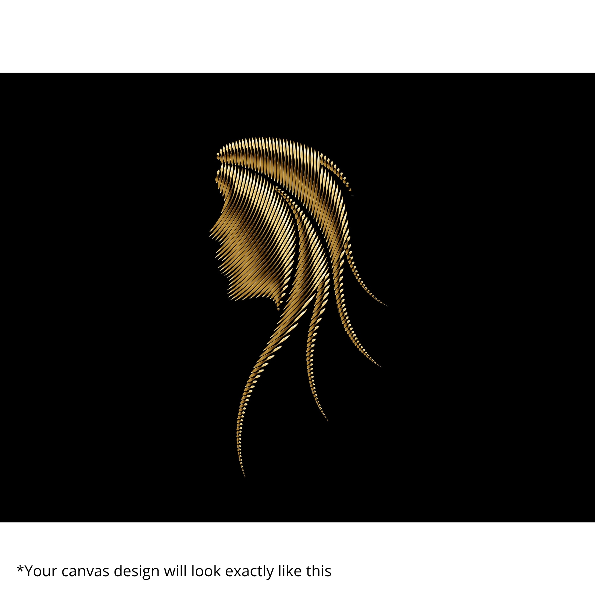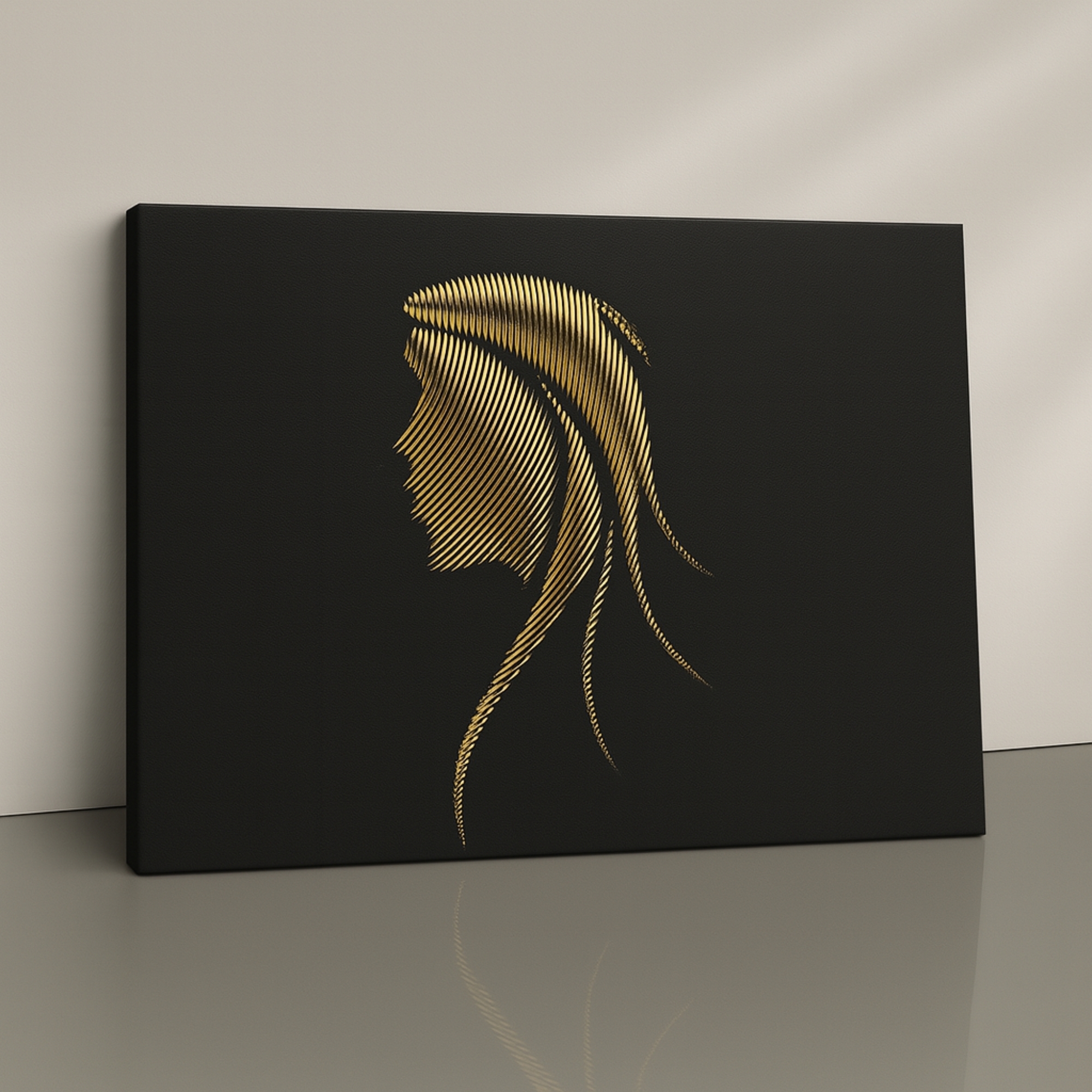 Gilded Profile Lines Canvas Print presents a refined side-profile portrait composed of fine golden strokes on a black background. Minimal yet expressive, it complements modern interiors, studios, and artistic spaces beautifully.