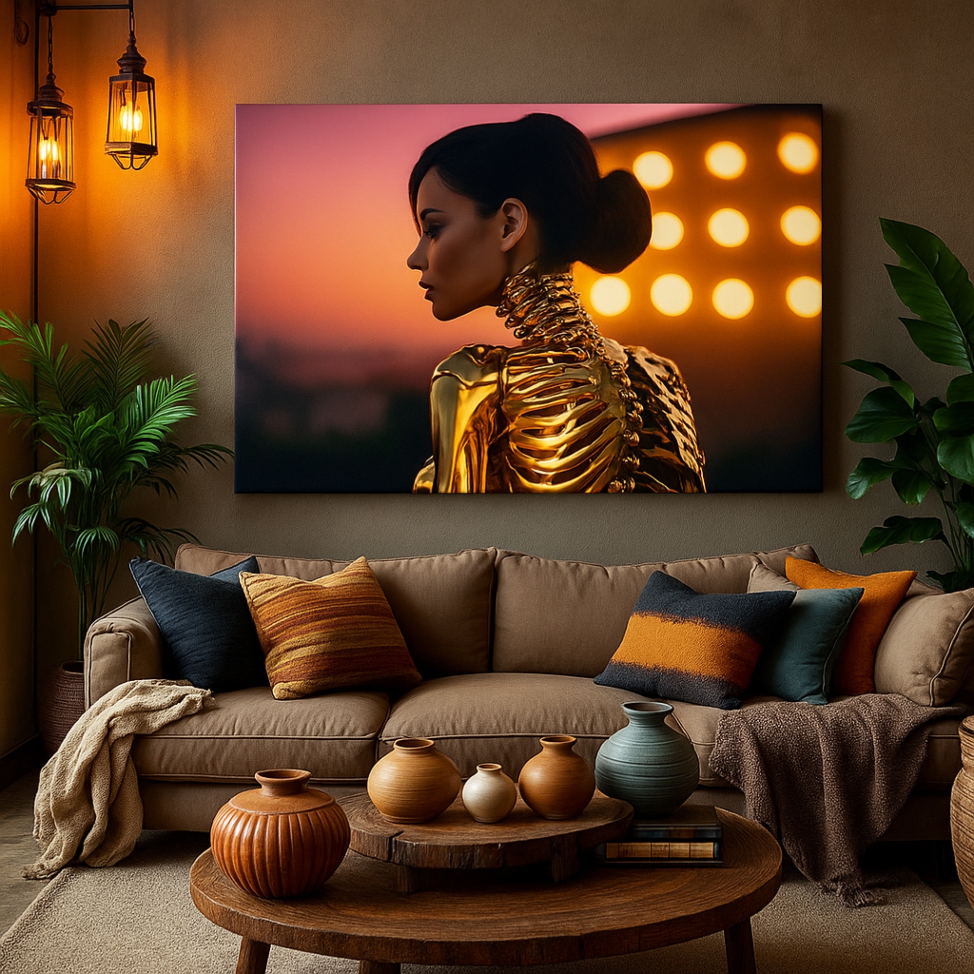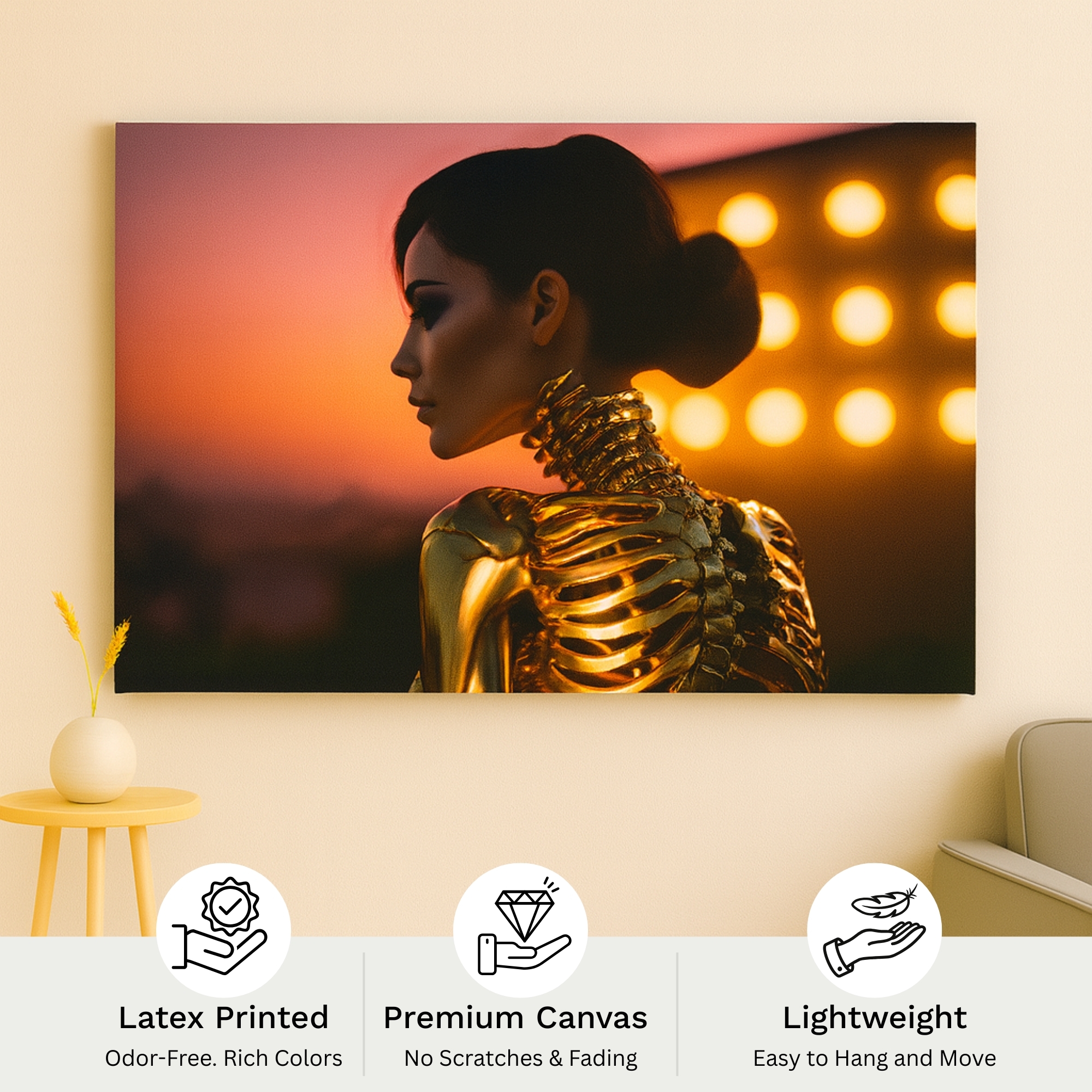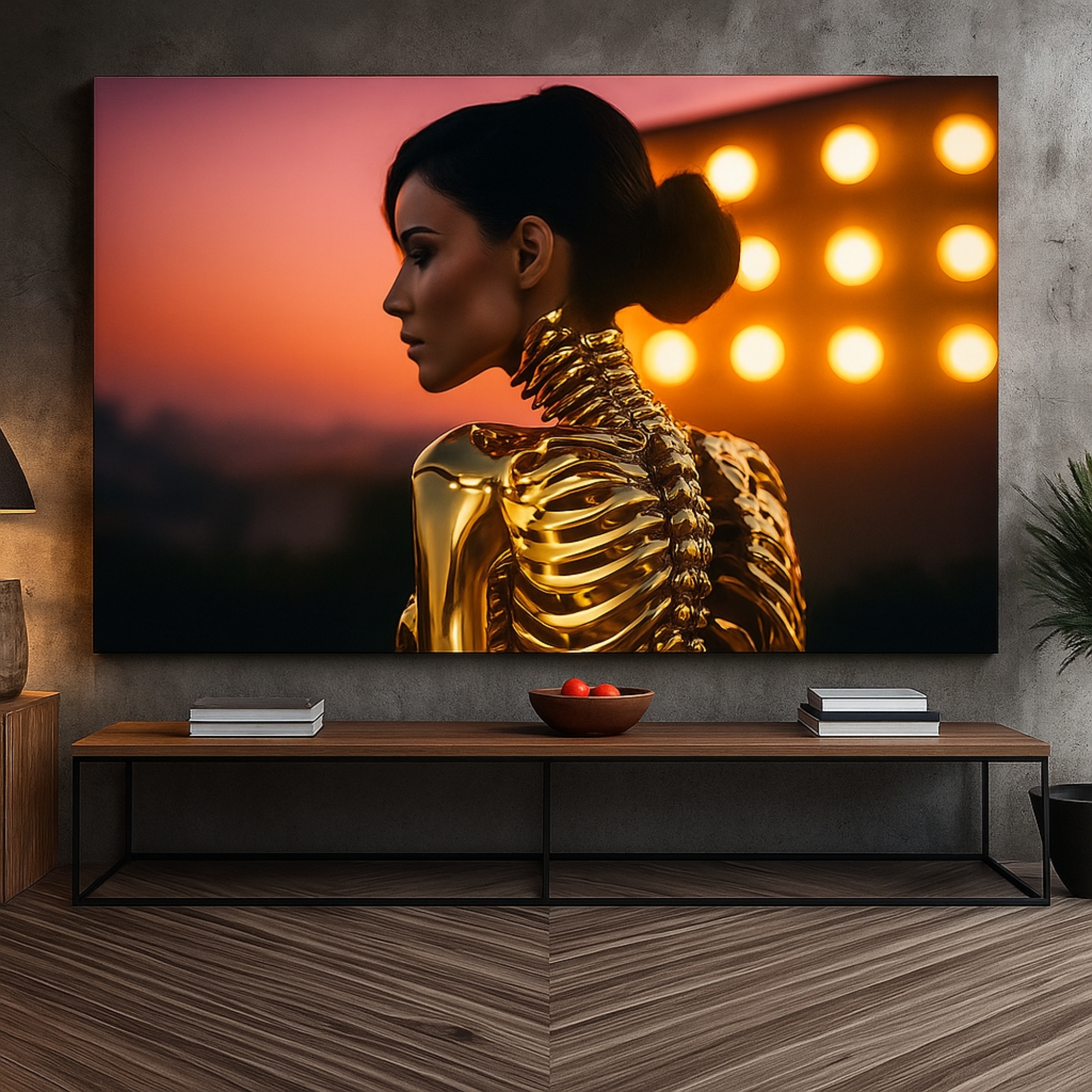 Gilded Sunset Muse Canvas Print presents a striking modern portrait illuminated by warm golden hues against a dramatic twilight backdrop. The elegant profile and metallic highlights create a cinematic mood, perfect for luxury interiors, modern living rooms, studios, and statement walls.