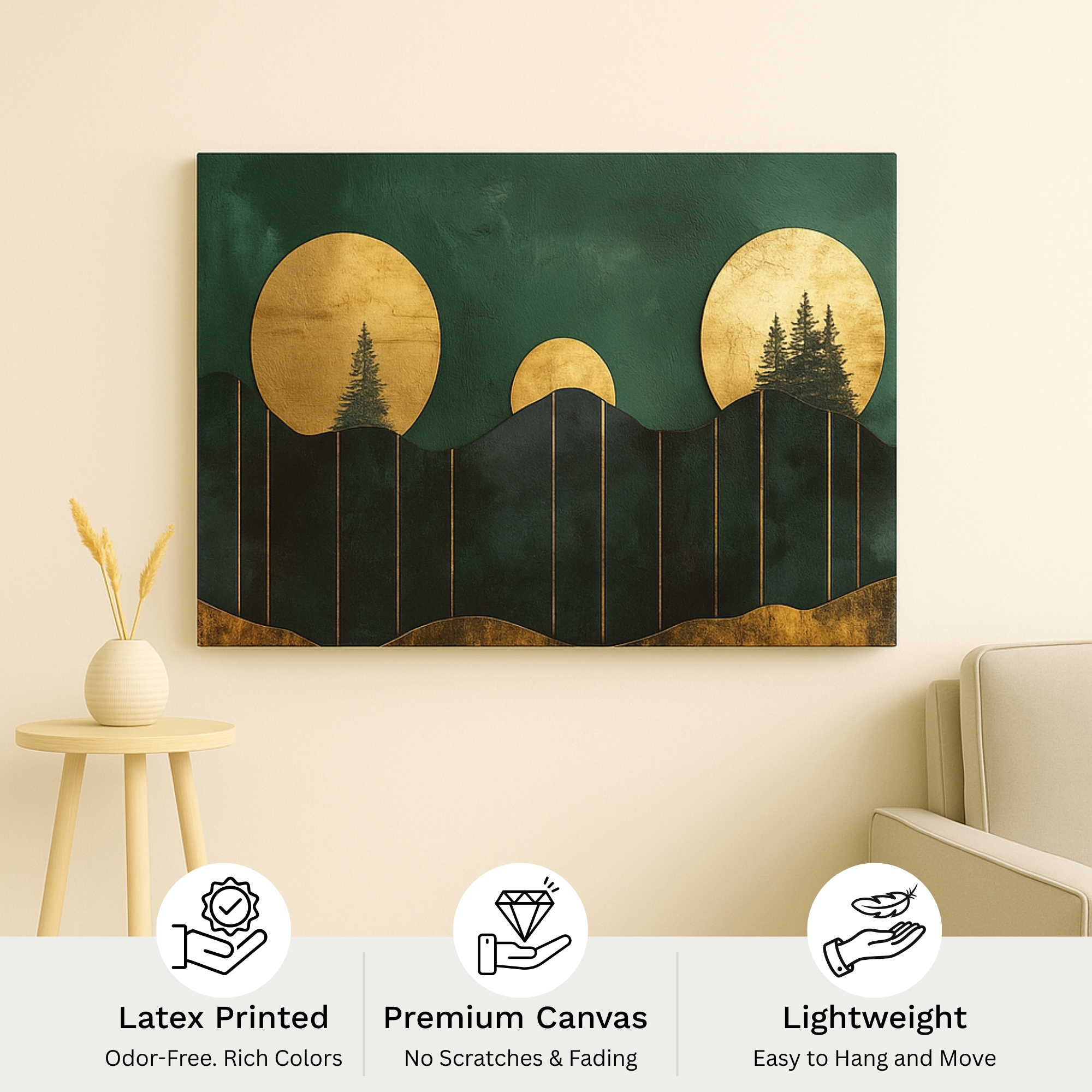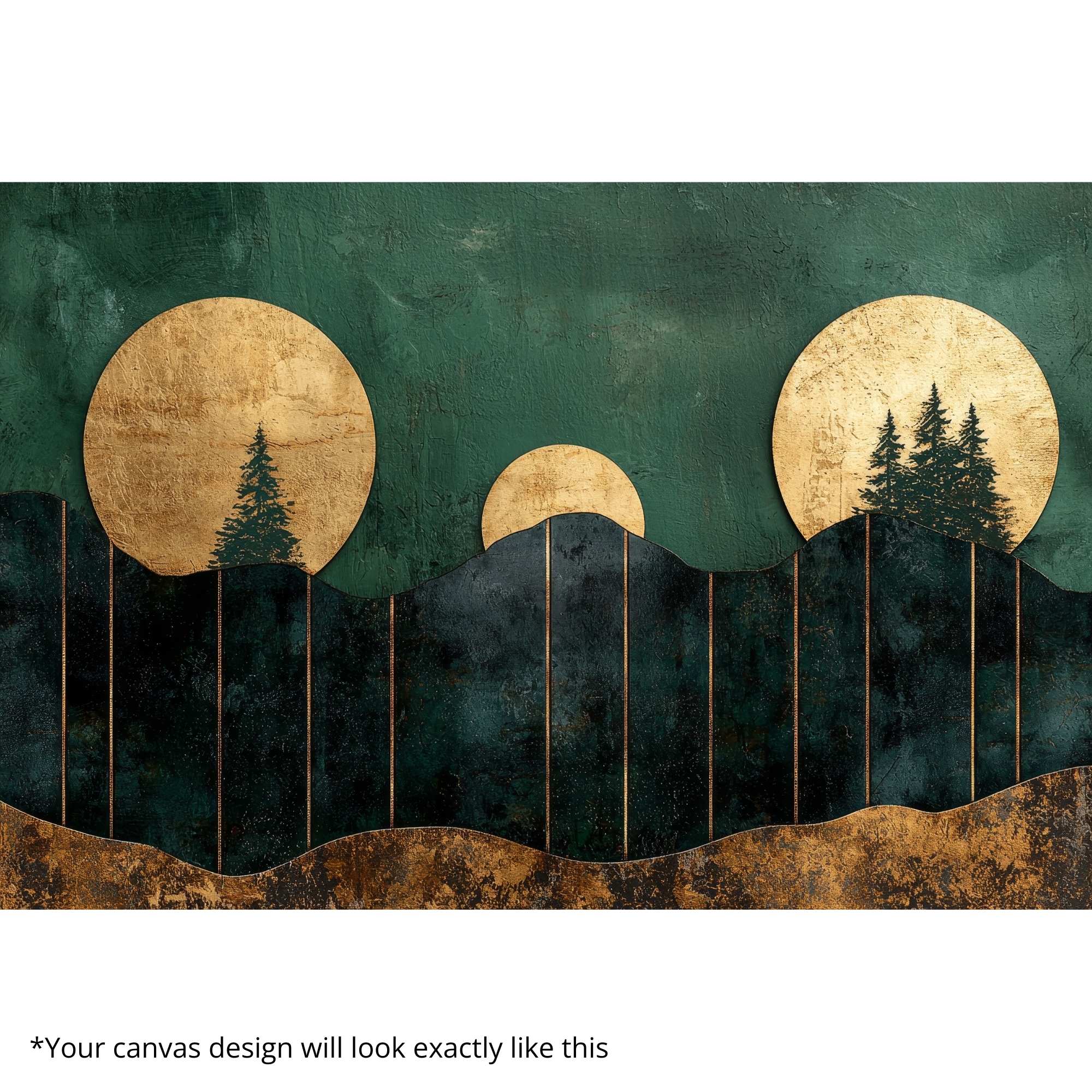 “Gilded Wilderness” Canvas Print presents a bold interplay of metallic gold and deep emerald green. Stylized mountains and evergreens beneath luminous suns create a timeless modern landscape. With its symmetry and glowing palette, this artwork radiates grandeur and refined elegance, transforming nature into a regal emblem.