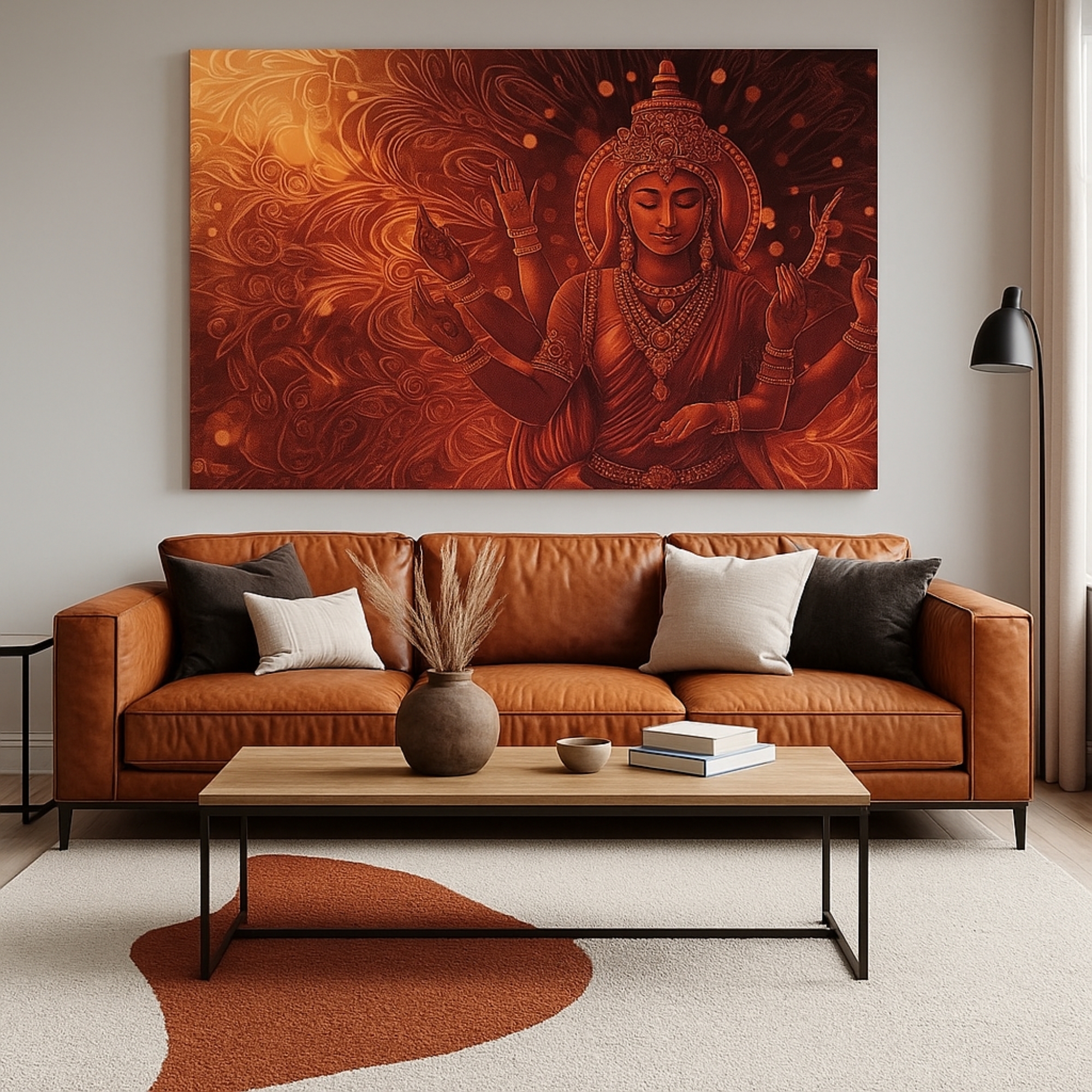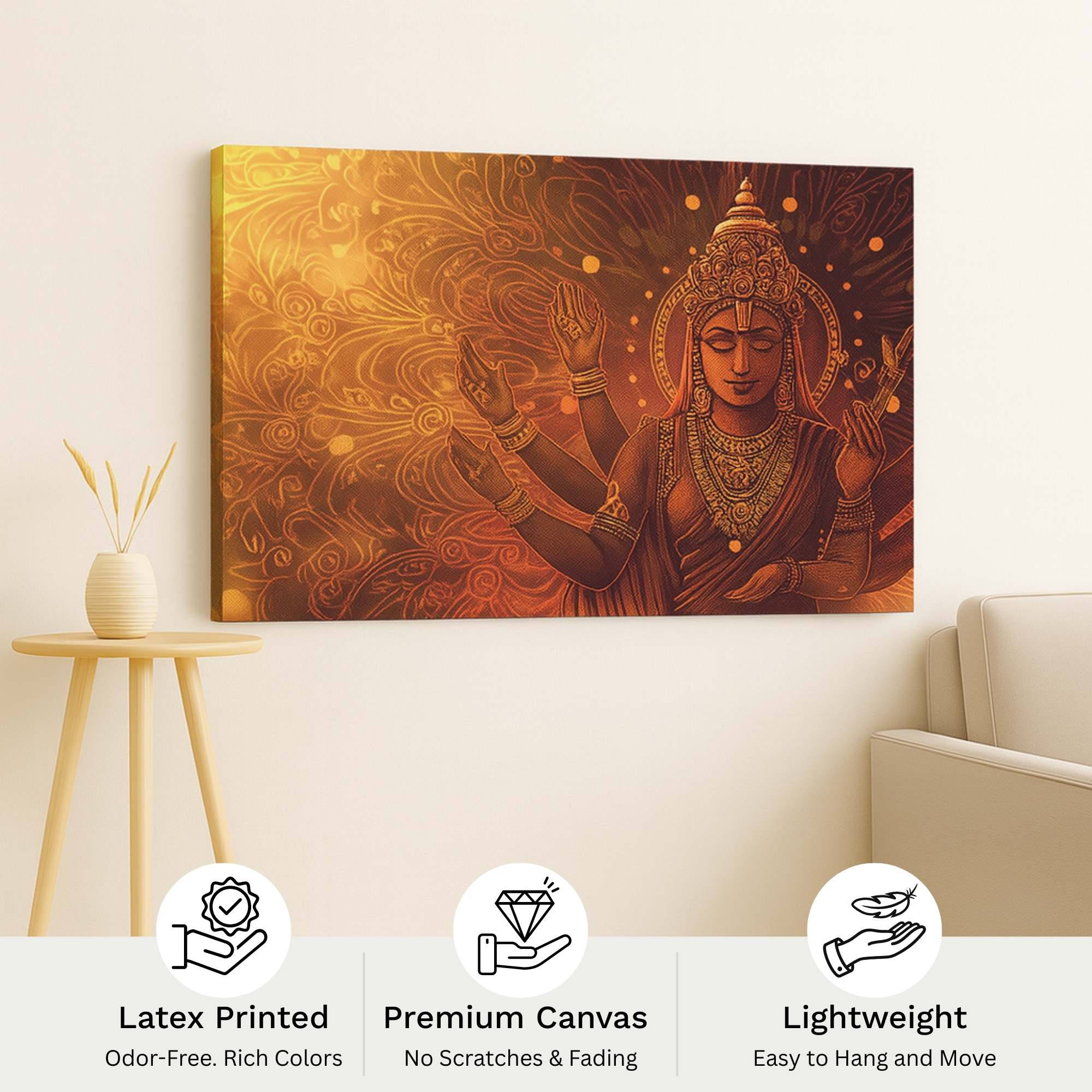 Each canvas print is  printed using archival inks for lasting brilliance, ensuring a divine aura in any décor. Proudly made in India, this artwork represents prosperity, order, and peace—perfect for homes seeking timeless elegance.