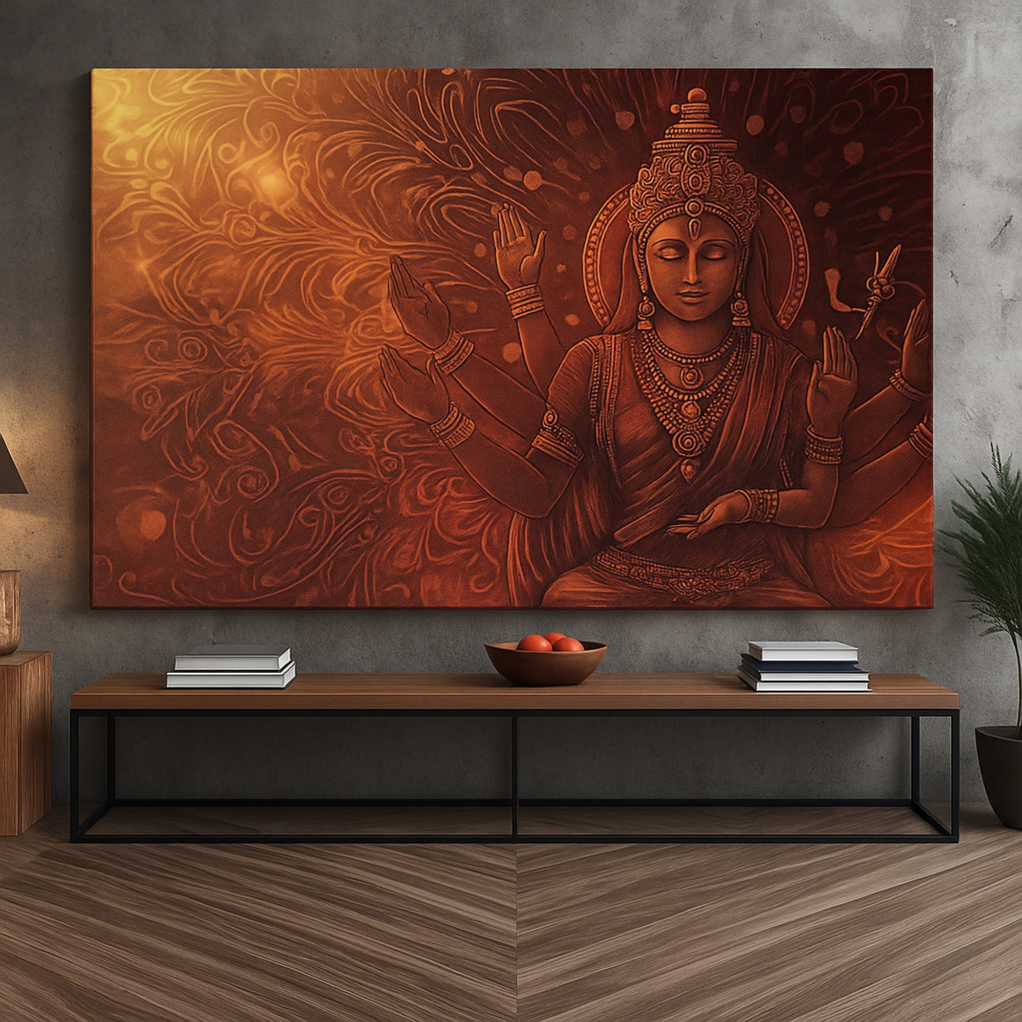 The Golden Divinity Canvas Print radiates celestial splendor and balance, portraying Lord Vishnu in serene golden hues surrounded by cosmic energy. Crafted to infuse strength and harmony into your living space, this spiritual wall art merges traditional reverence with modern Indian artistry. Ideal for meditation areas, offices, or elegant hallways, it creates a tranquil environment grounded in faith.