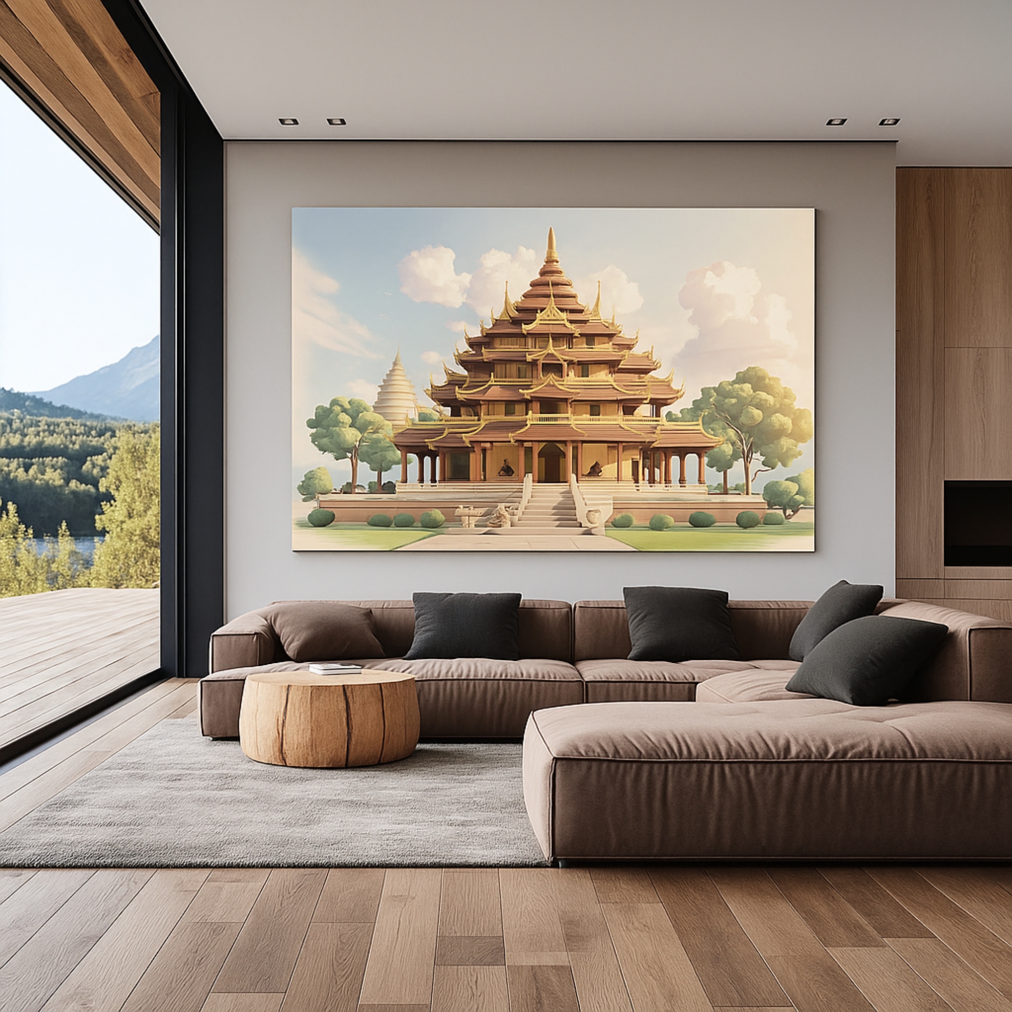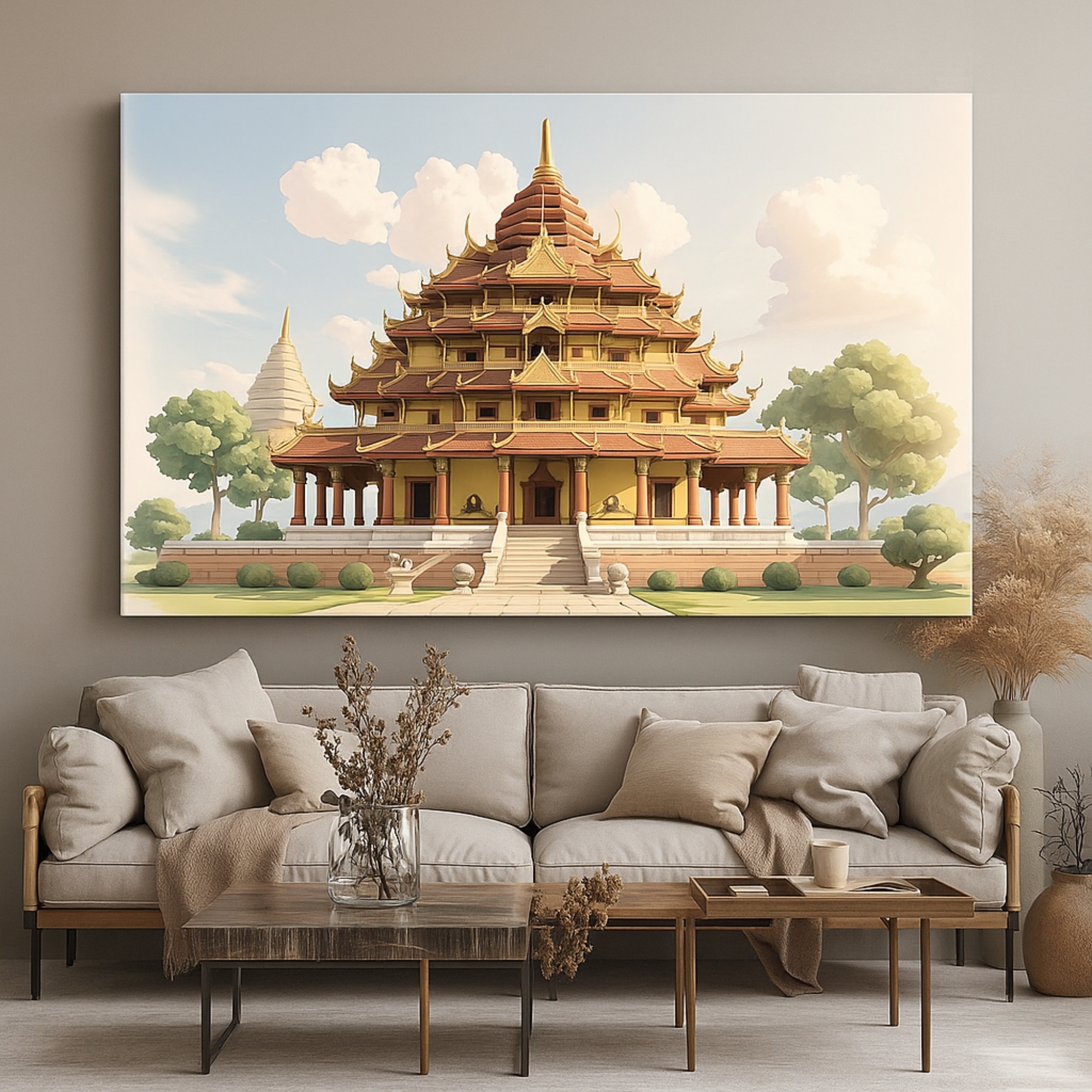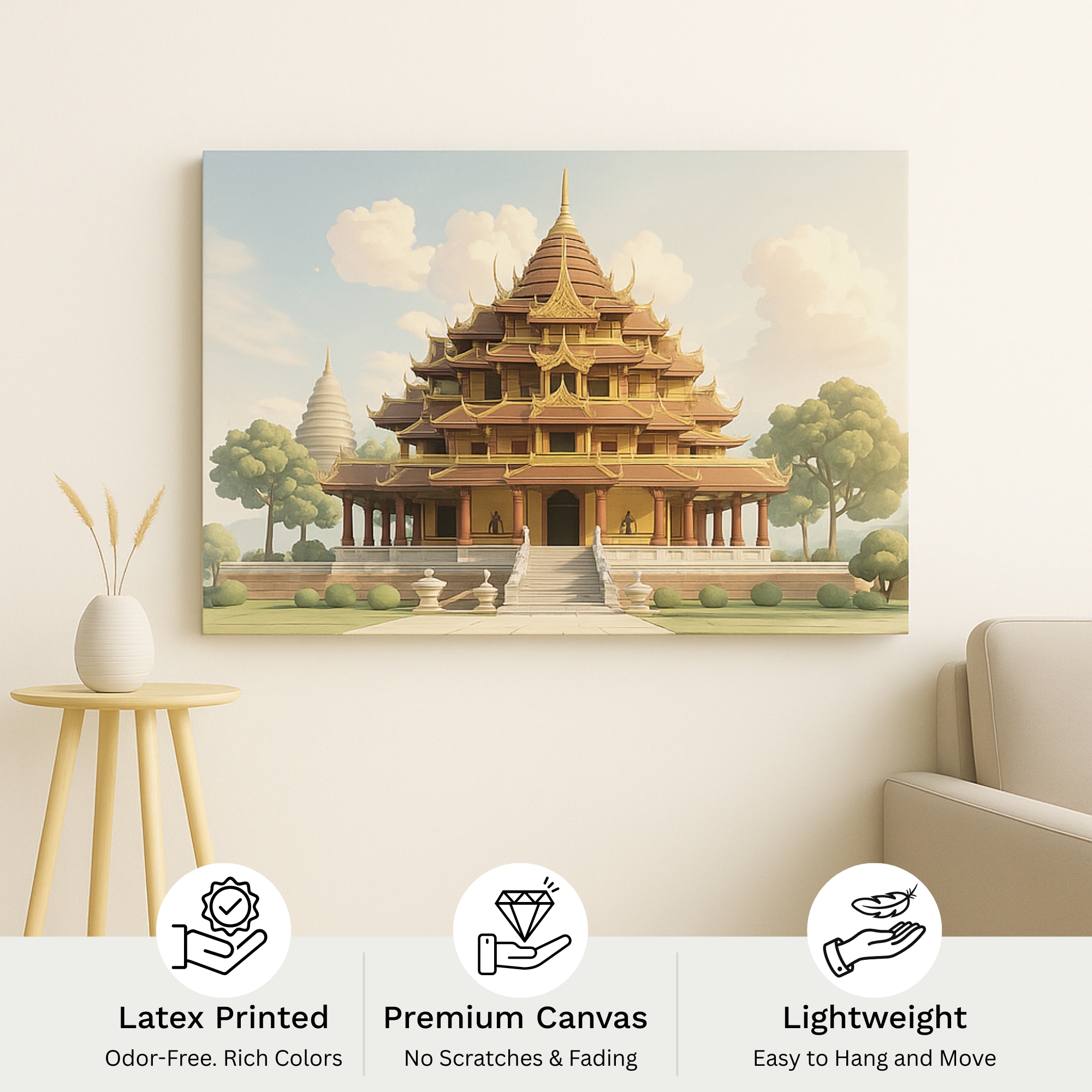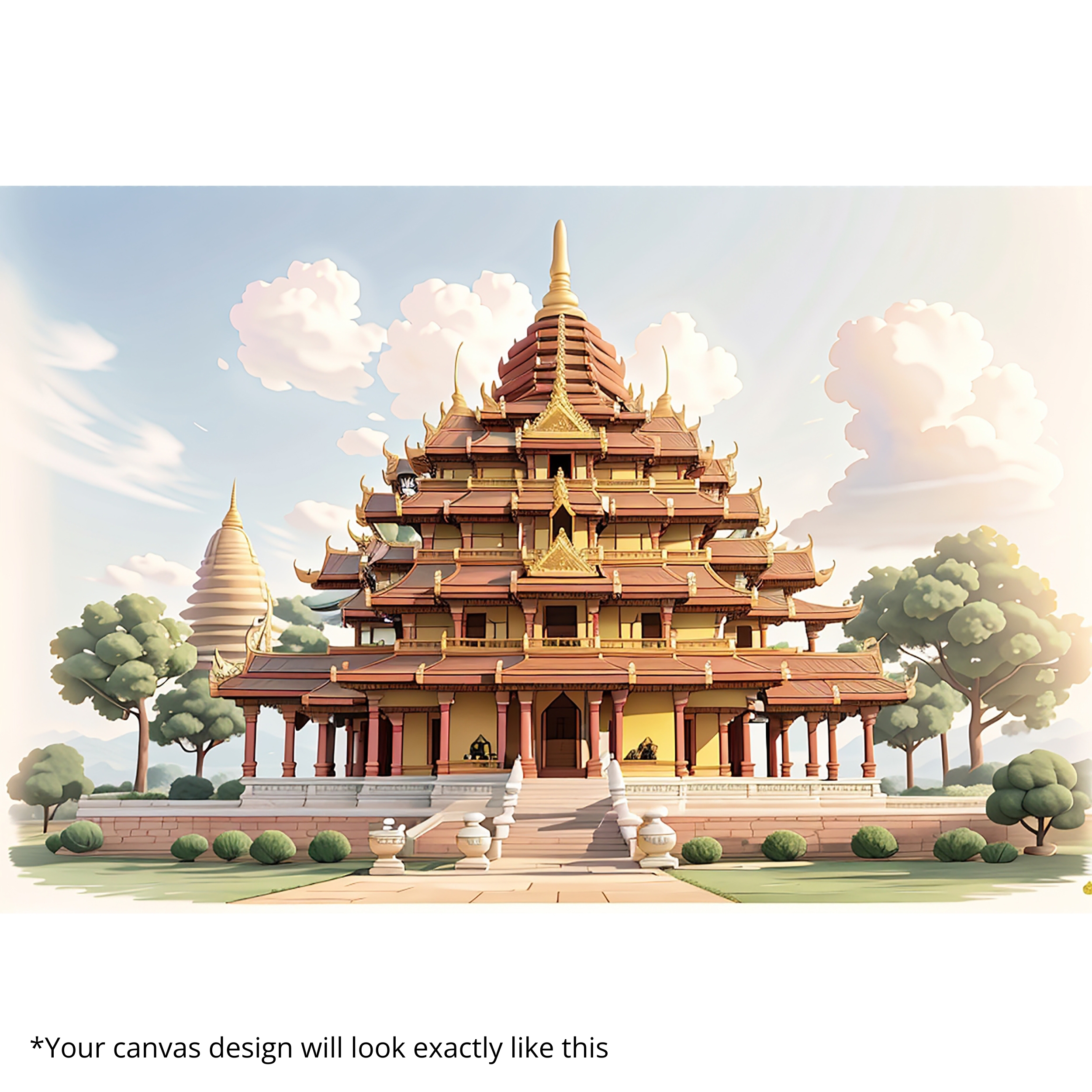 The Golden Pagoda Canvas Print highlights the architectural beauty of a sacred shrine under the morning sun. Rich textures, symmetrical lines, and warm tones of gold and ivory blend tradition with luxury, making this canvas wall art a masterpiece for elegant homes.