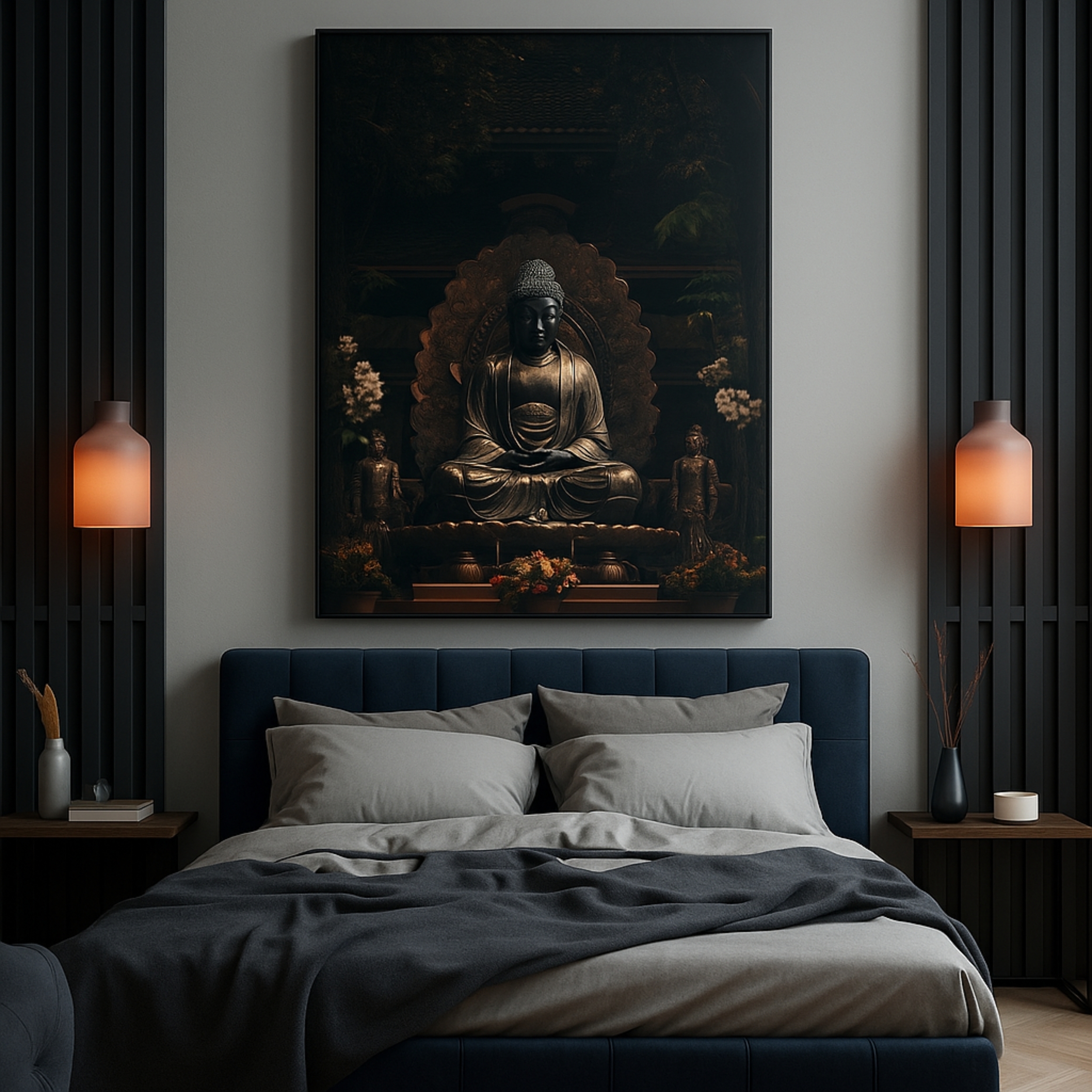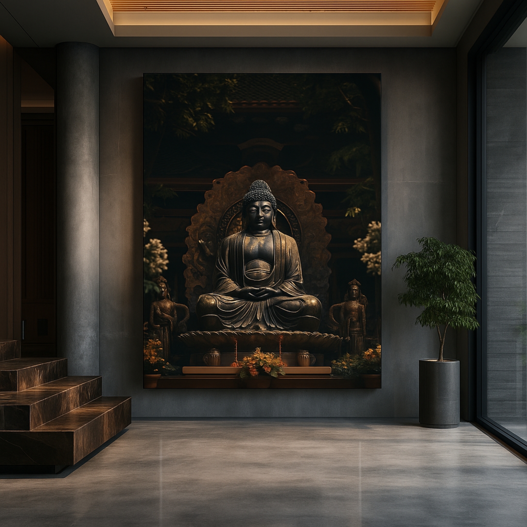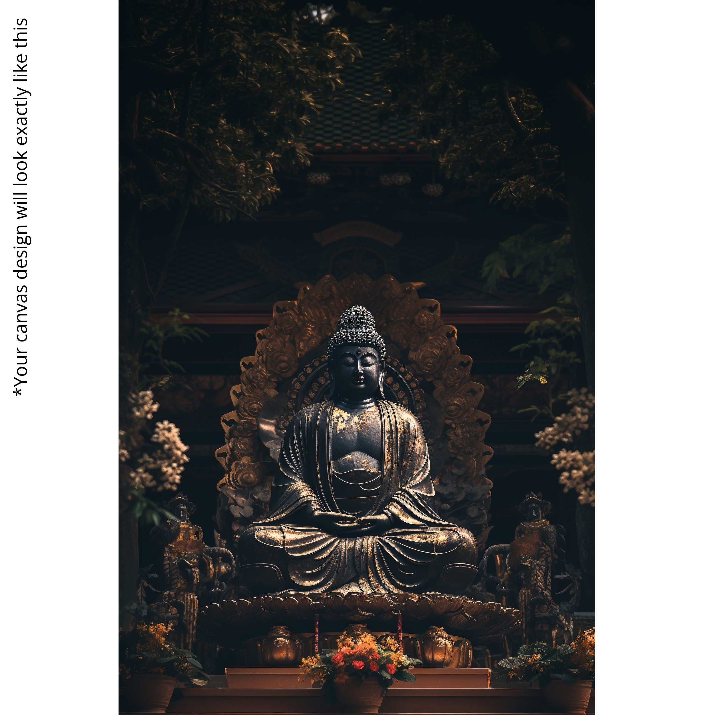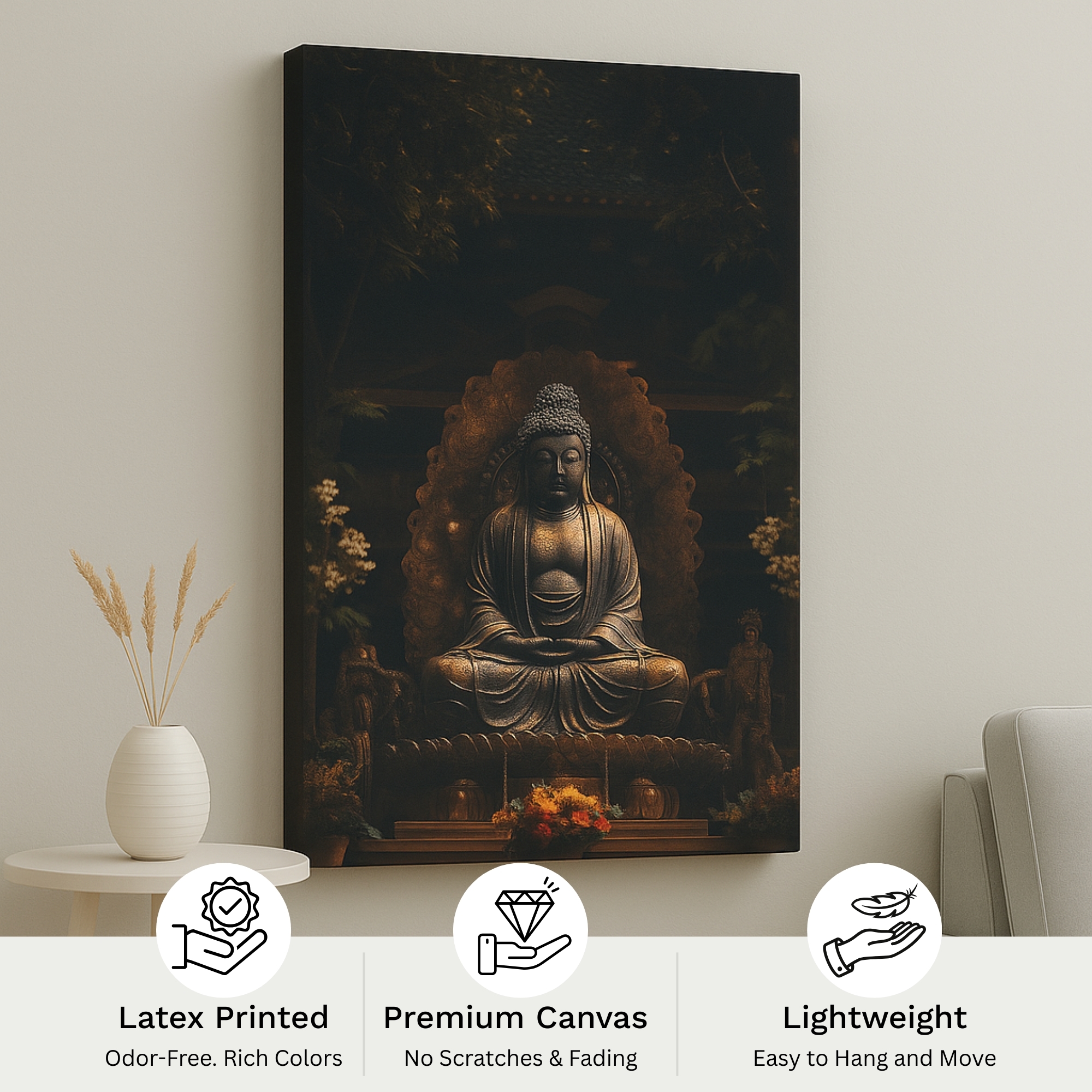“Golden Reverence” is a majestic Buddha Canvas Print that portrays Buddha seated in still meditation, illuminated by soft golden light against a temple-inspired backdrop. This artwork embodies reverence, divine grace, and inner wisdom, becoming a striking spiritual centerpiece that radiates calm and sacred luxury. Its golden tones add richness, making it perfect for both contemporary and traditional interiors.