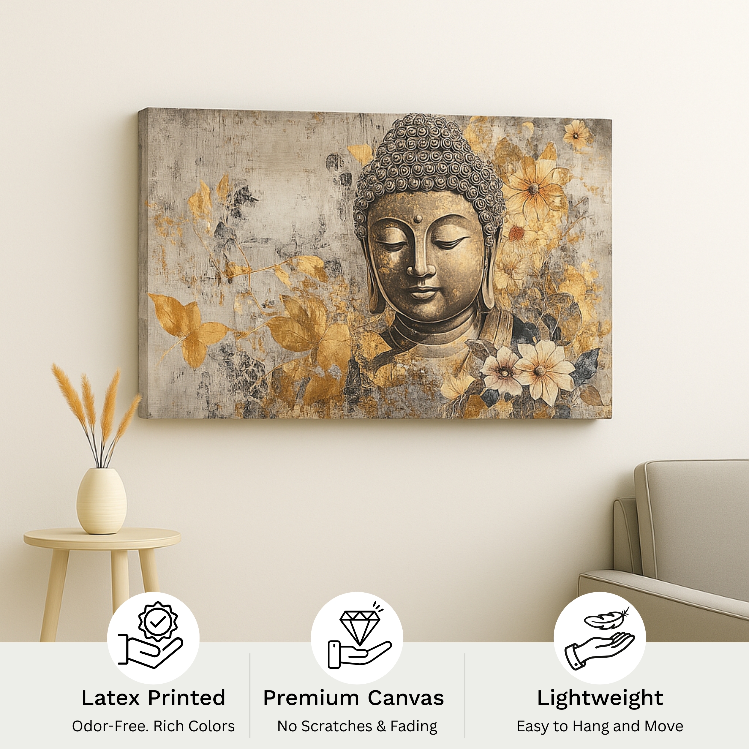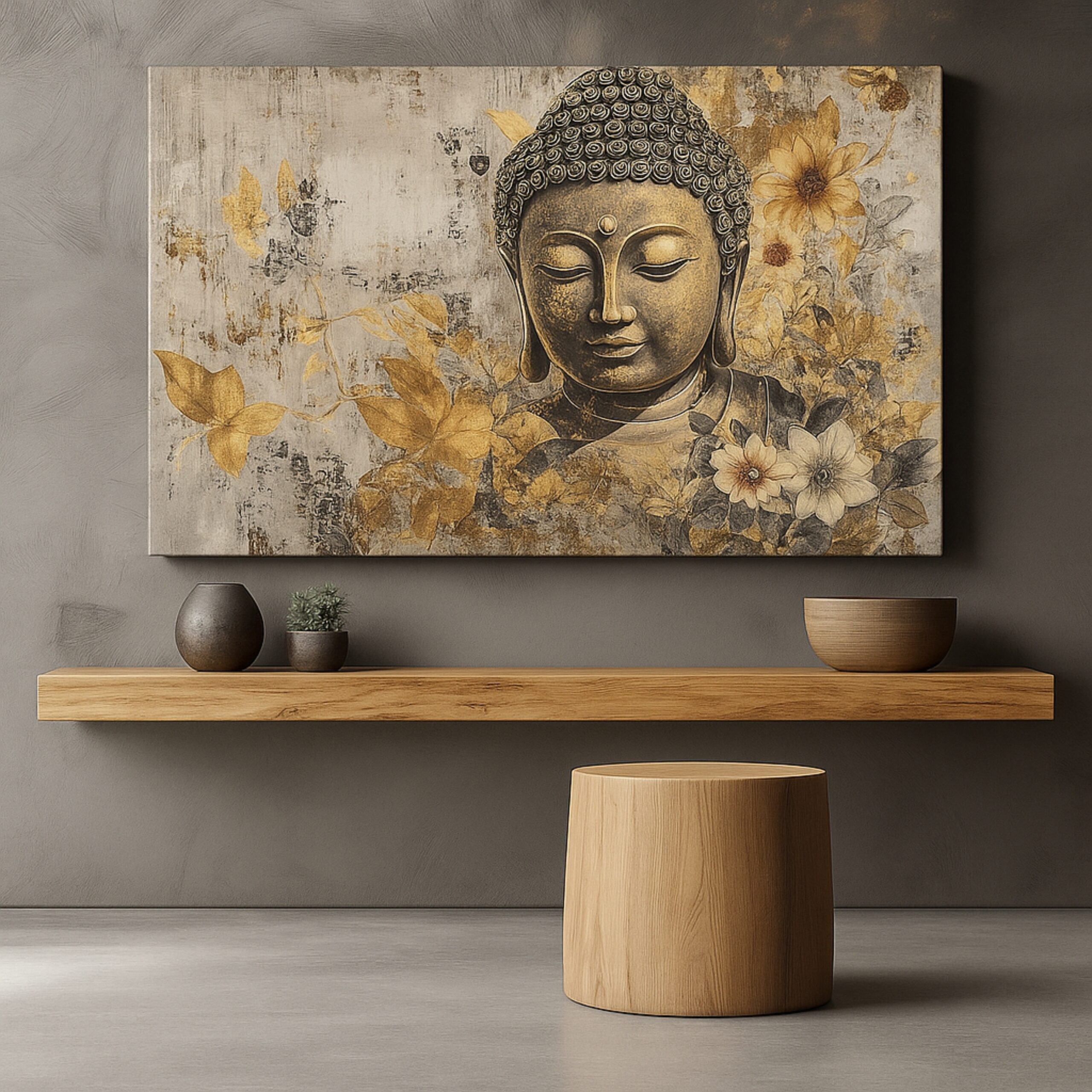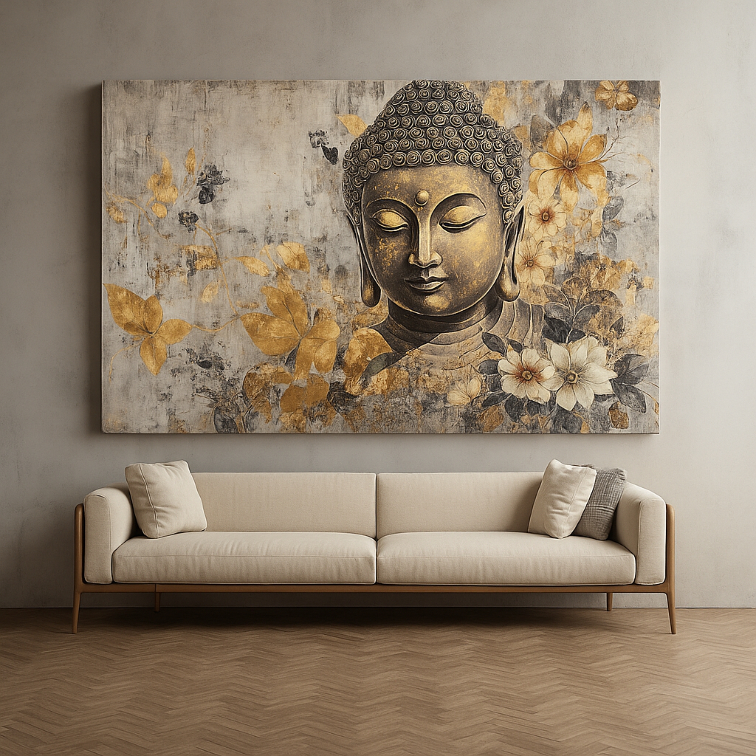 The Golden Silence Canvas Print captures the tranquil presence of Buddha surrounded by soft gold and grey florals. This canvas radiates calm, mindfulness, and quiet beauty that enrich any interior. Gentle light and subtle detail express stillness and grace, creating a peaceful atmosphere for meditation rooms or modern homes. Printed on premium stretched canvas using eco-friendly inks, each stroke stays vibrant and true. Moreover, its smooth edges and ready-to-hang finish ensure refined presentation. This canvas print brings serenity to walls seeking harmony and reflection.