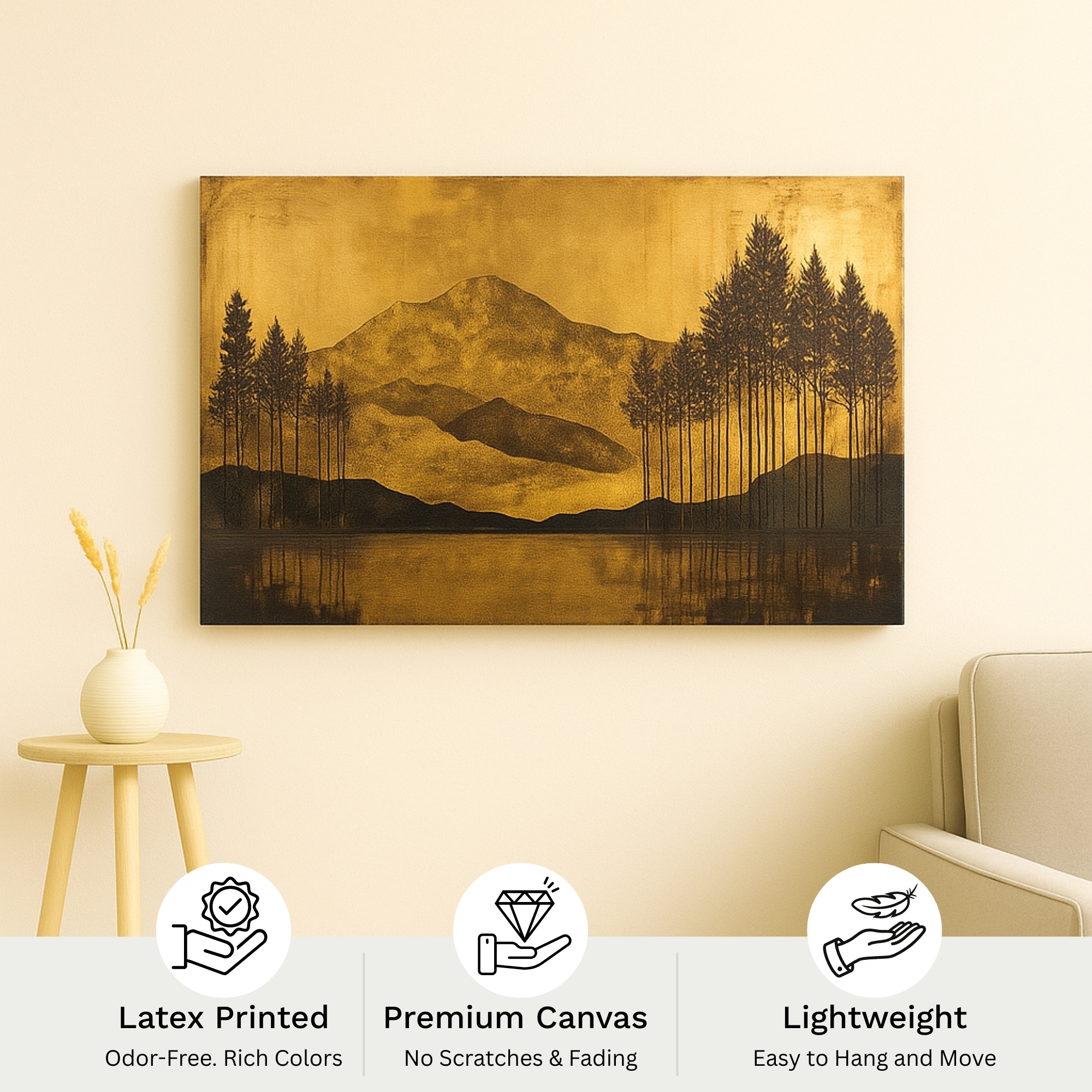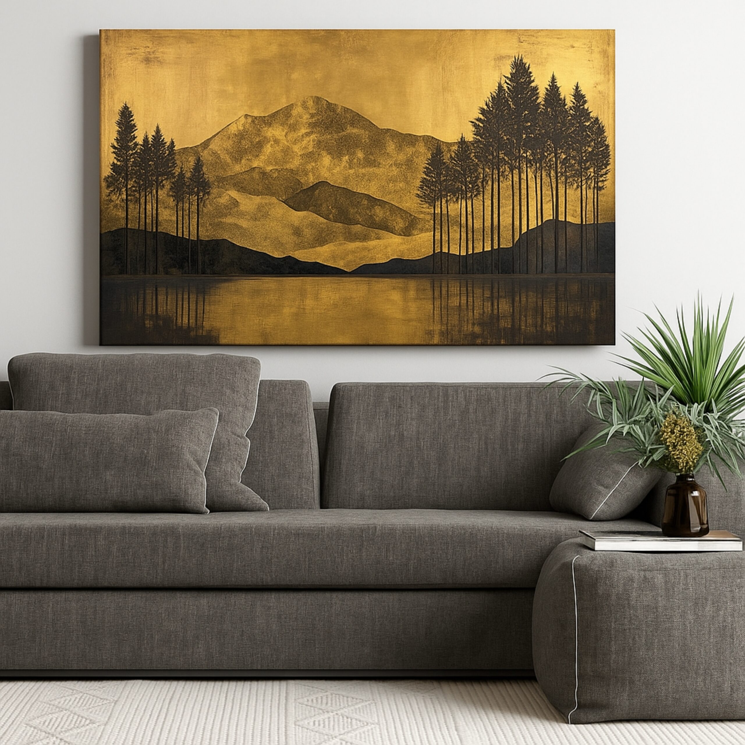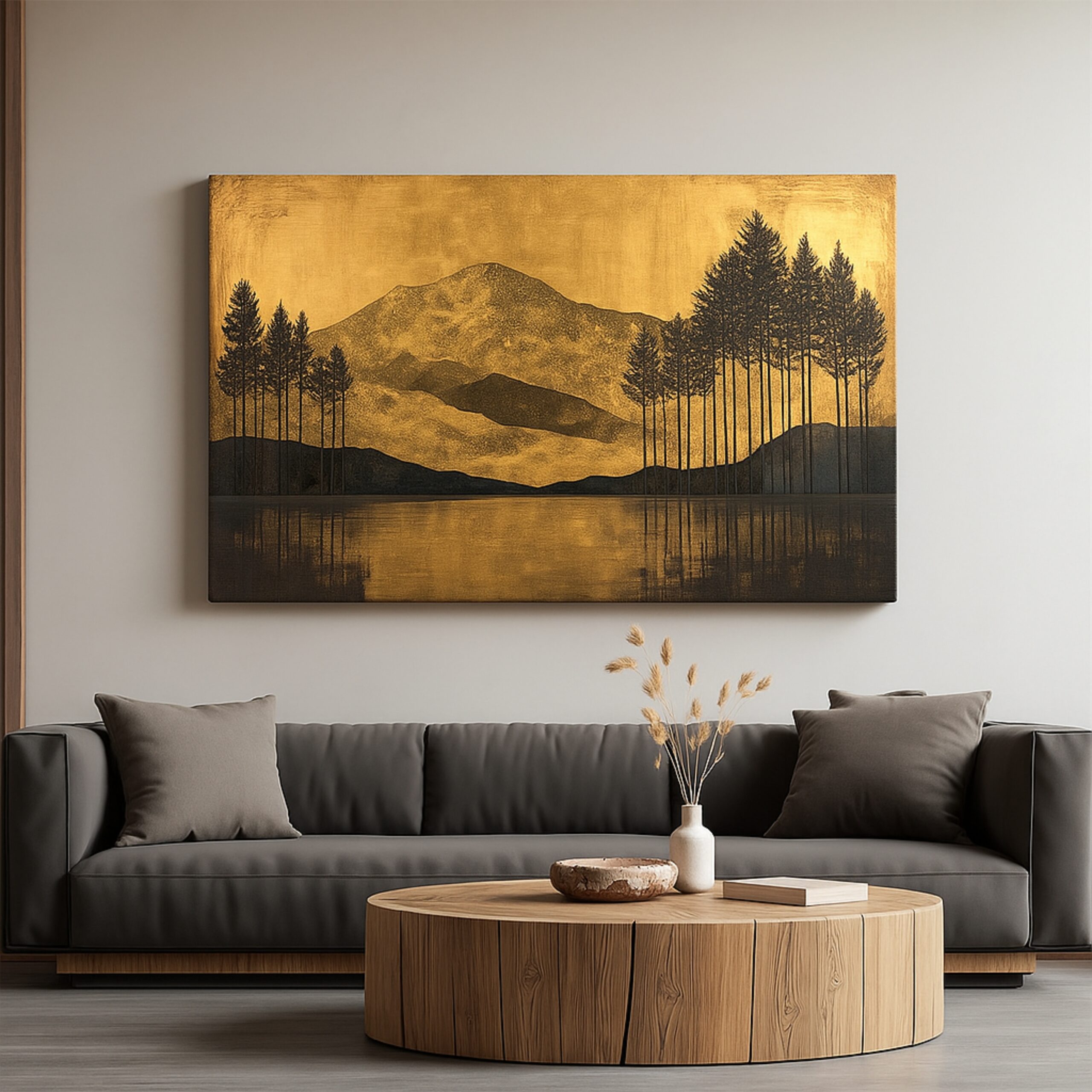 “Golden Silence” Canvas Print channels majesty and tranquility through its shimmering golden palette. Towering peaks and slender trees stand in symmetry, mirrored in a calm golden lake. Minimal yet dramatic, it blends natural grandeur with opulence, inviting timeless stillness.
