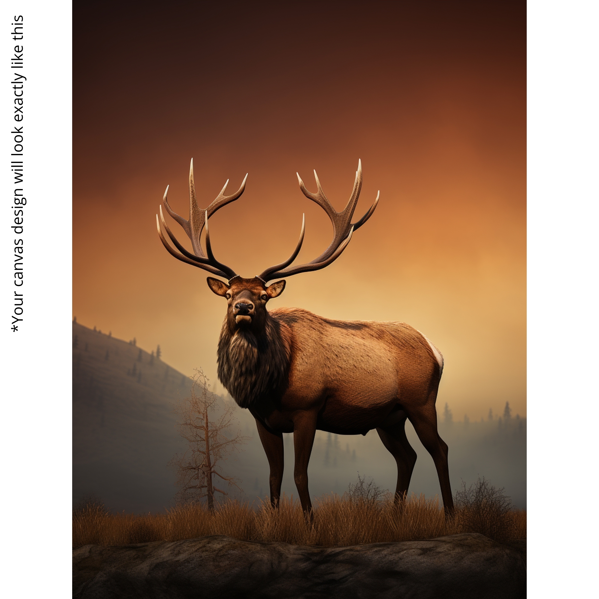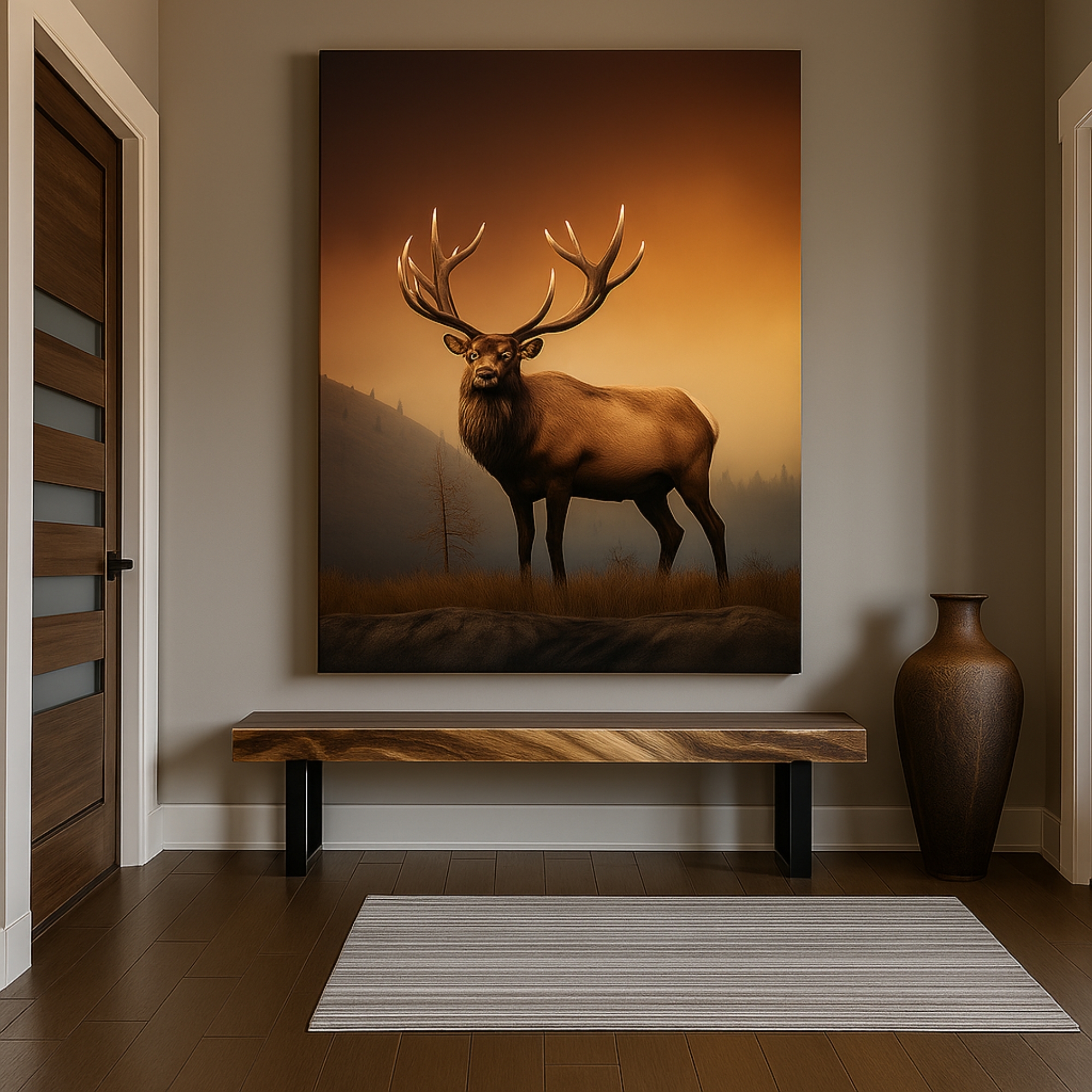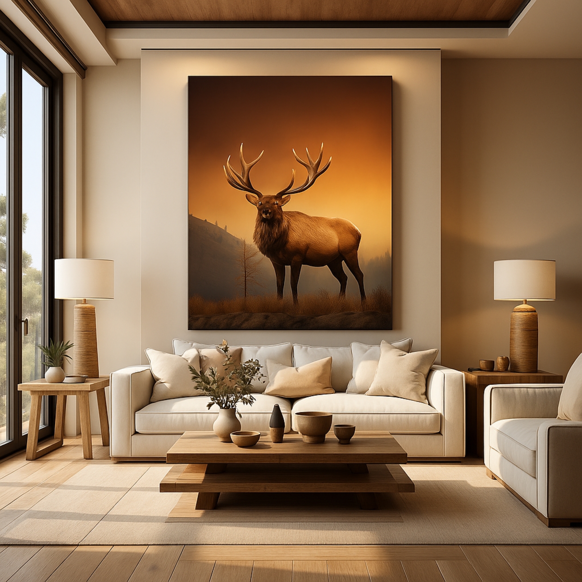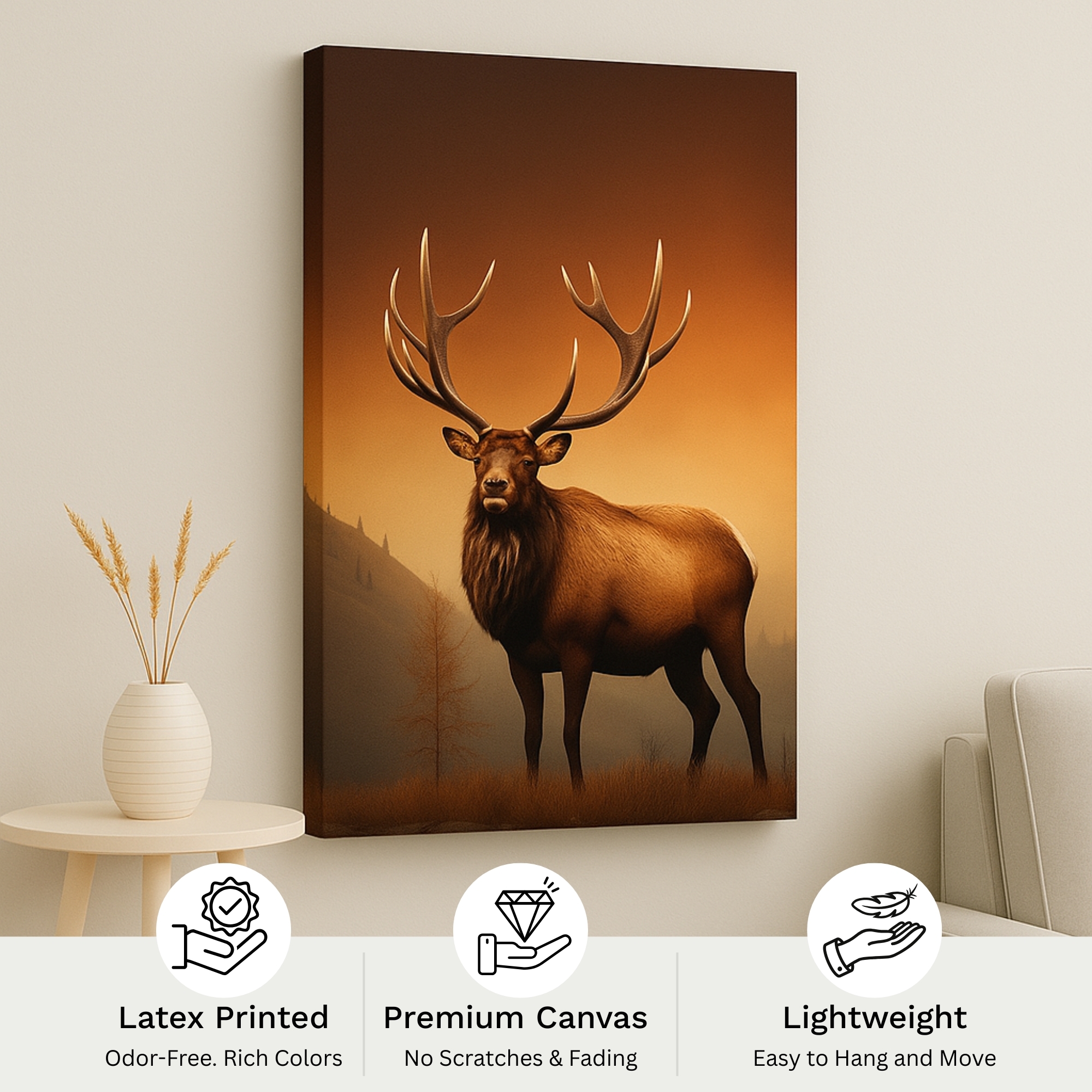The Golden Stagrise Canvas Print reveals a majestic stag glowing beneath a warm golden sunset, framed by soft mist and distant mountains. Radiant orange tones, atmospheric lighting, and elegant wildlife detailing make this artwork ideal for warm interiors, rustic homes, studios, and nature-themed spaces needing a powerful yet serene focal point.
