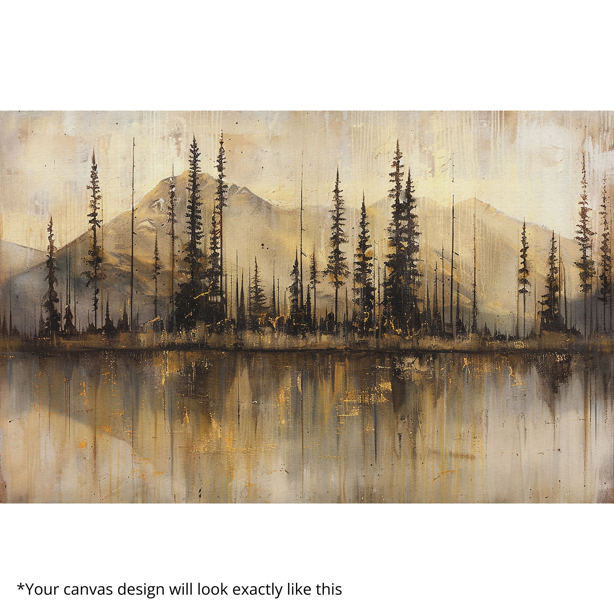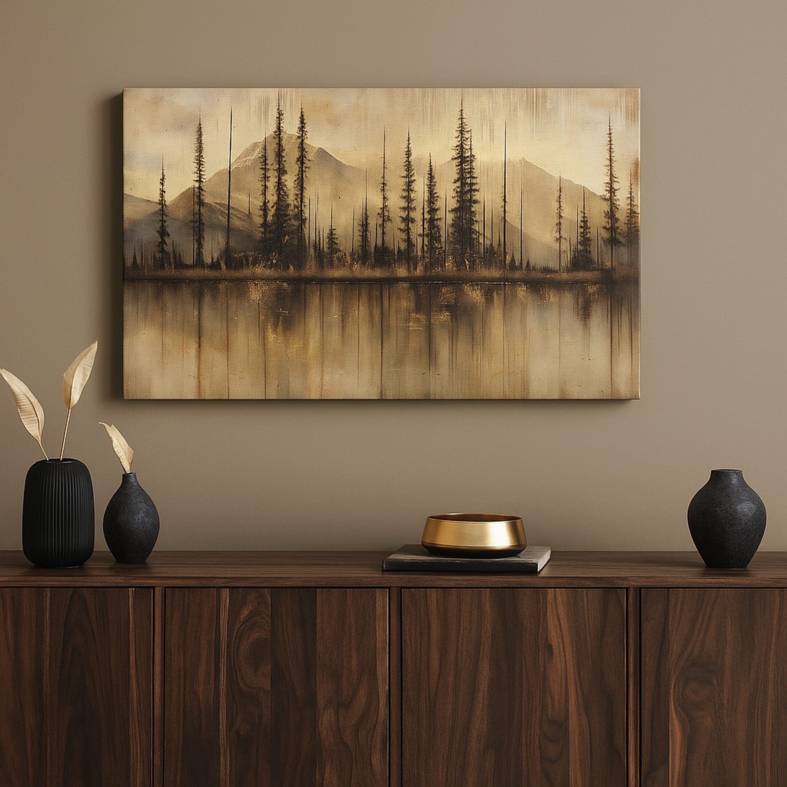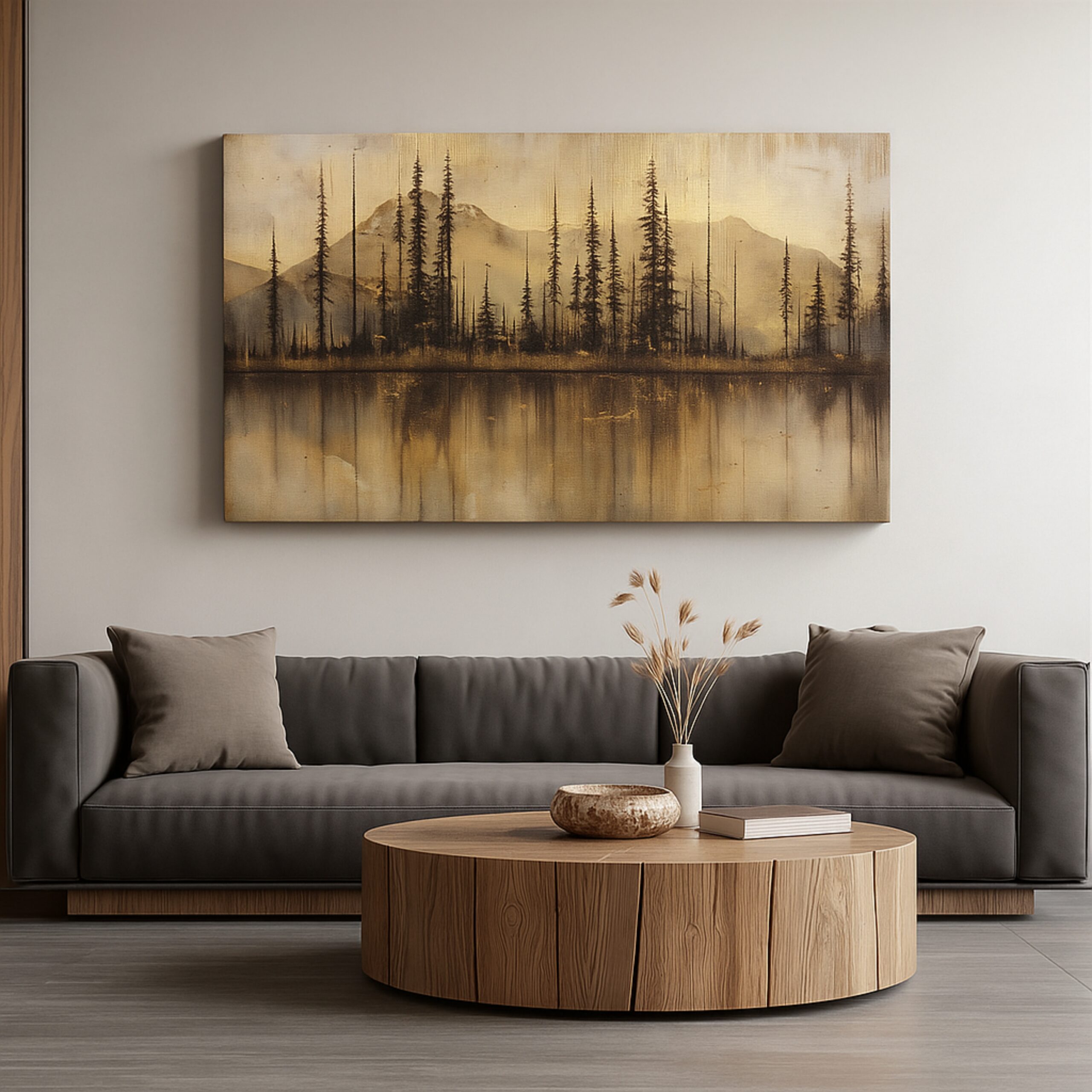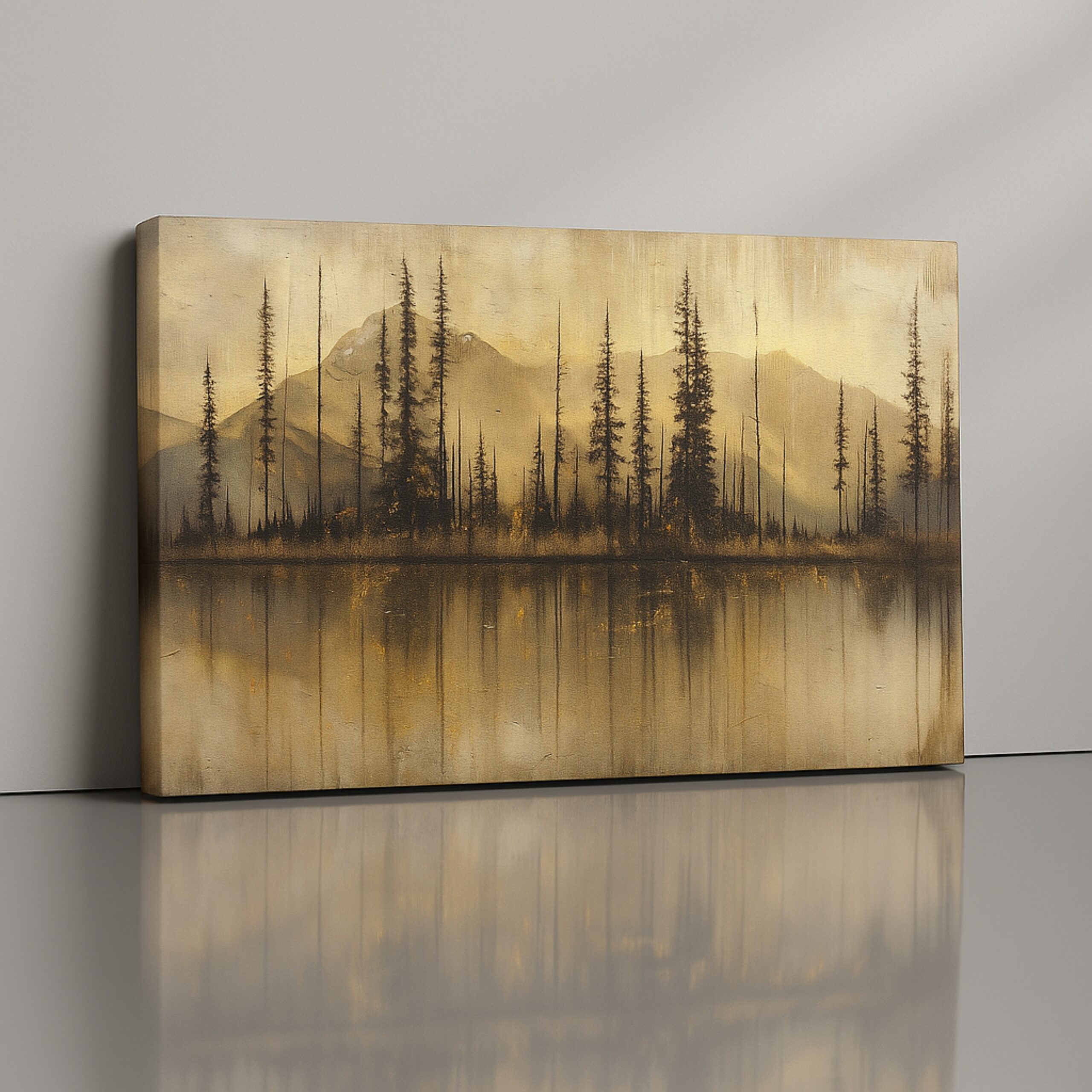 “Golden Stillness” is a serene Canvas Print showcasing a golden forest mirrored in calm waters. The luminous hues evoke balance, peace, and timelessness, turning interiors into tranquil sanctuaries filled with natural elegance.