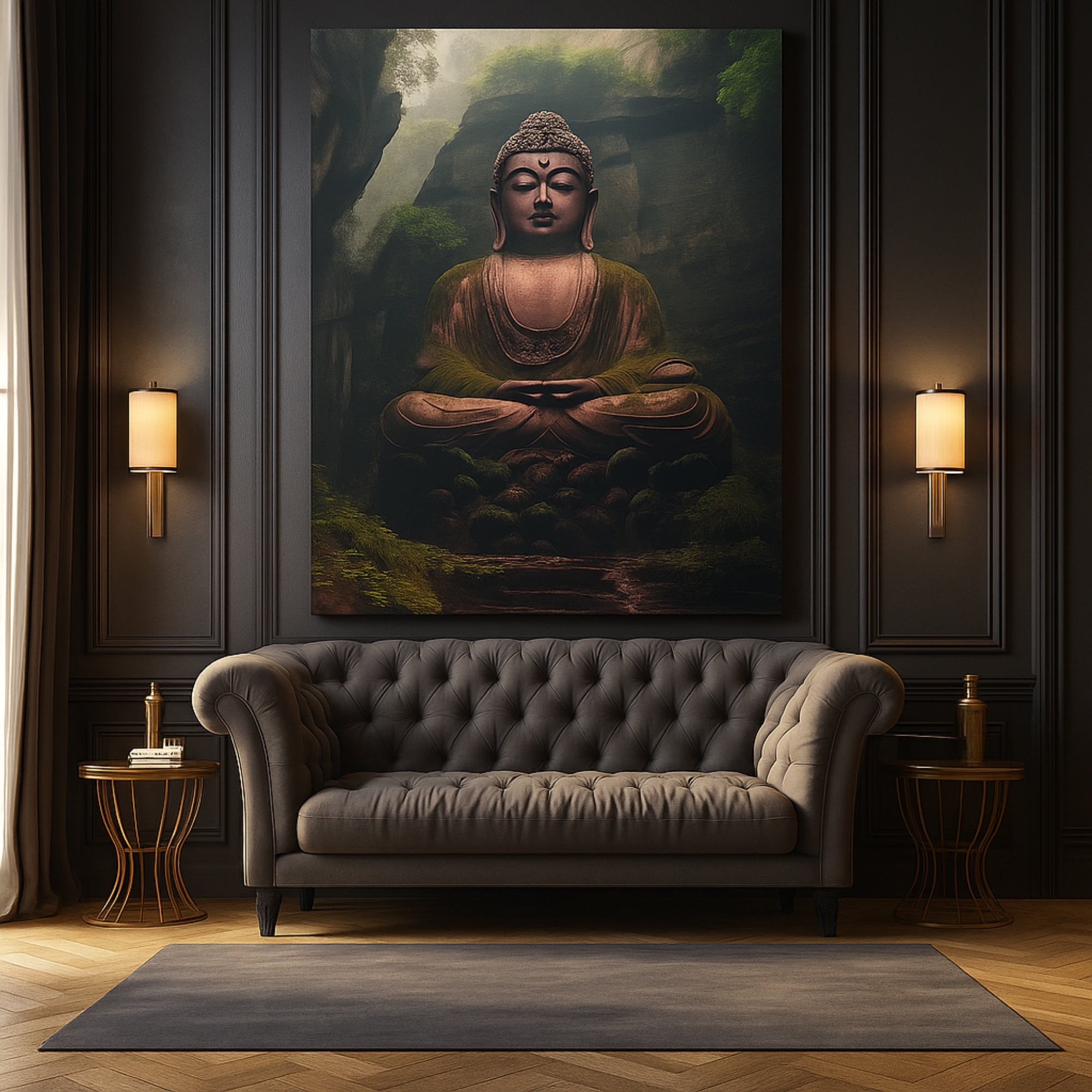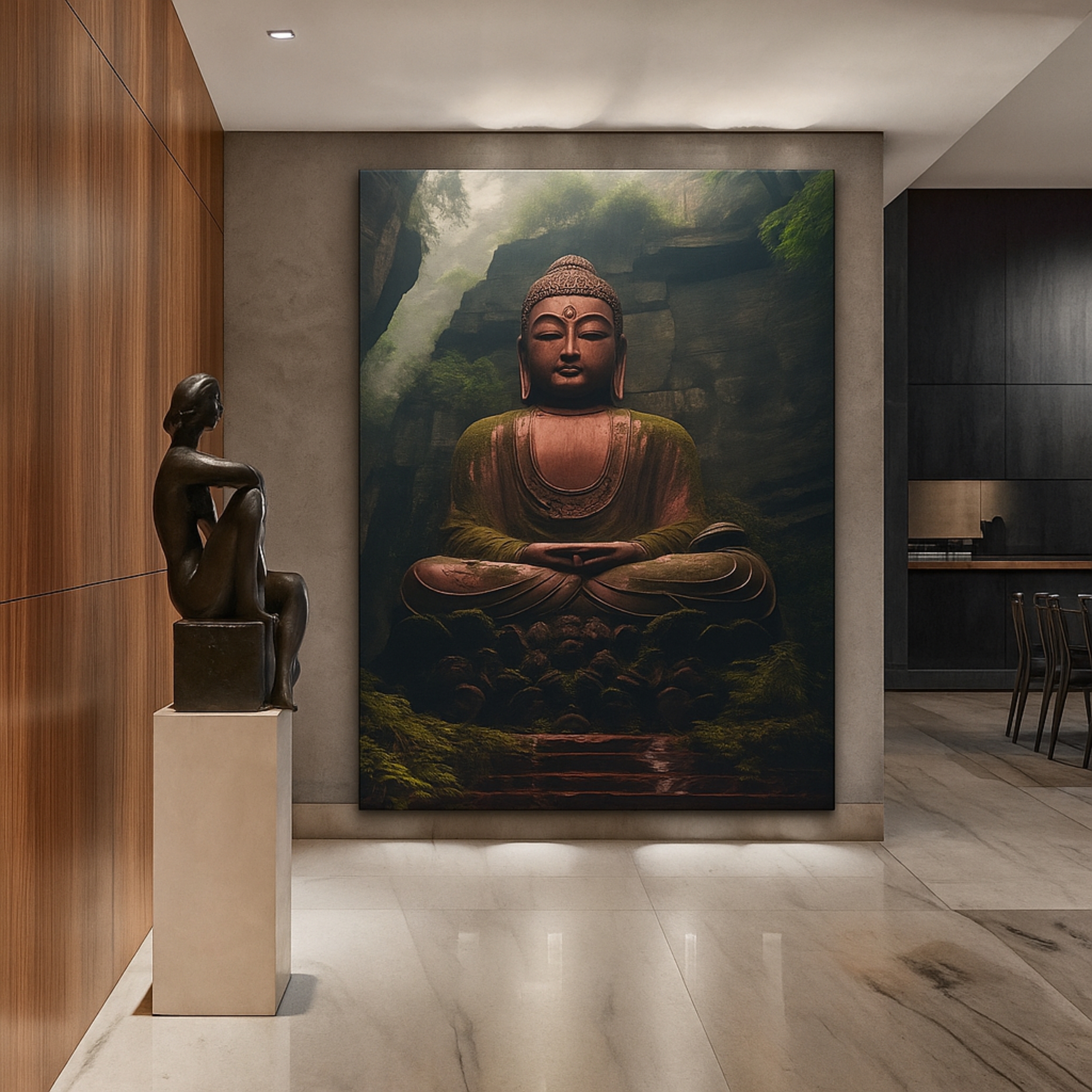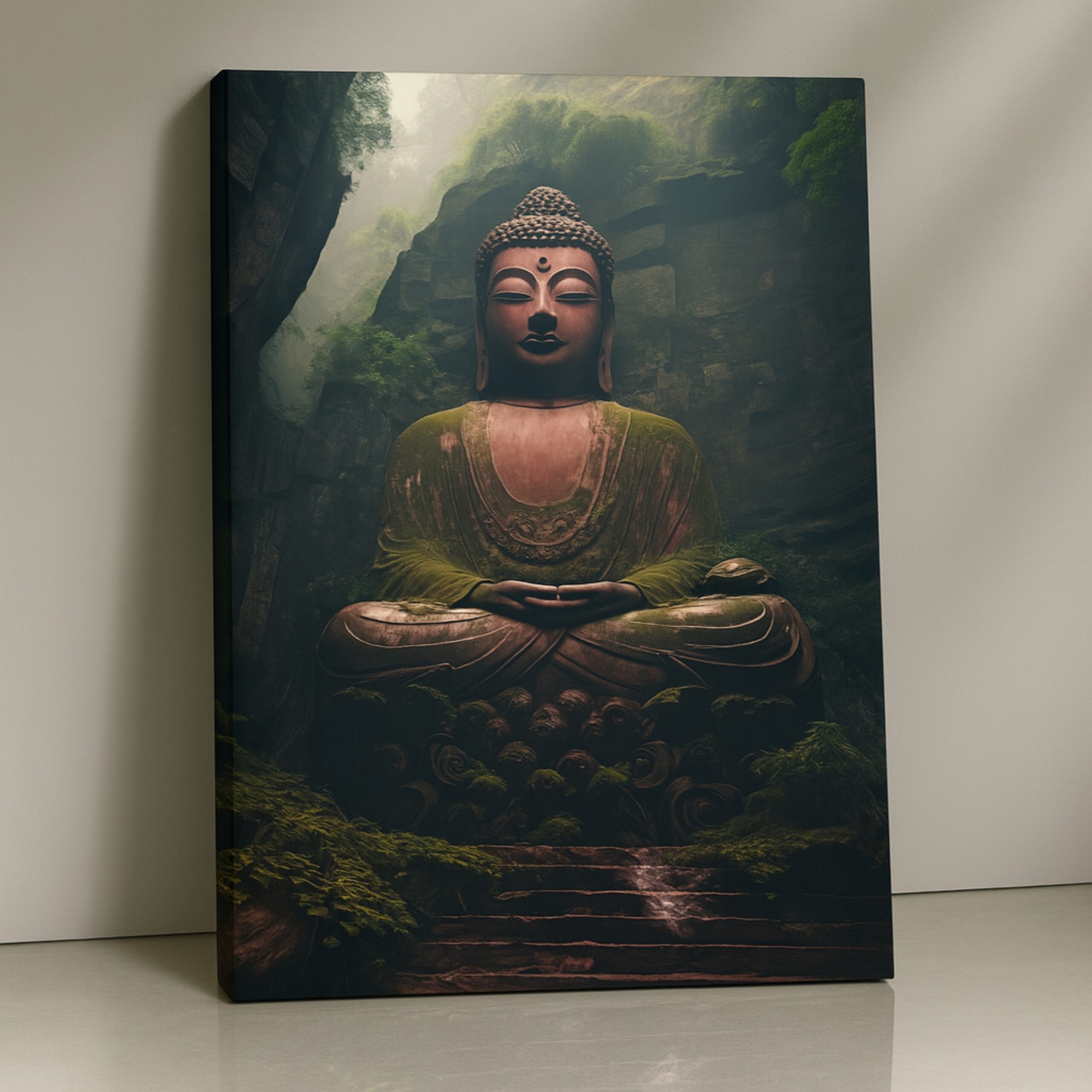 Buddha in a misty woodland, printed on premium stretched canvas with fade-resistant eco-friendly inks. Ready-to-hang.