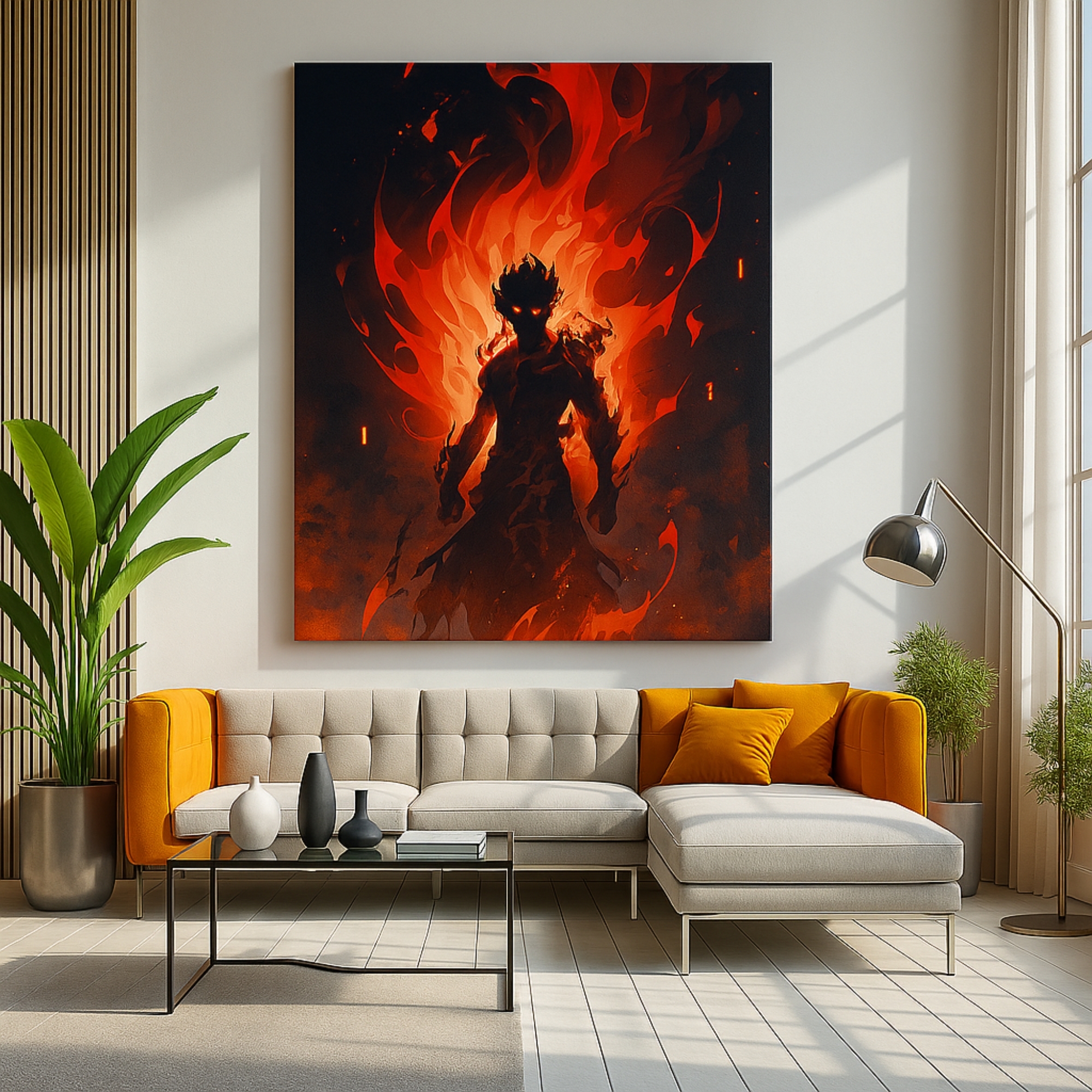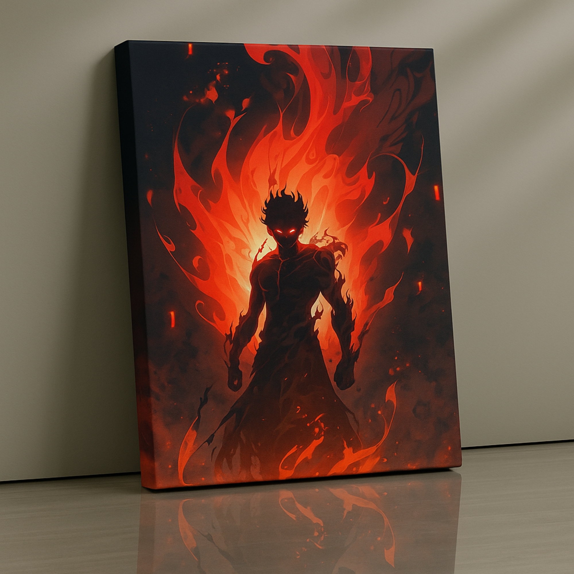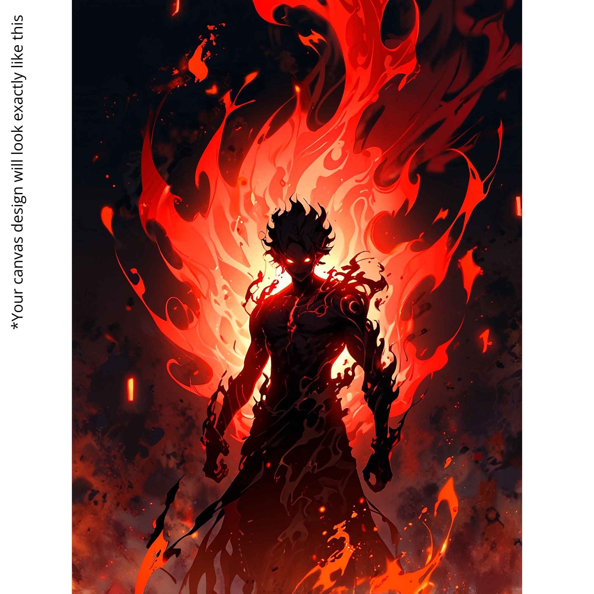 The Inferno Titan Canvas Print erupts with volcanic power as a molten humanoid warrior rises from blazing fire. This Explosive brushwork, glowing embers, and elemental heat make this an electrifying centerpiece for gaming rooms, anime walls, and bold contemporary décor, this canvas symbolizes strength, transformation, and unstoppable energy.