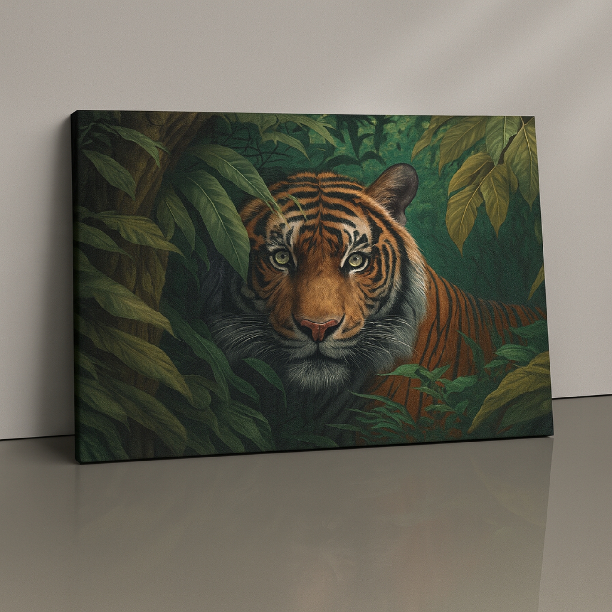 “The Jungle Ember canvas print portrays a majestic tiger surrounded by warm sunlit leaves and glowing forest tones. Rich orange highlights blend with deep greenery to symbolize courage, vitality, and wild natural beauty—ideal for earthy, modern, or adventure-themed interiors.