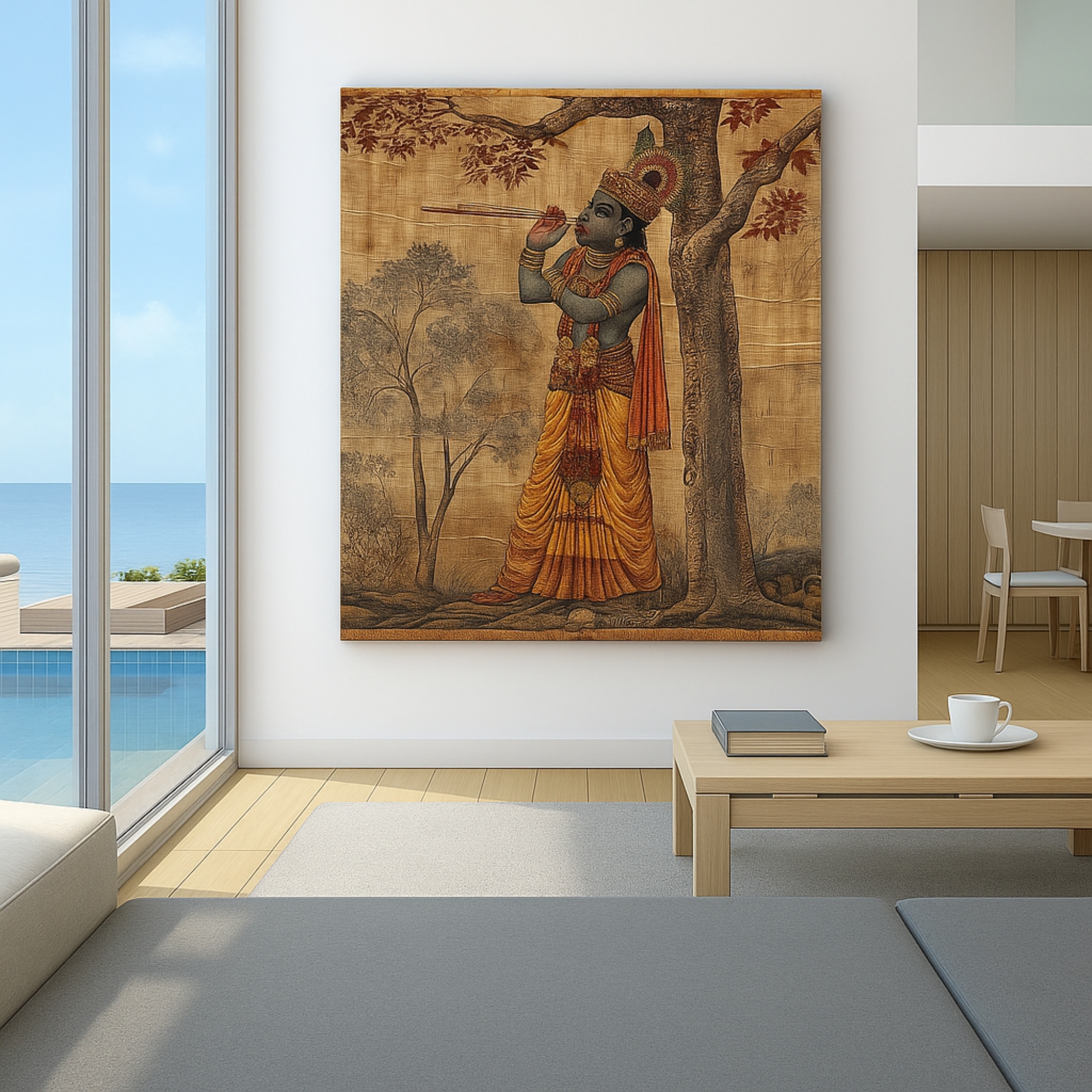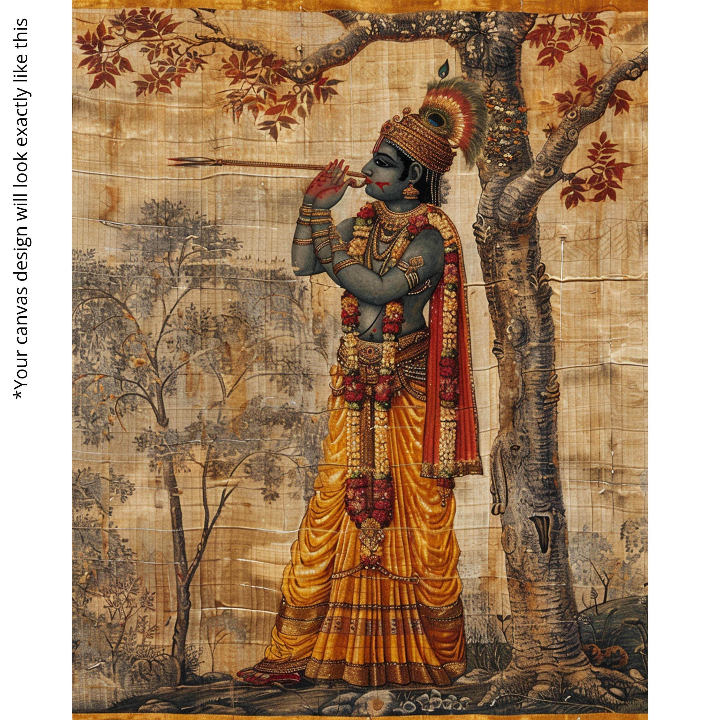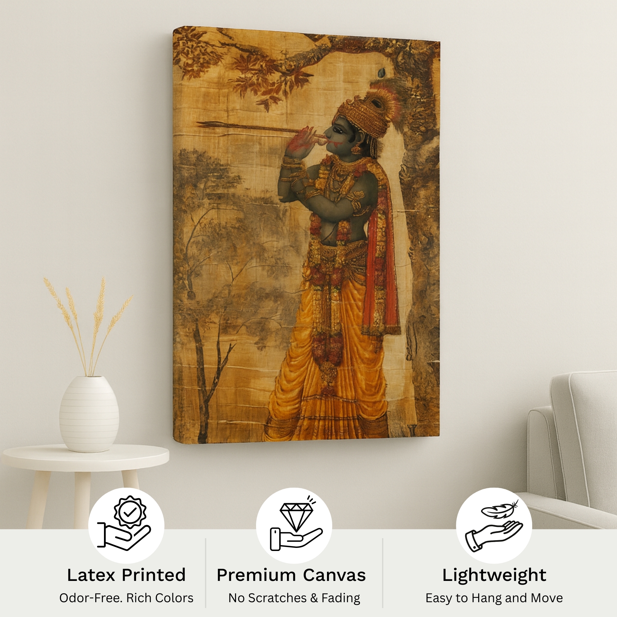The Krishna’s Melody Canvas Print captures Lord Krishna’s divine charm as he plays his flute beneath a sacred tree. His golden attire, ornaments, and serene expression radiate peace and devotion. This canvas print transforms interiors into sanctuaries of spirituality, embodying harmony and cultural richness. With soulful artistry, it bridges timeless tradition with modern wall décor.