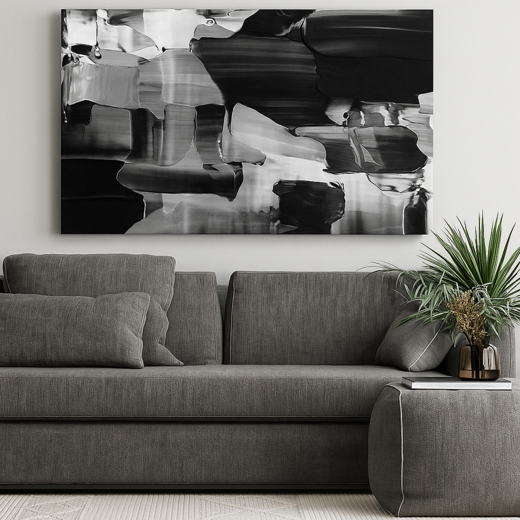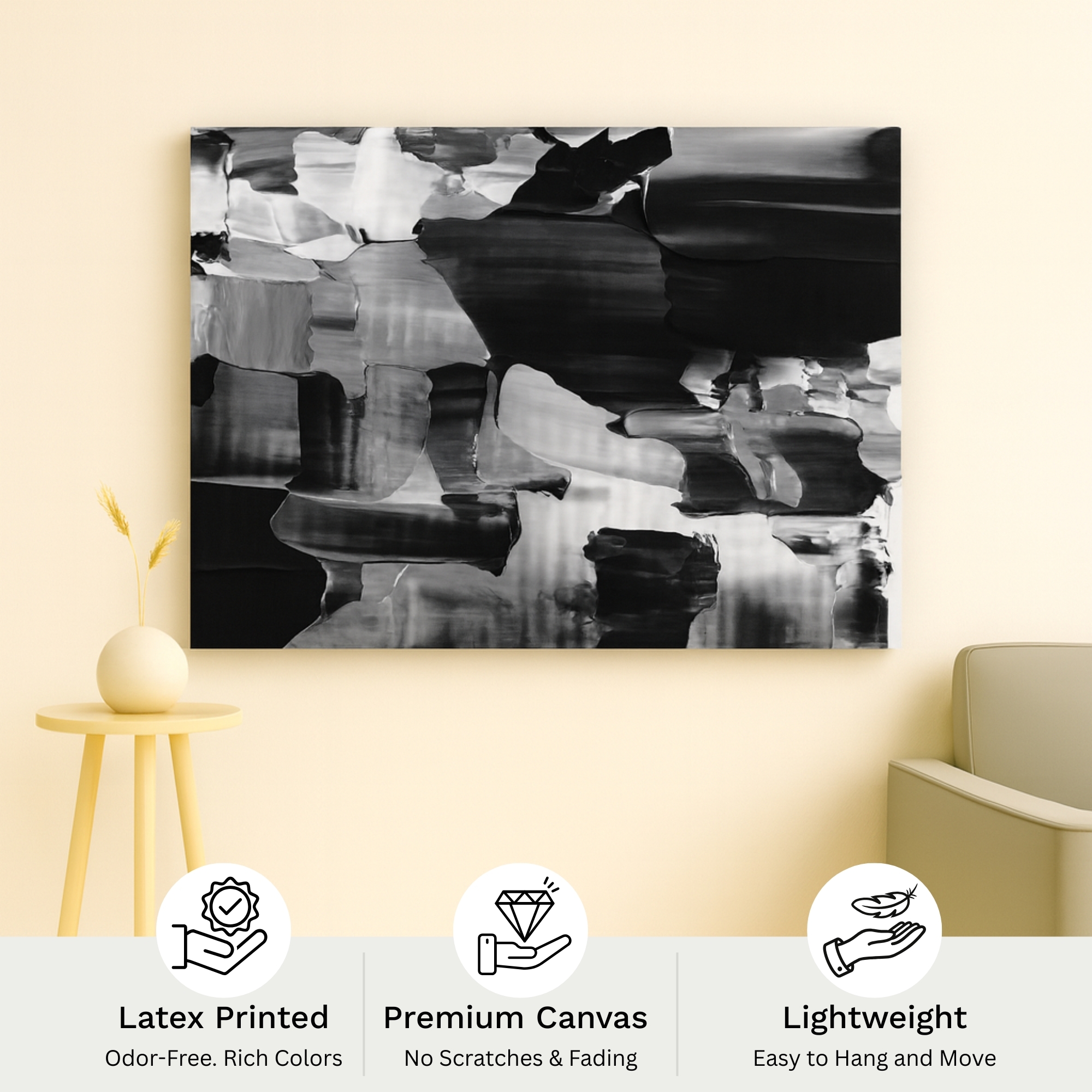 The Liquid Monochrome Drift canvas print blends smooth blacks, whites, and flowing abstract brush textures into a striking monochrome composition. Perfect for brightening living rooms, nurseries, creative corners, and home offices, this canvas print delivers warmth, balance, and high-end aesthetic appeal. Playful Echoes fits beautifully with pastel décor, Scandinavian themes, and modern abstract styling.