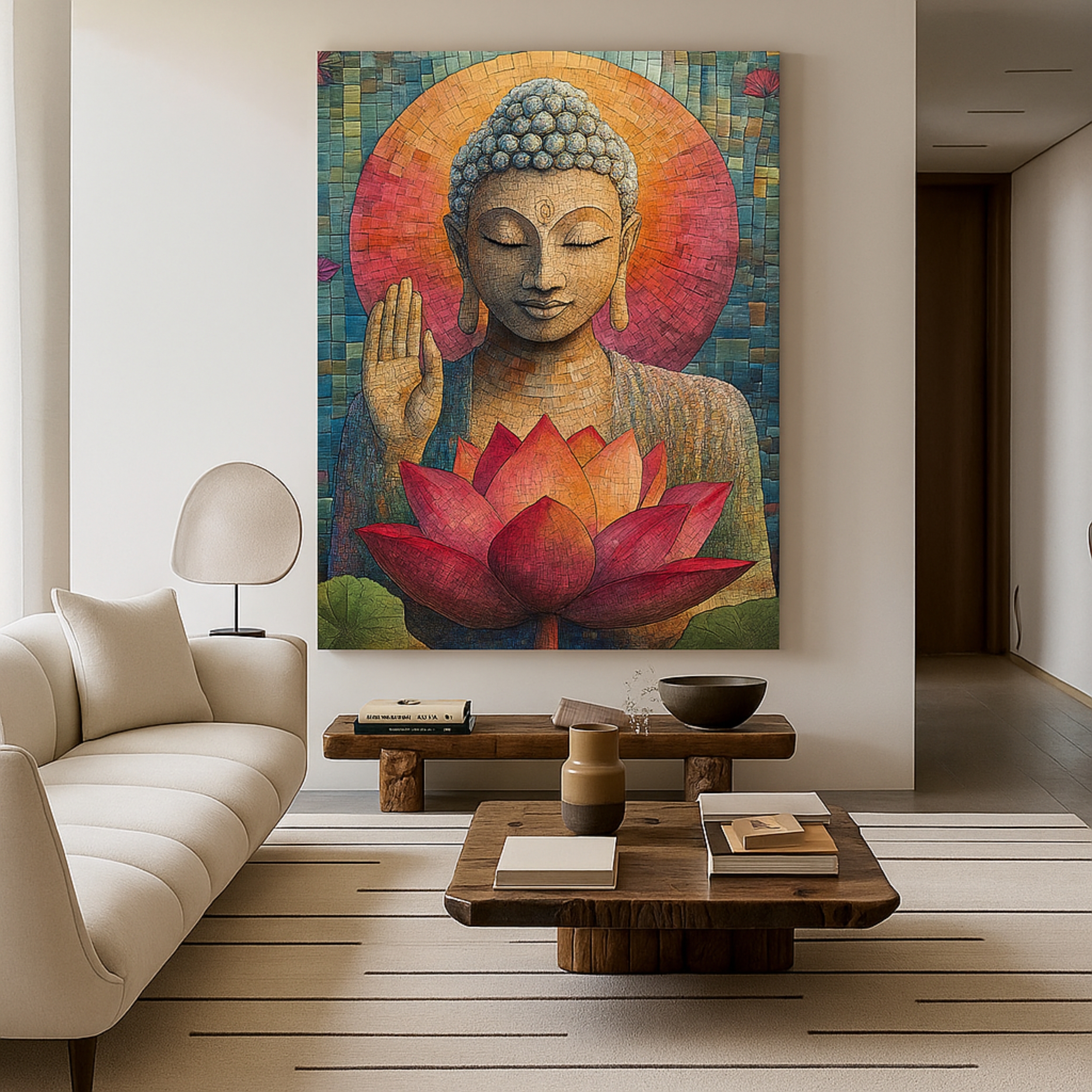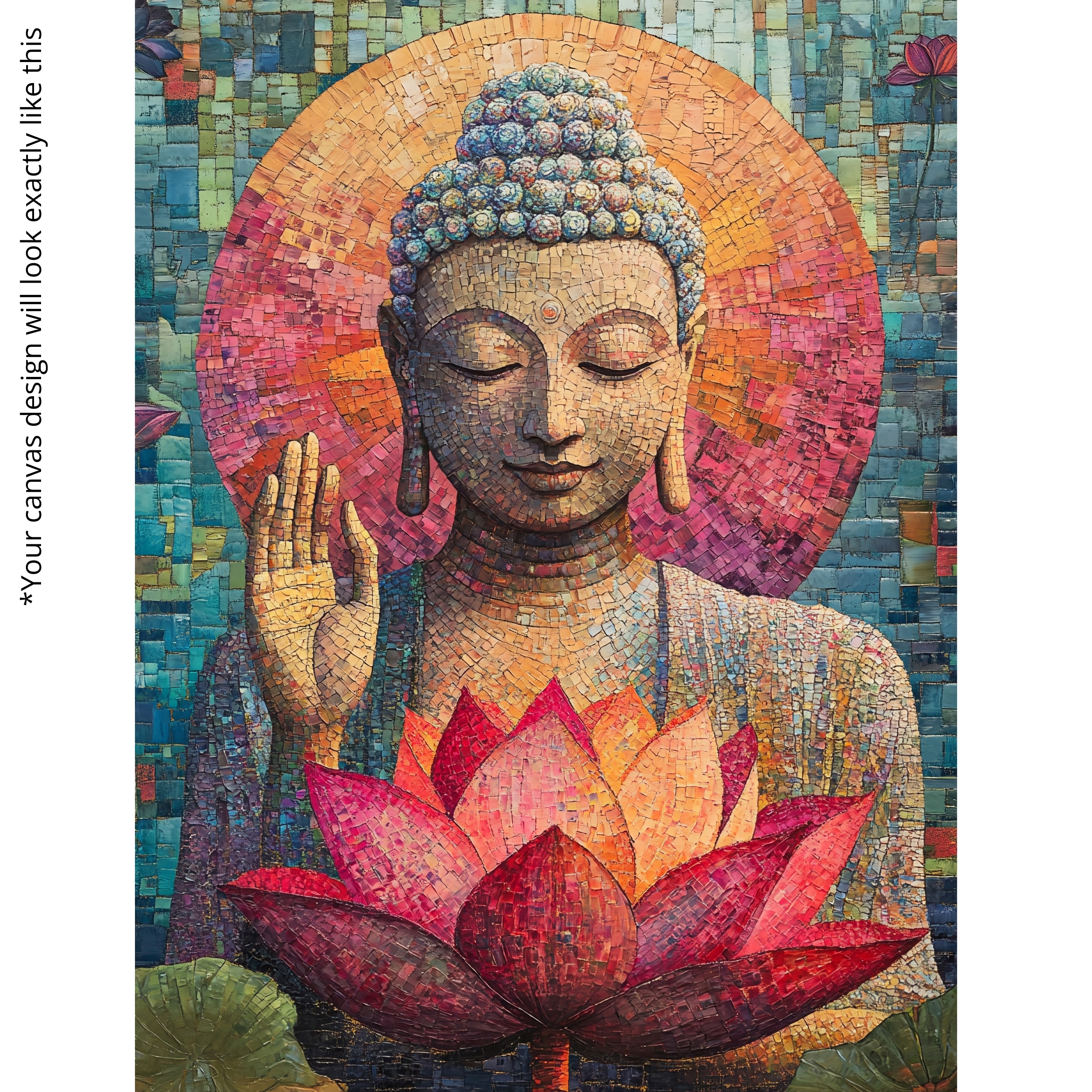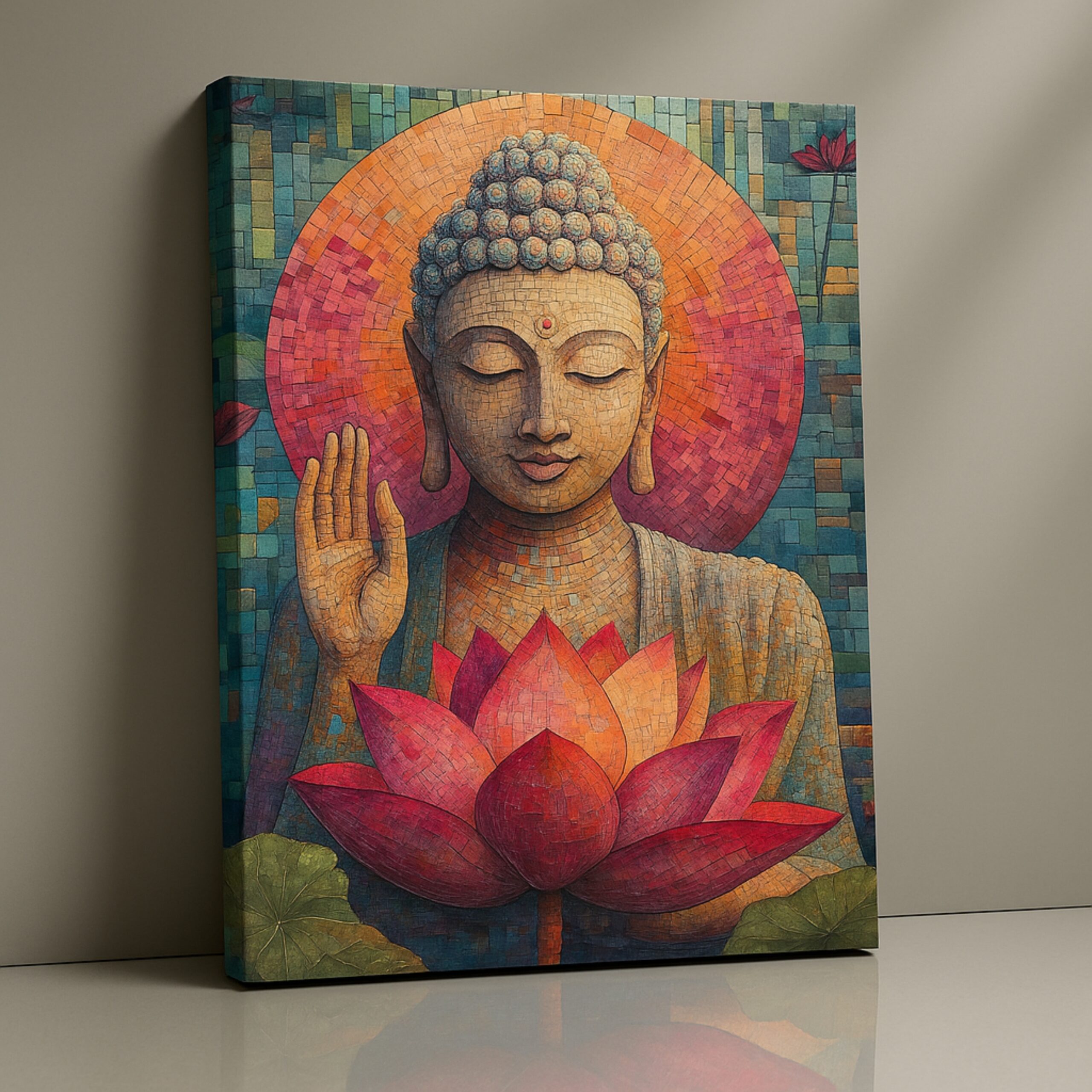 “Lotus Radiance” is an uplifting Buddha Canvas Print that glows with the compassionate presence of Buddha alongside a radiant lotus in bloom. Inspired by mosaic-like textures and sacred symbolism, this artwork reflects purity, enlightenment, and renewal. The warm golden palette and intricate detailing make it both decorative and deeply spiritual, perfect for mindful interiors.