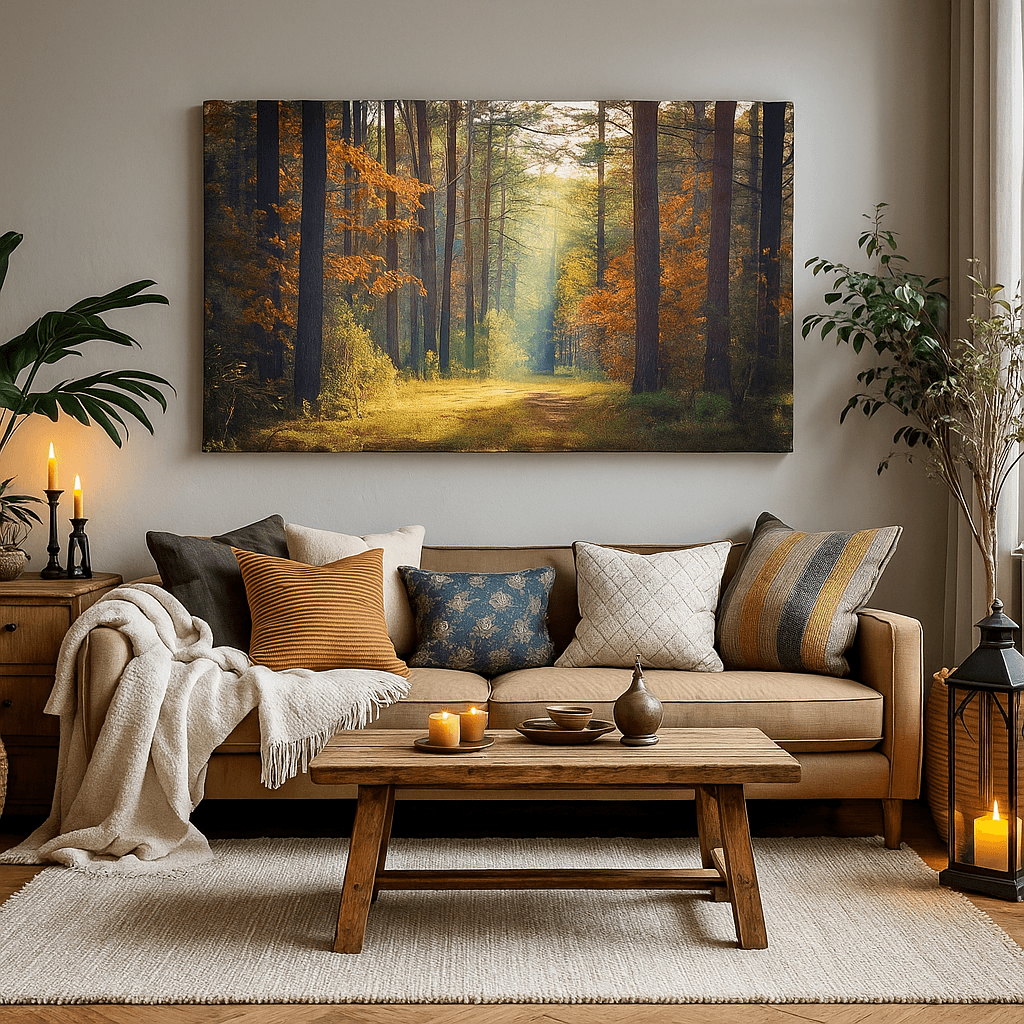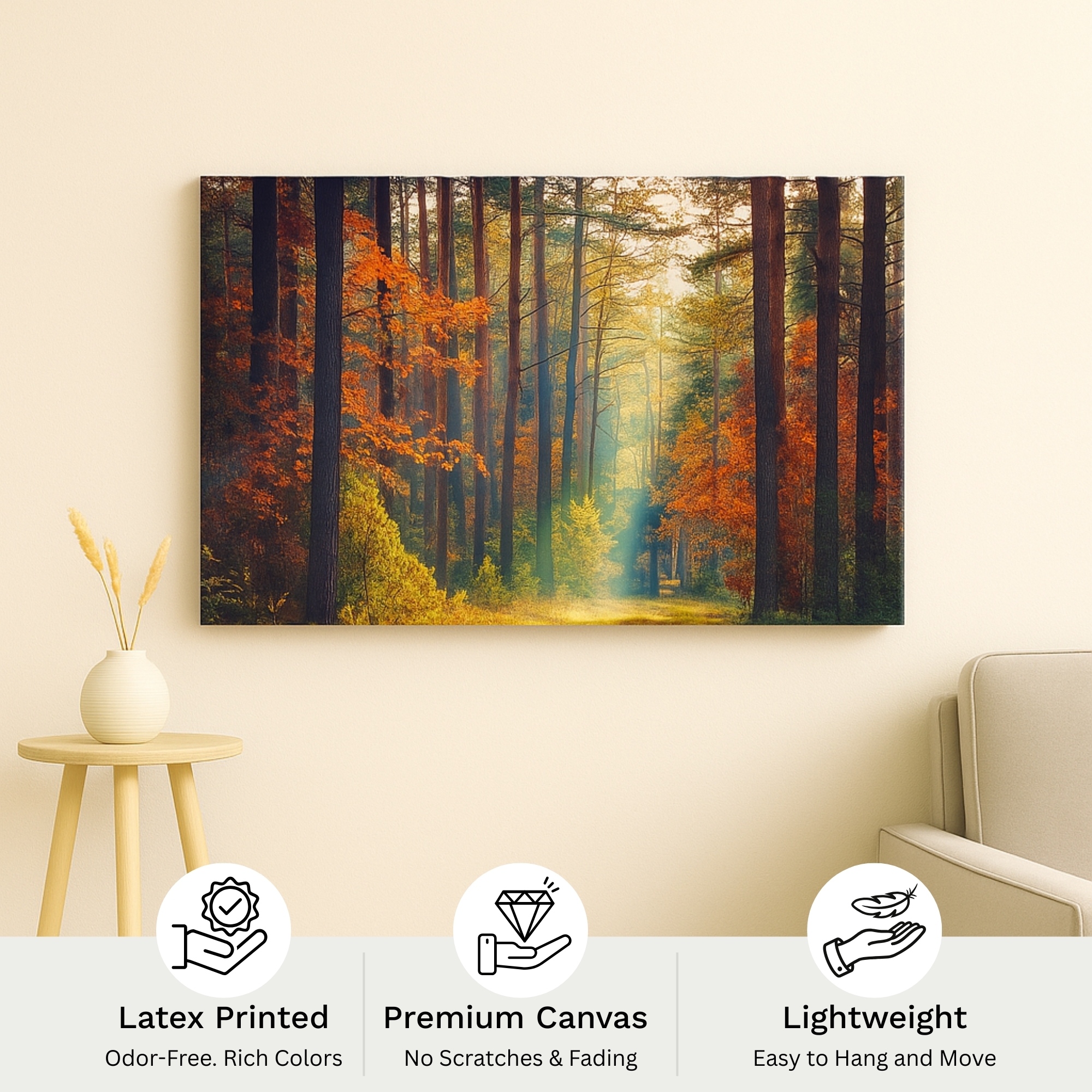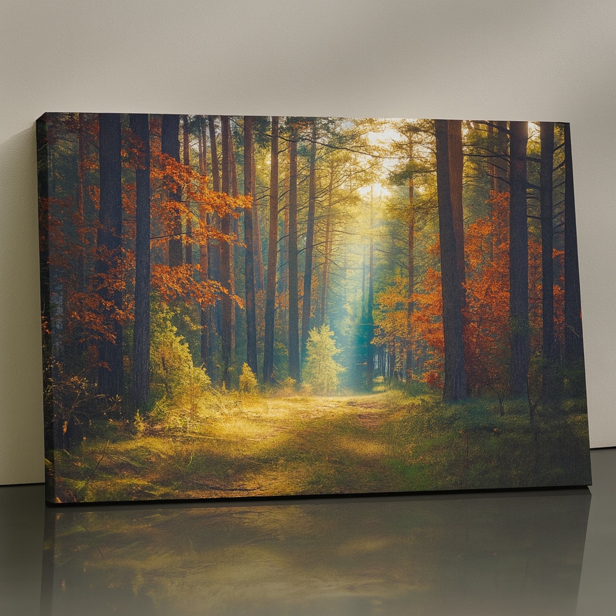 “Lumen Forest” Canvas Print captures golden light streaming through a woodland path, illuminating autumn leaves with warmth and serenity. Deep shadows and radiant highlights evoke calm reflection and timeless wonder—like stepping into harmony where the spirit finds grounding and inspiration.