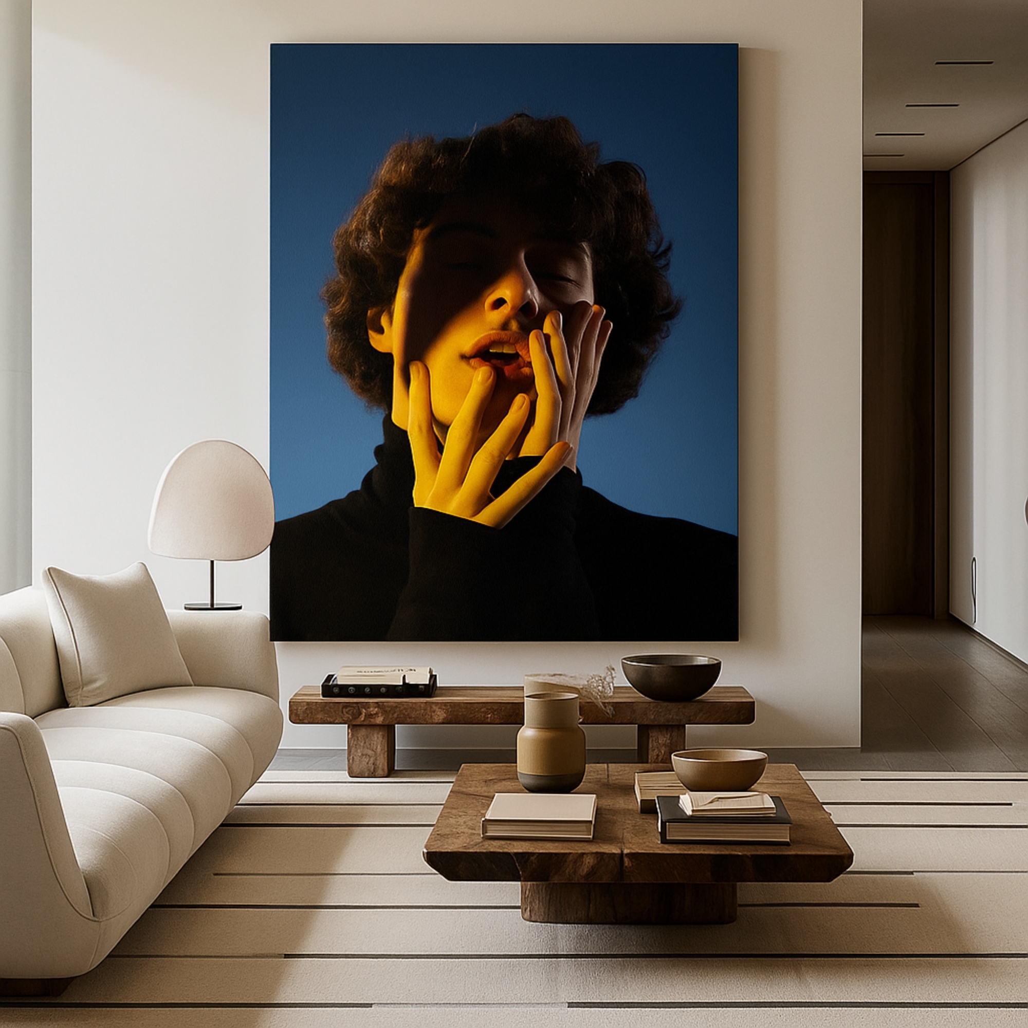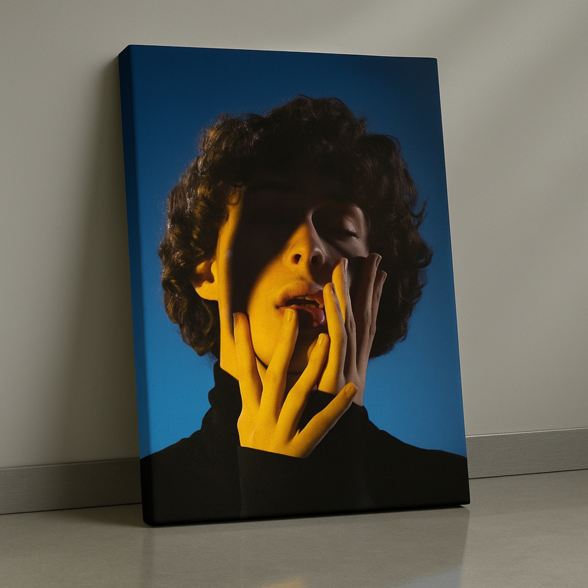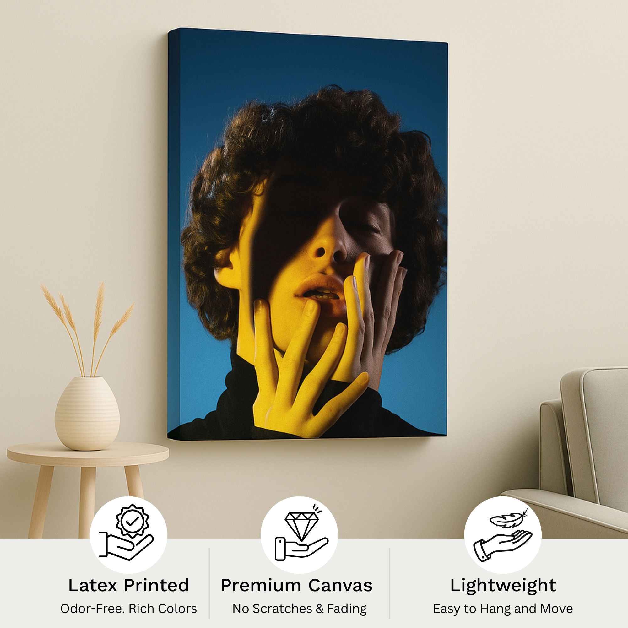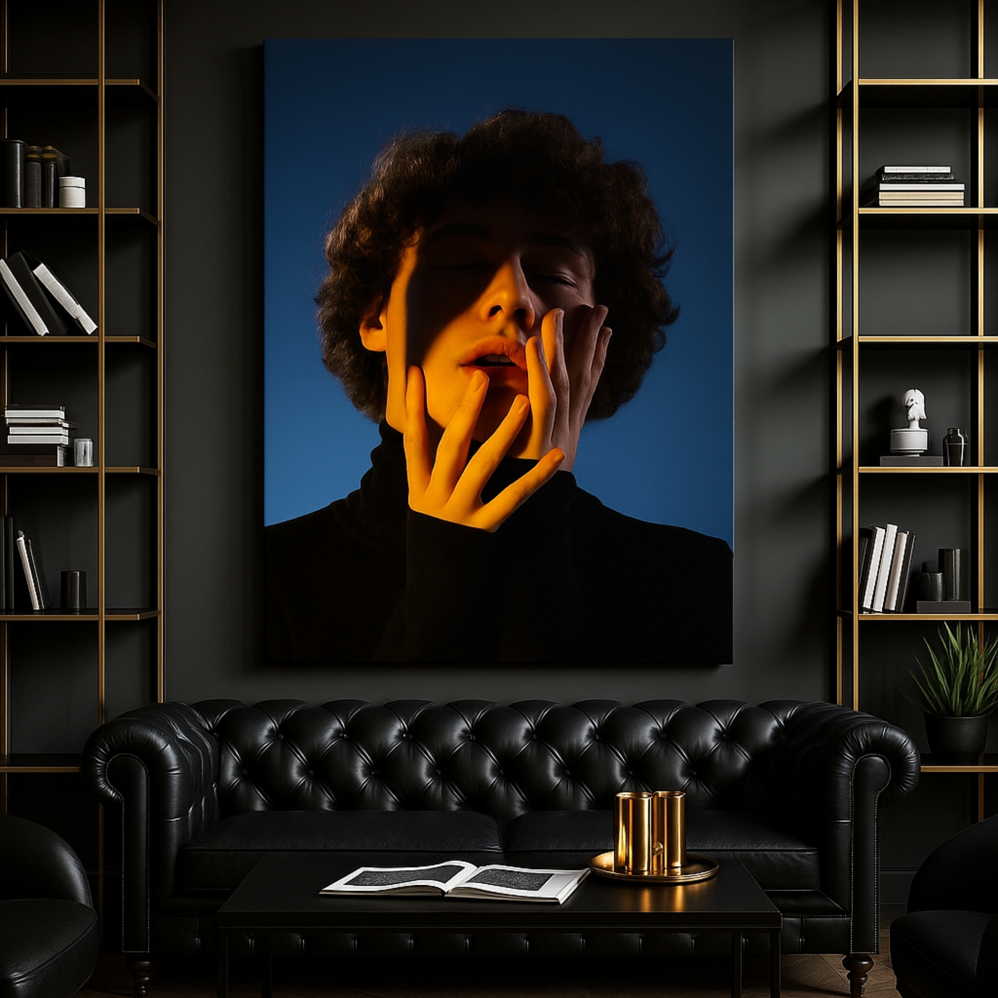 Luminous Reverie Canvas Print captures an expressive portrait illuminated by dramatic light and shadow. Warm highlights contrast deep tones, evoking emotion, vulnerability, and artistic depth. Perfect for modern bedrooms, galleries, and creative interiors that appreciate bold portrait storytelling.
