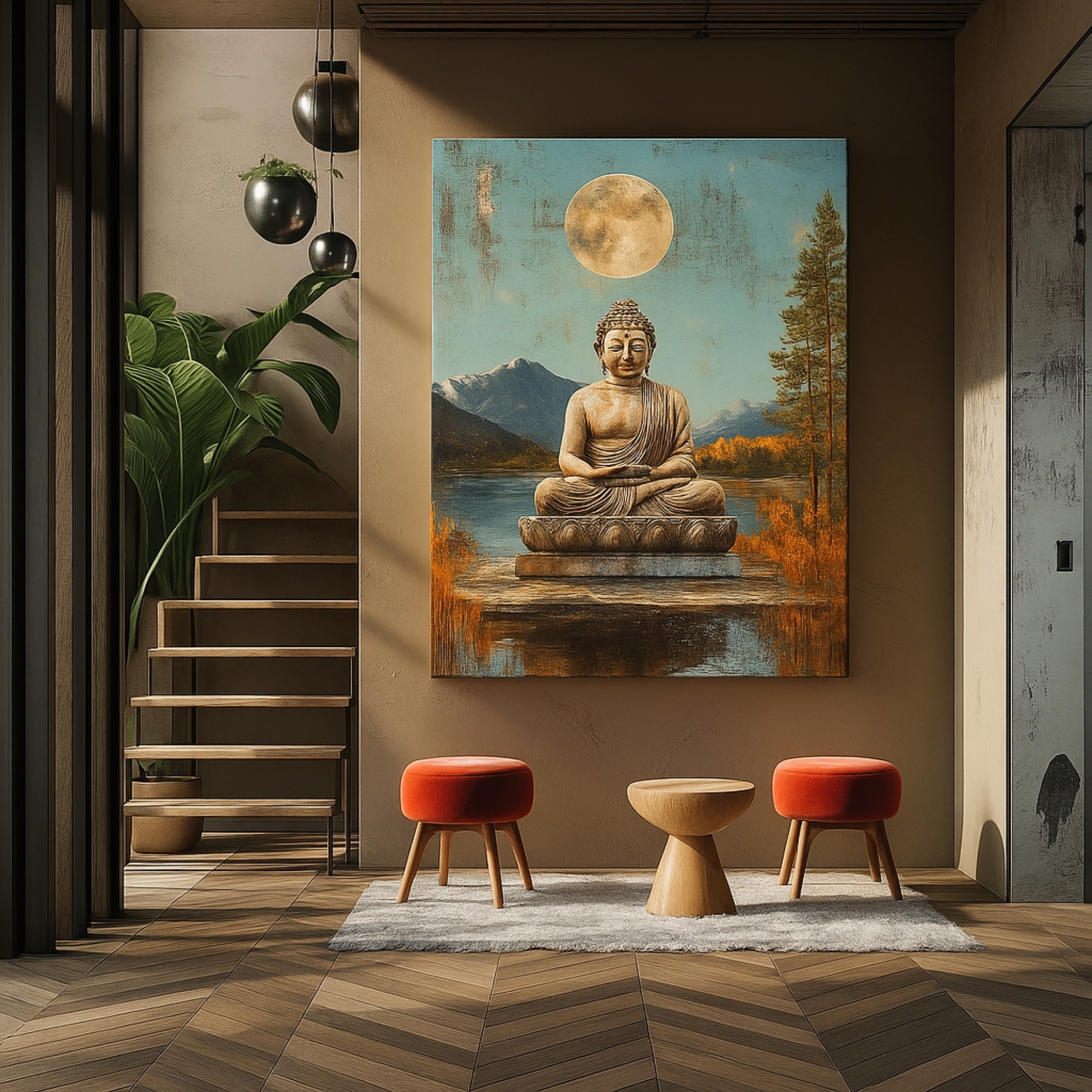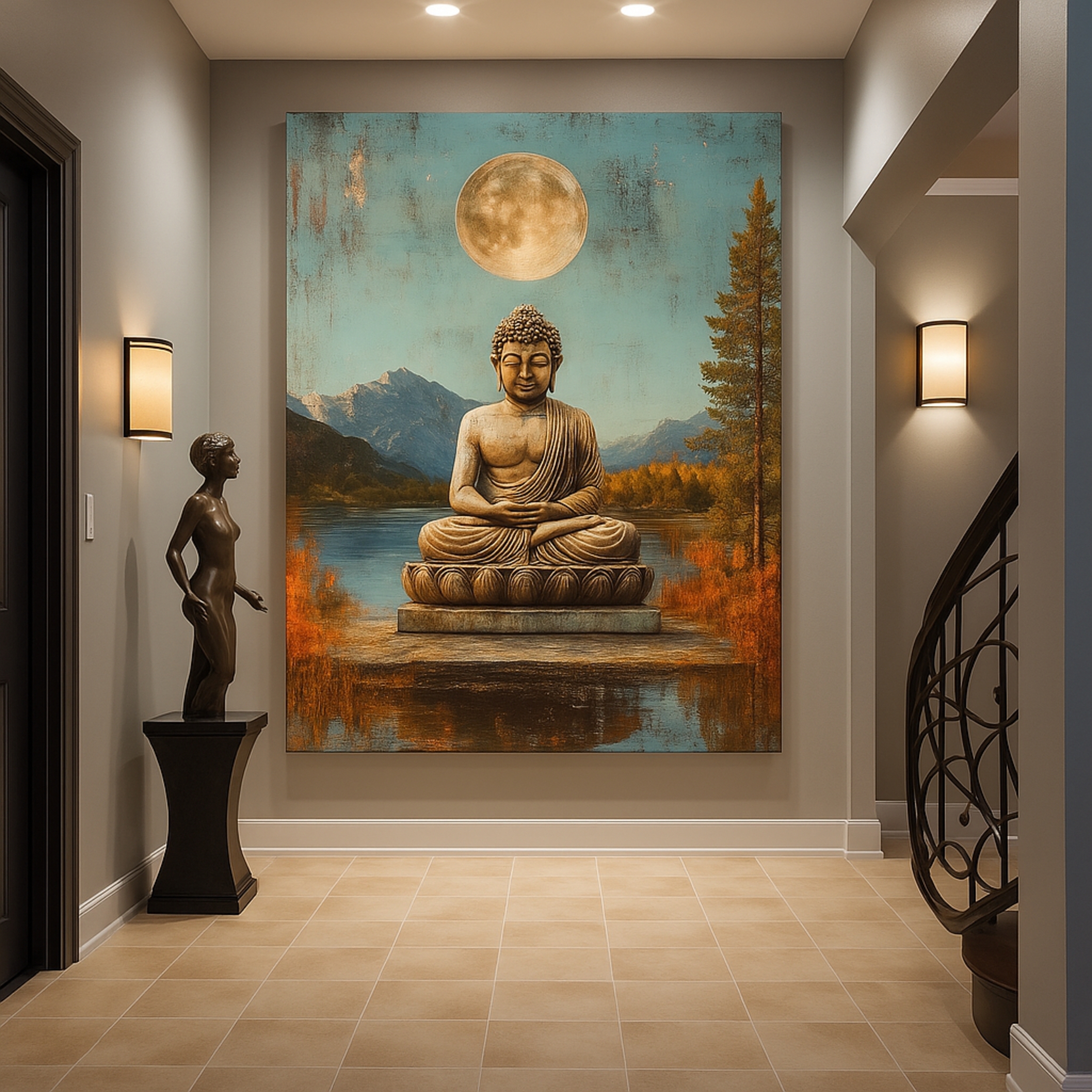 “Lunar Tranquility” is a meditative Buddha Canvas Print that unites moonlight, calm waters, and spiritual presence. With Buddha seated in reflection under a glowing moon by a serene lake, this artwork symbolizes divine guidance, clarity, and cosmic harmony. Its dreamy palette makes it ideal for bedrooms, meditation corners, and reflective interiors.